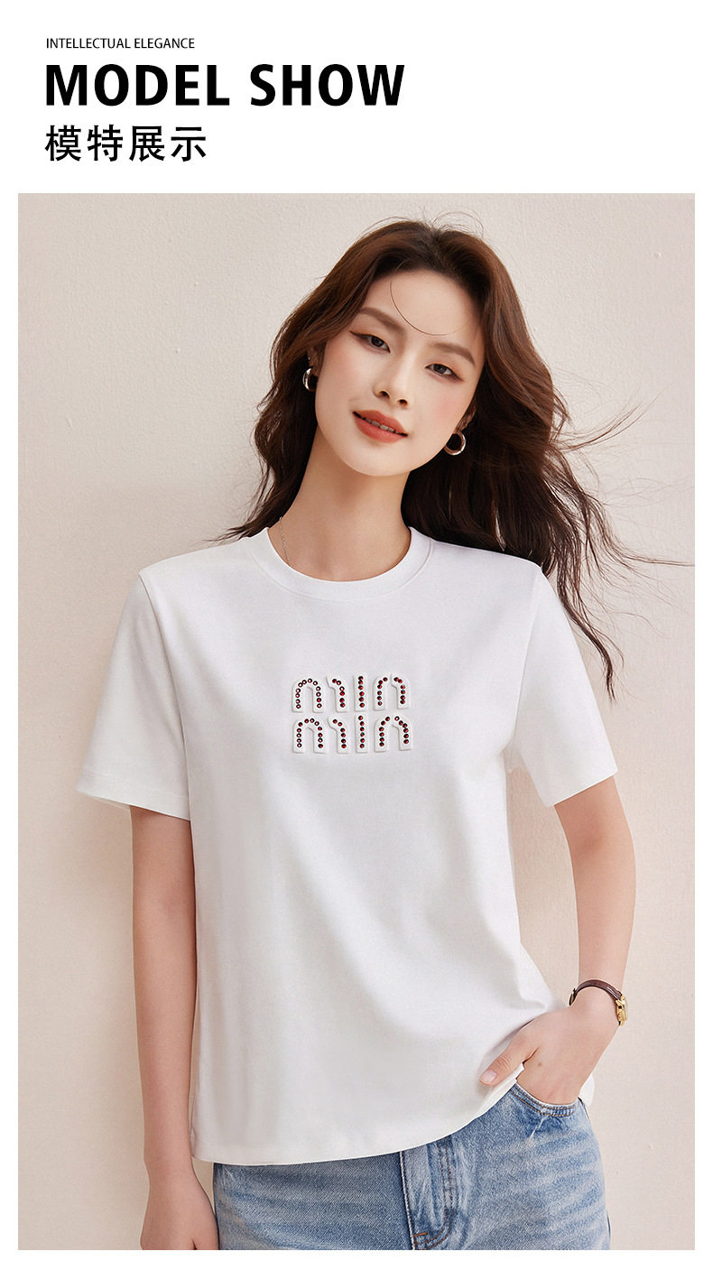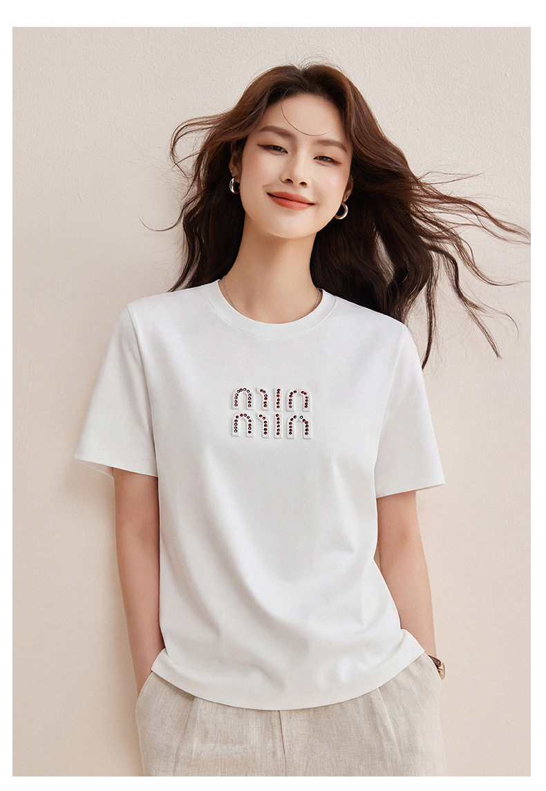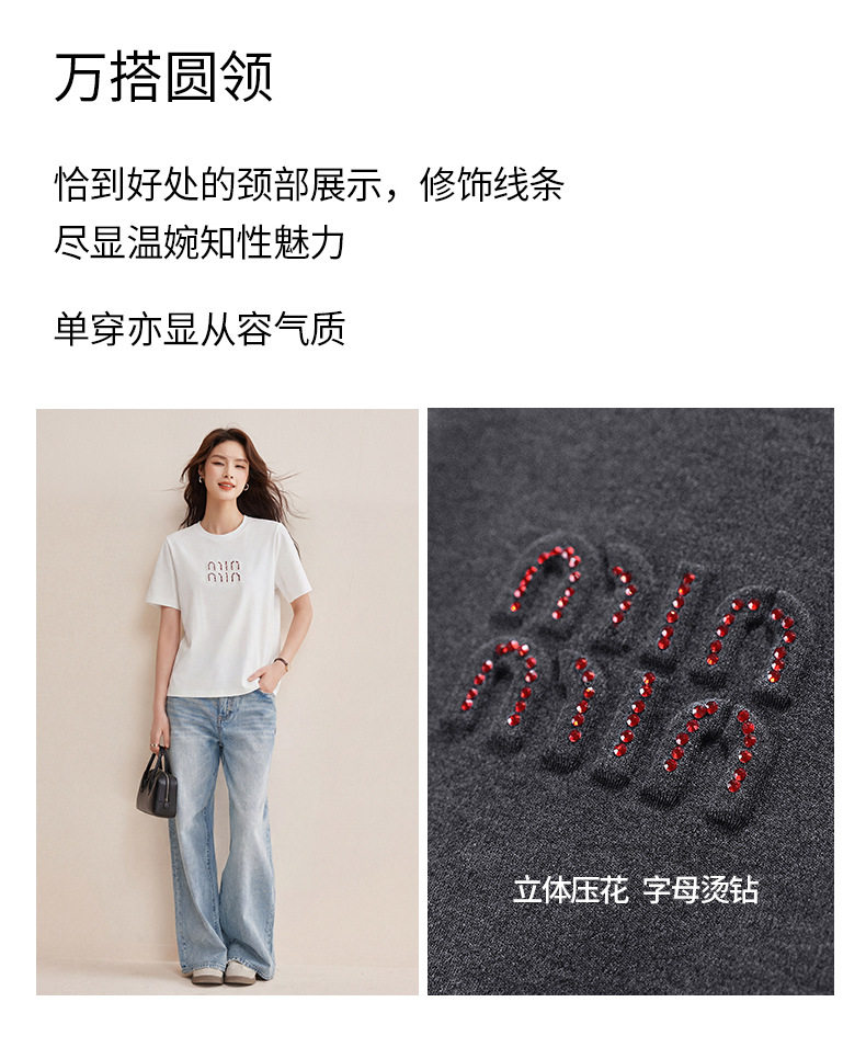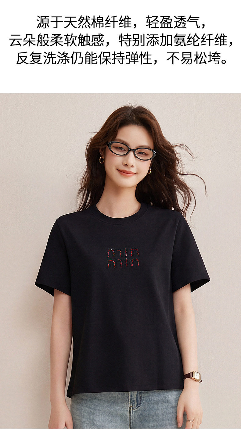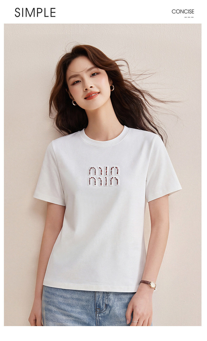 「自j」全新升级【铂金会员128/天猫169/差价41】(00741)洛诗琳新款休闲钻饰纯棉T恤2026春夏正肩字母设计短袖上衣