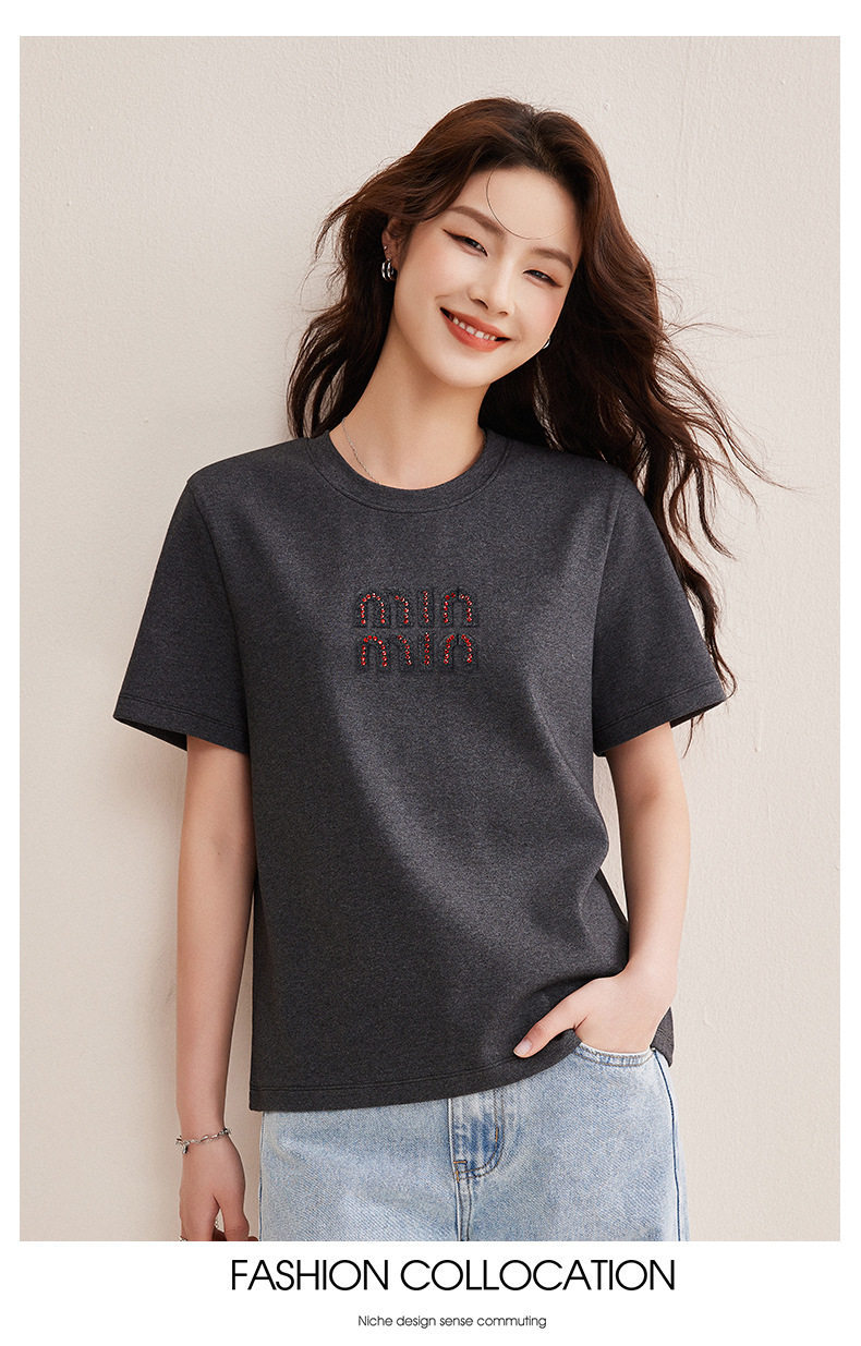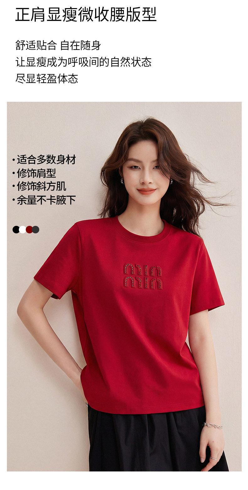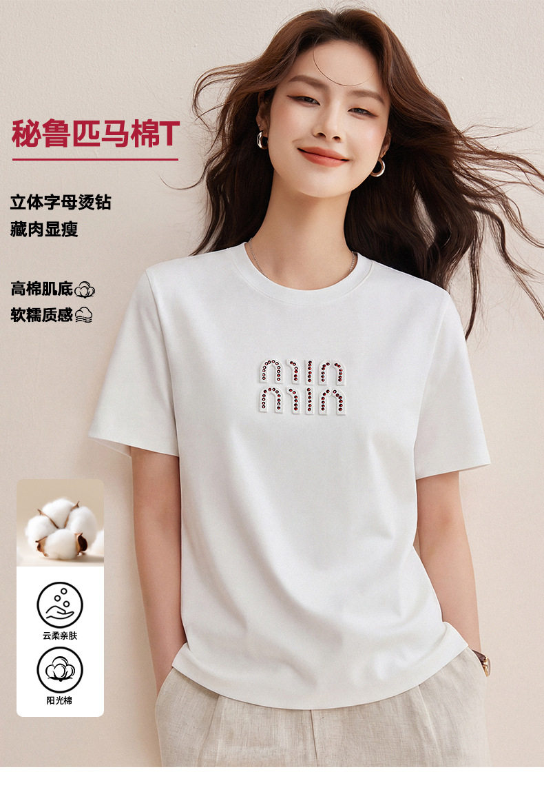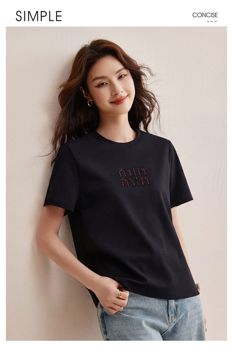 「自j」全新升级【铂金会员128/天猫169/差价41】(00741)洛诗琳新款休闲钻饰纯棉T恤2026春夏正肩字母设计短袖上衣