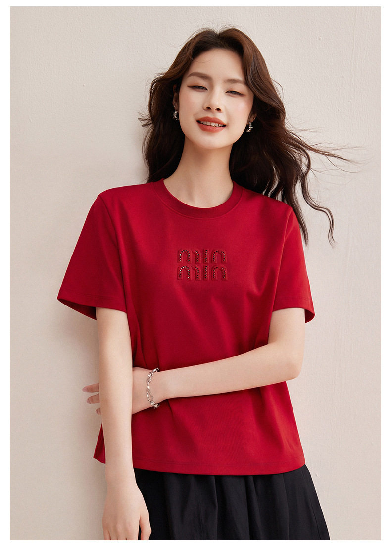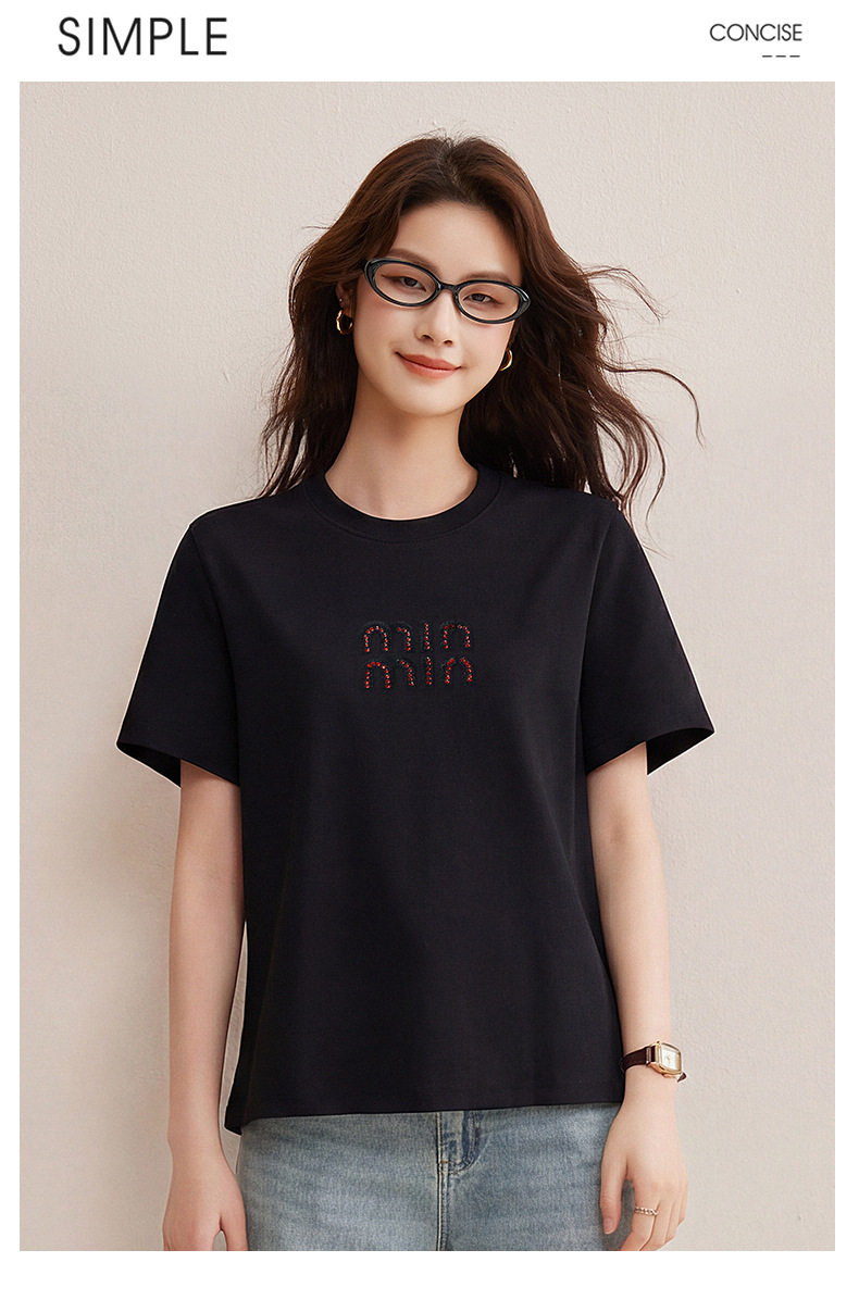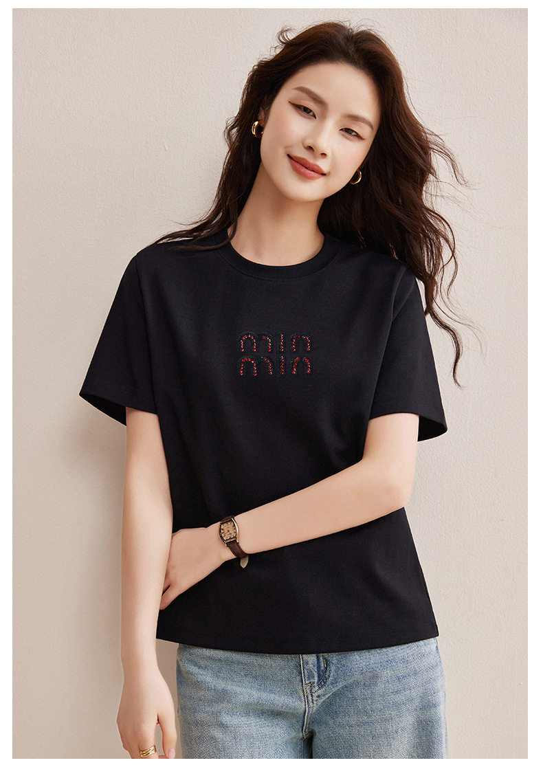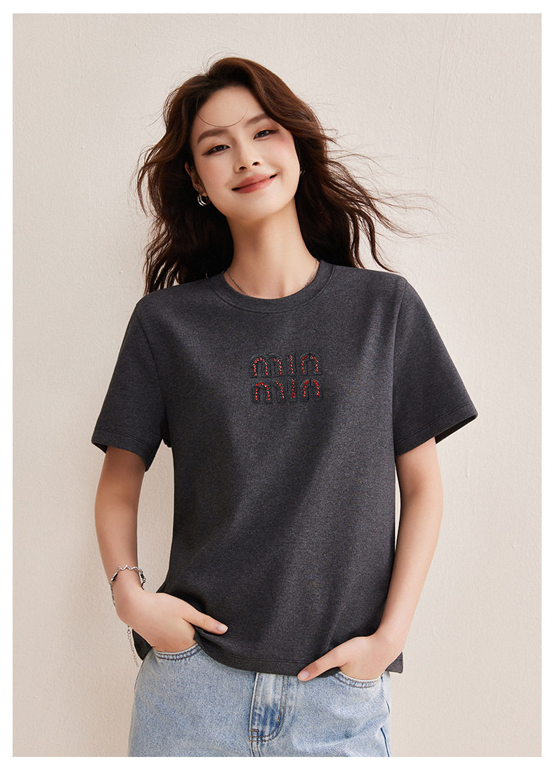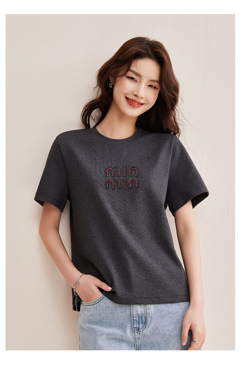 「自j」全新升级【铂金会员128/天猫169/差价41】(00741)洛诗琳新款休闲钻饰纯棉T恤2026春夏正肩字母设计短袖上衣