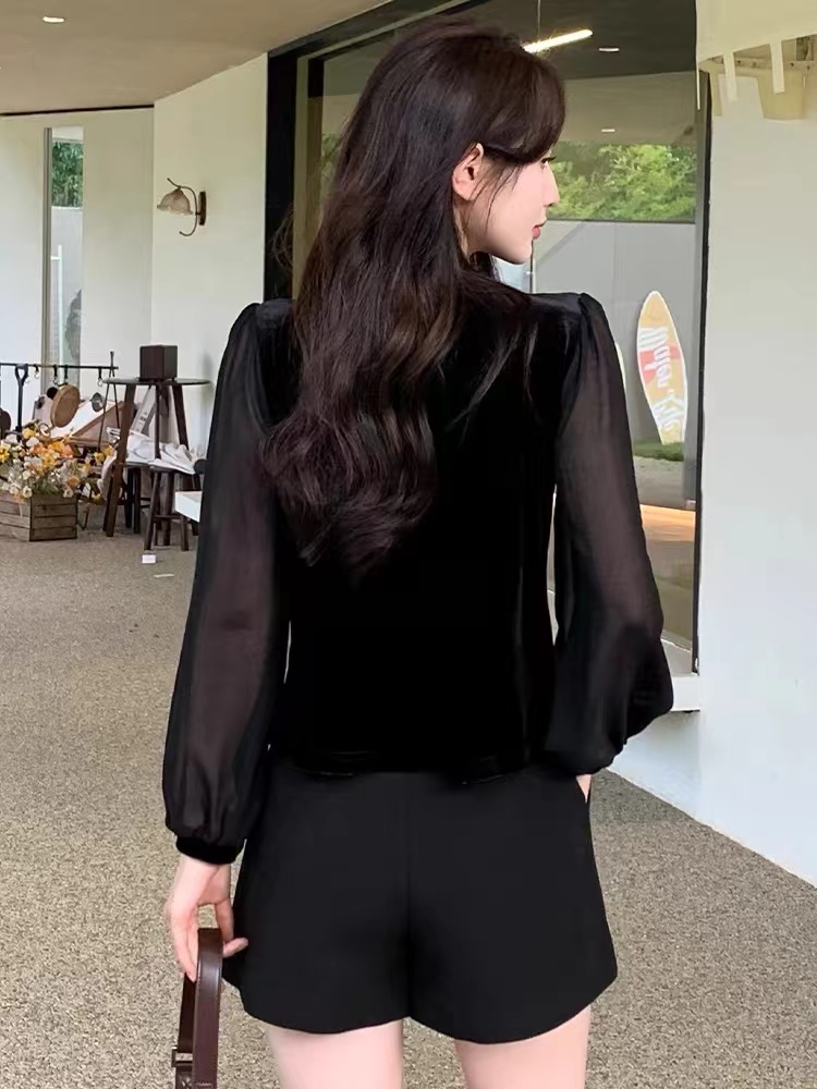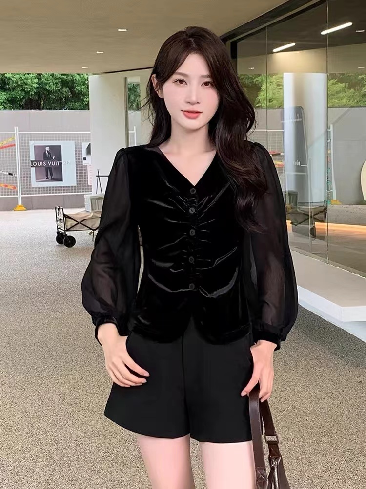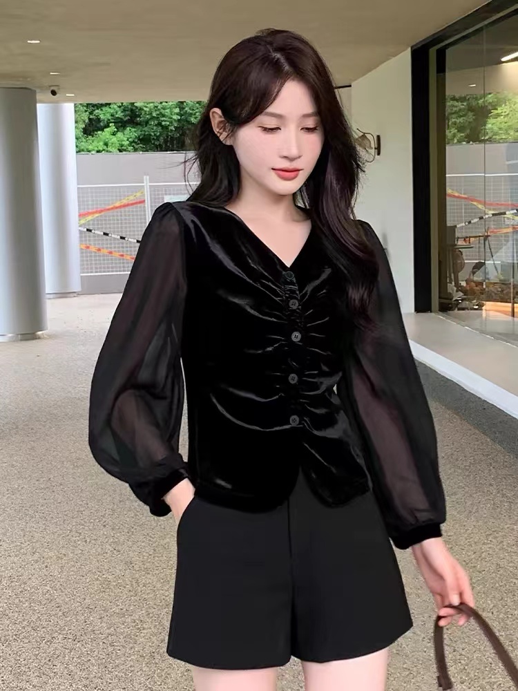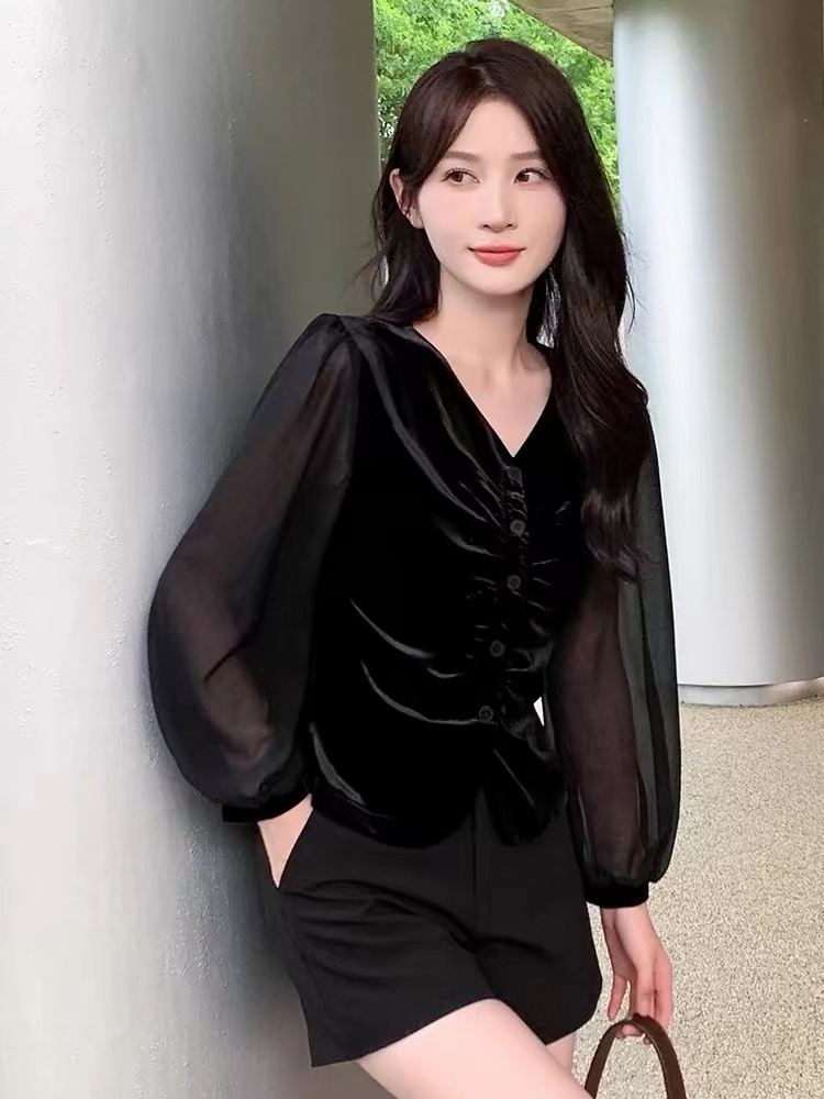 好看的哦~5223褶皱金丝绒拼纱袖小衫上衣-喜出