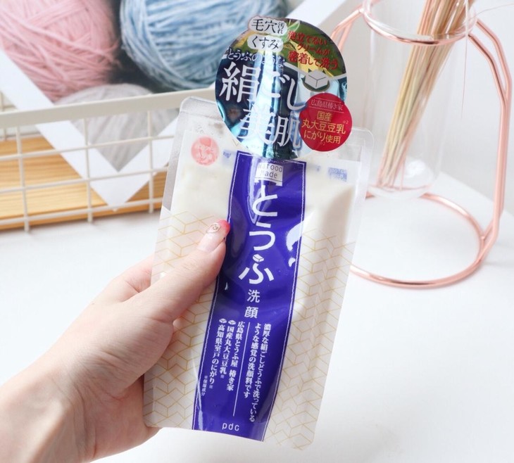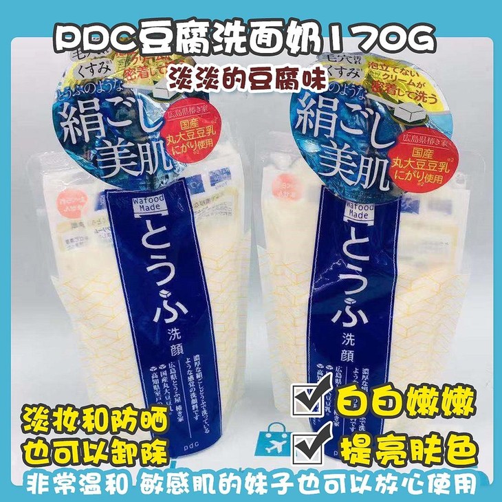 PDC豆腐洗面奶170g👍这款豆腐洁面乳,看着真的像一袋豆浆有木有😛!相比一般的洗面奶,这款豆腐洁面泡沫少一点☁,如果喜欢丰富泡沫的宝宝,需要用起泡网配合哦〰淡淡的豆腐味🌬,洗完也会觉得自己的脸蛋像小豆腐一样😊~说到豆腐,自古以来豆腐都有亮白✨的效果,所以长期使用也会觉得皮肤变得白白嫩嫩的💦,洗脸洗出来的透白感💓。洗完真的一点也不干,淡妆和防晒也可以卸除✅,非常温和,敏感肌的妹子也可以放心使用