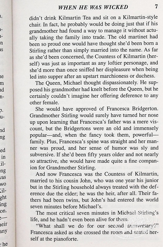 For Michael Stirling, London's most infamous bachelor, that moment came the first time he laid eyes on Francesca Bridgerton. After a lifetime of chasing women, of smiling slyly as they chased him, of allowing himself to be caught but never permitting his heart to become engaged, he took one look at Francesca Bridgerton and fell so fast and hard into love it was a wonder he managed to remain standing. Unfortunately for Michael, however, Francesca's surname was to remain Bridgerton for only a mere thirty-six hours longer - the occasion of their meeting was, lamentably, a supper celebrating her imminent wedding to his cousin.