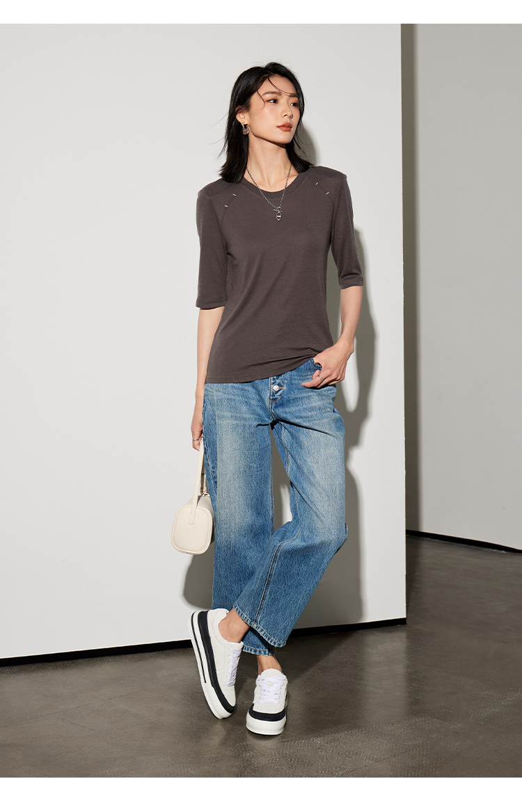 Lilymoon 春夏圆领正肩绣花短袖T恤莫代尔桑蚕丝休闲刺绣LM2418---现货