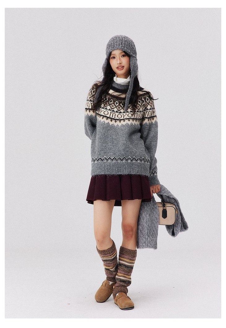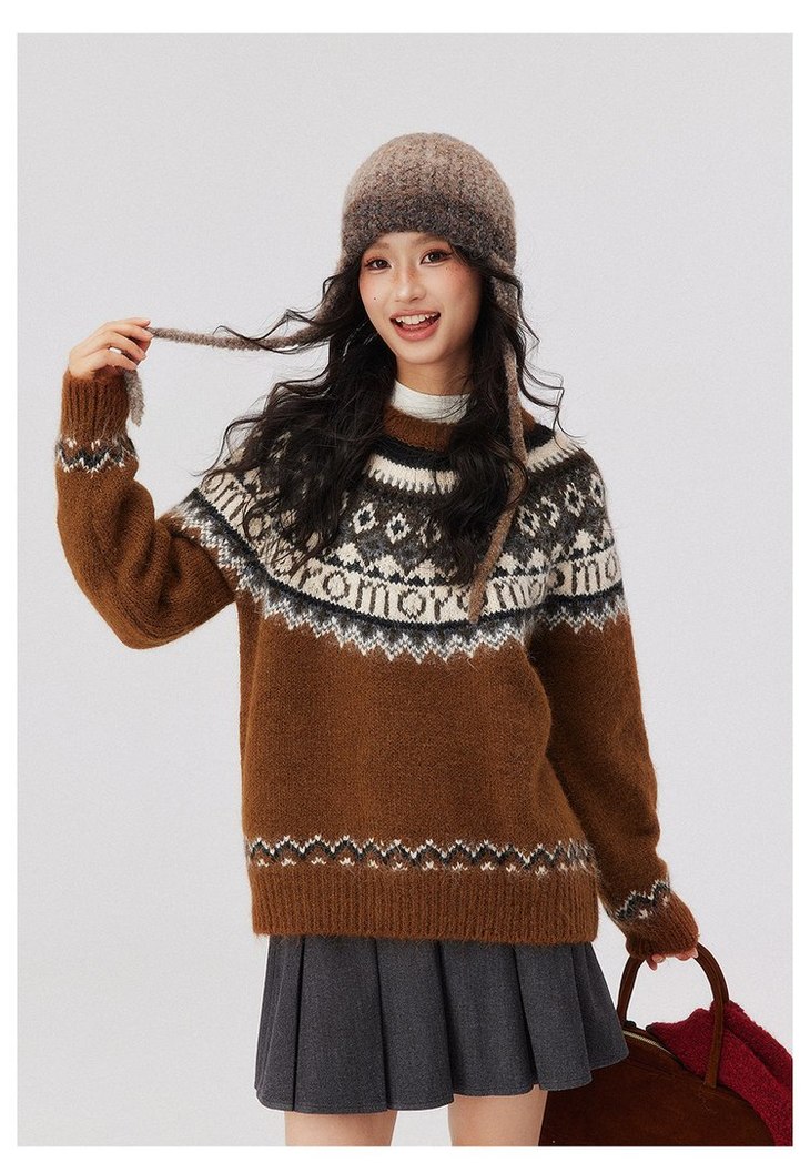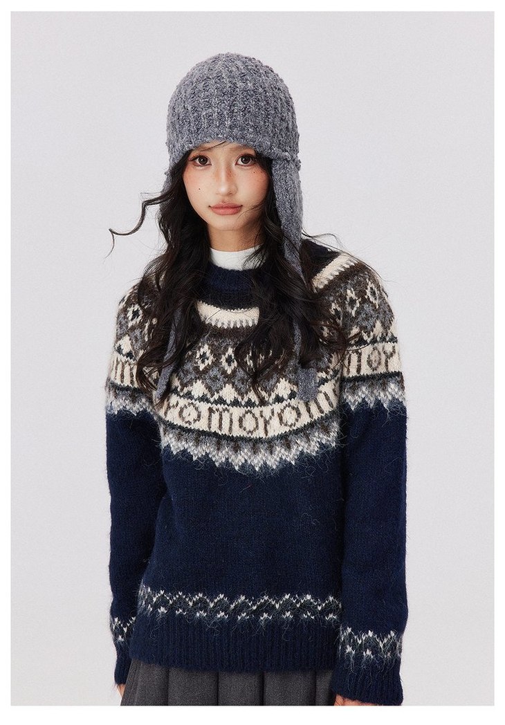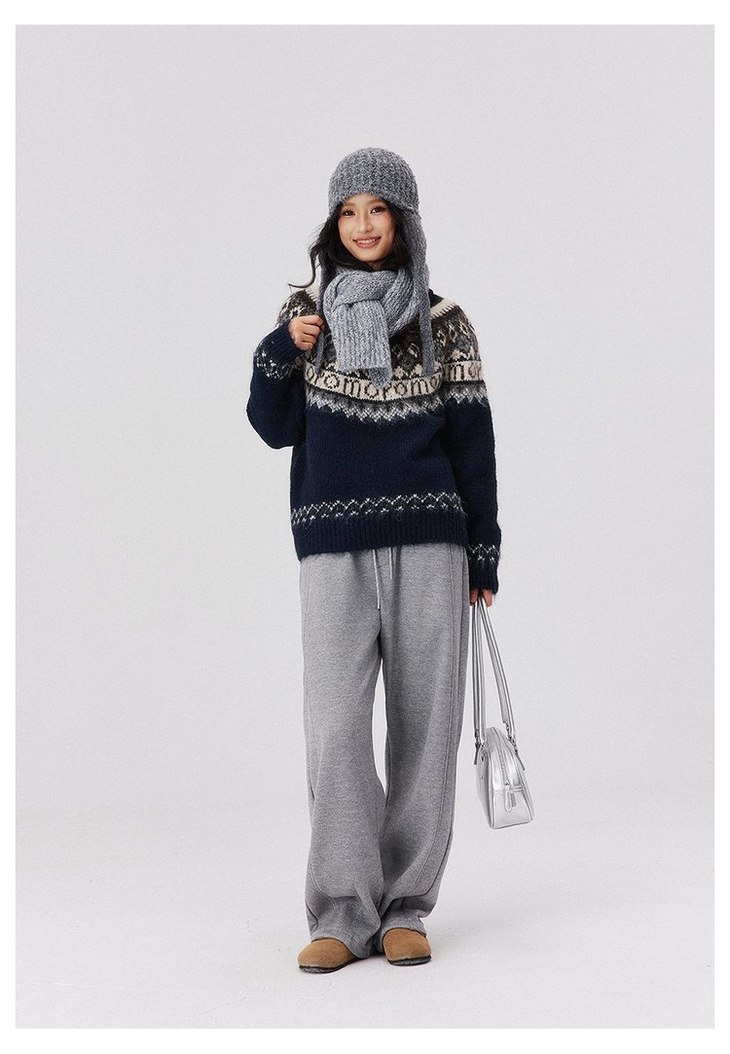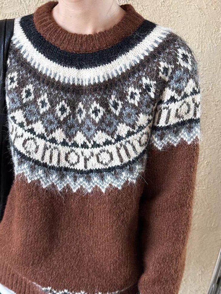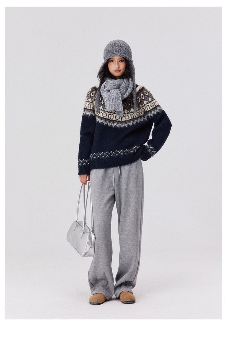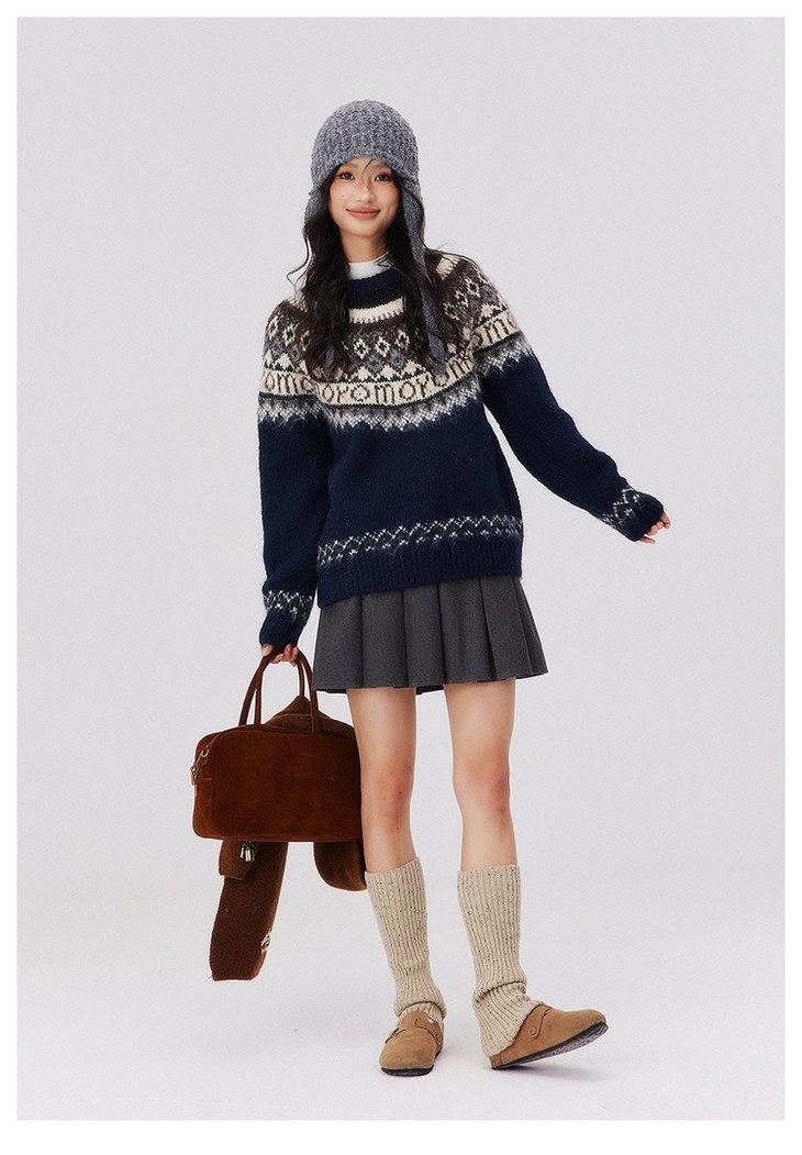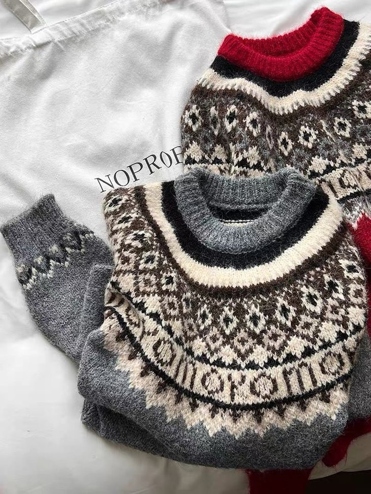 北欧风费尔岛菱形字母提花针织套头毛衣:J1060