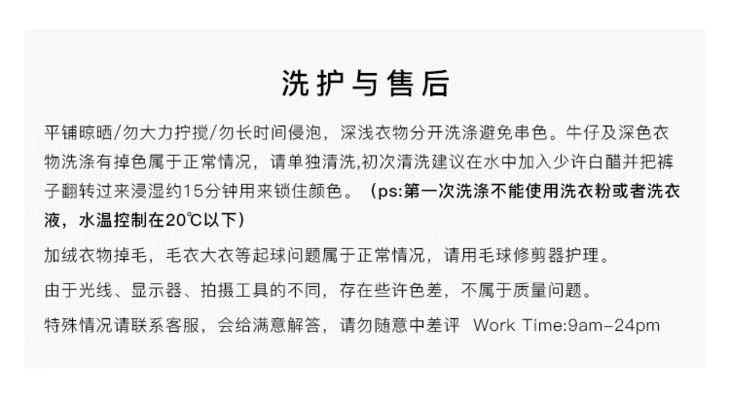 不影响二次销售,支持七天无理由退换货;一经下水,弄脏,使用过久,不再售后;商品签收后,如有质量问题,7天内提交售后,超过7天的任何售后概不处理! (ps:灯光滤镜原因会有少许色差,介意者慎拍)