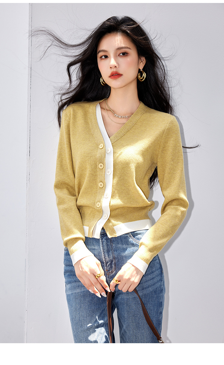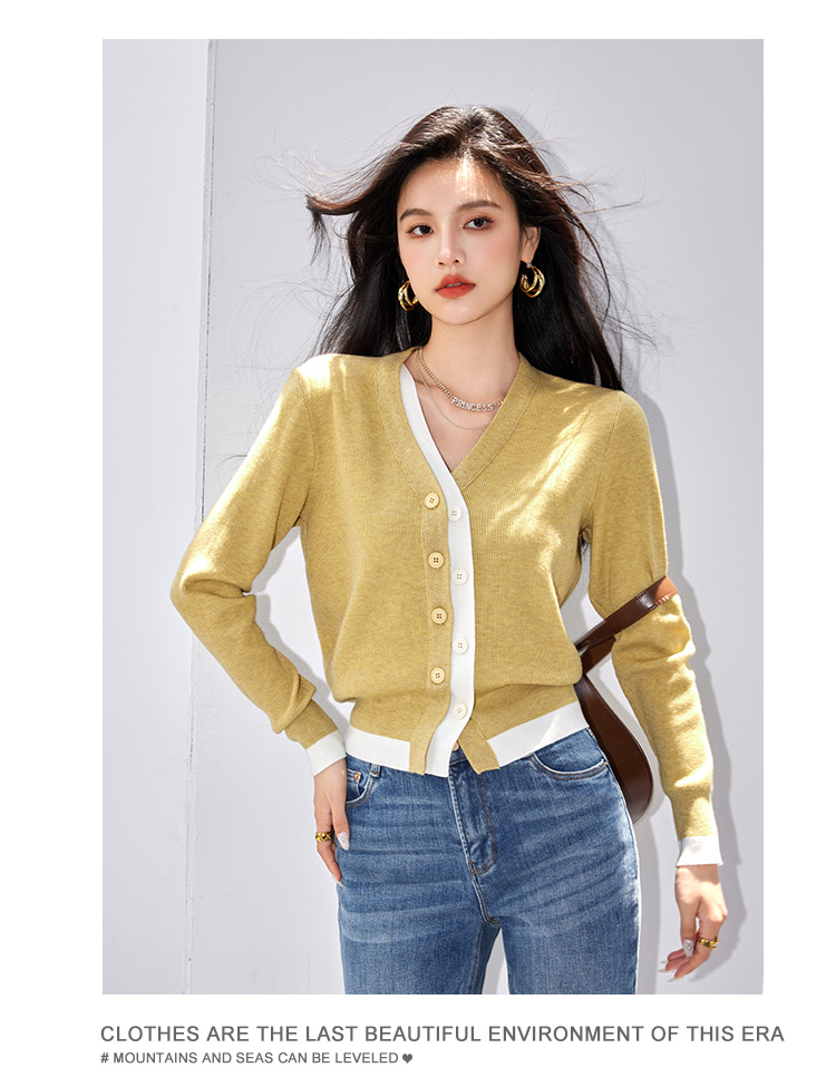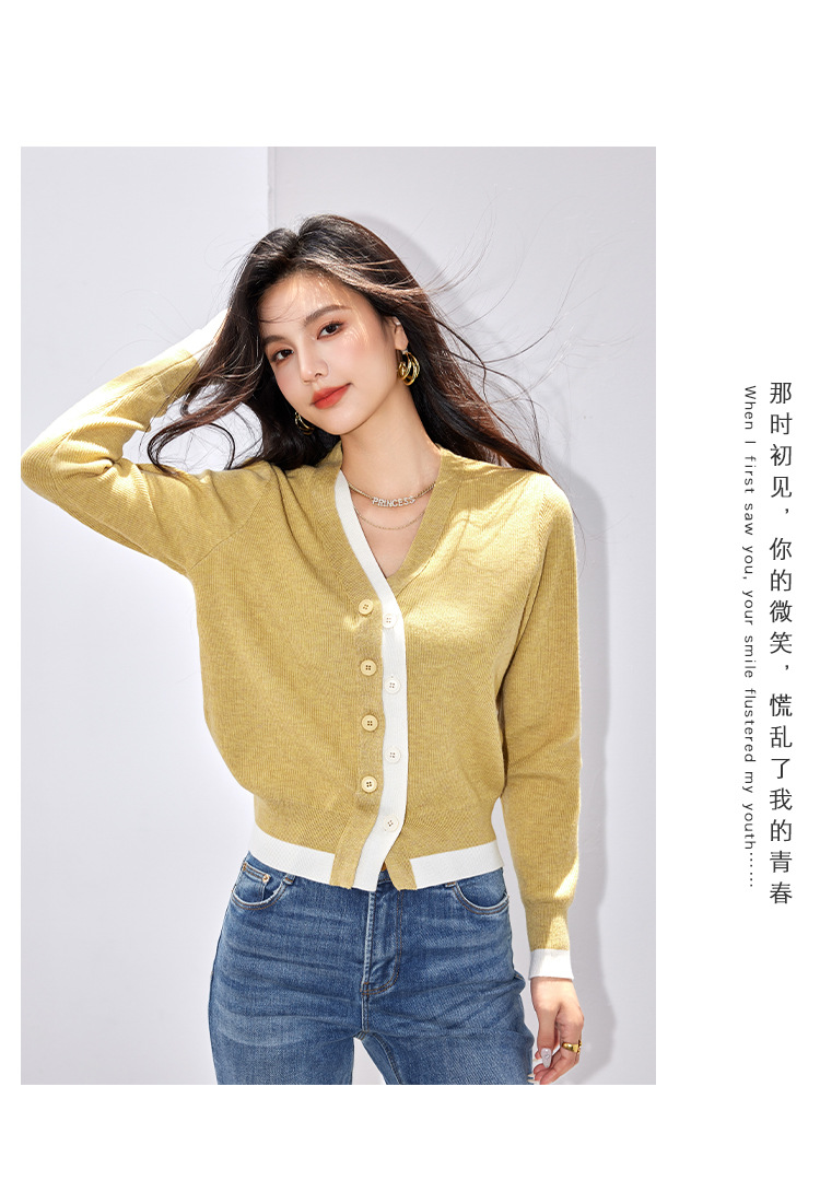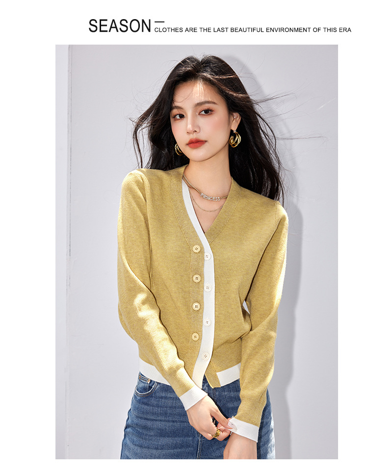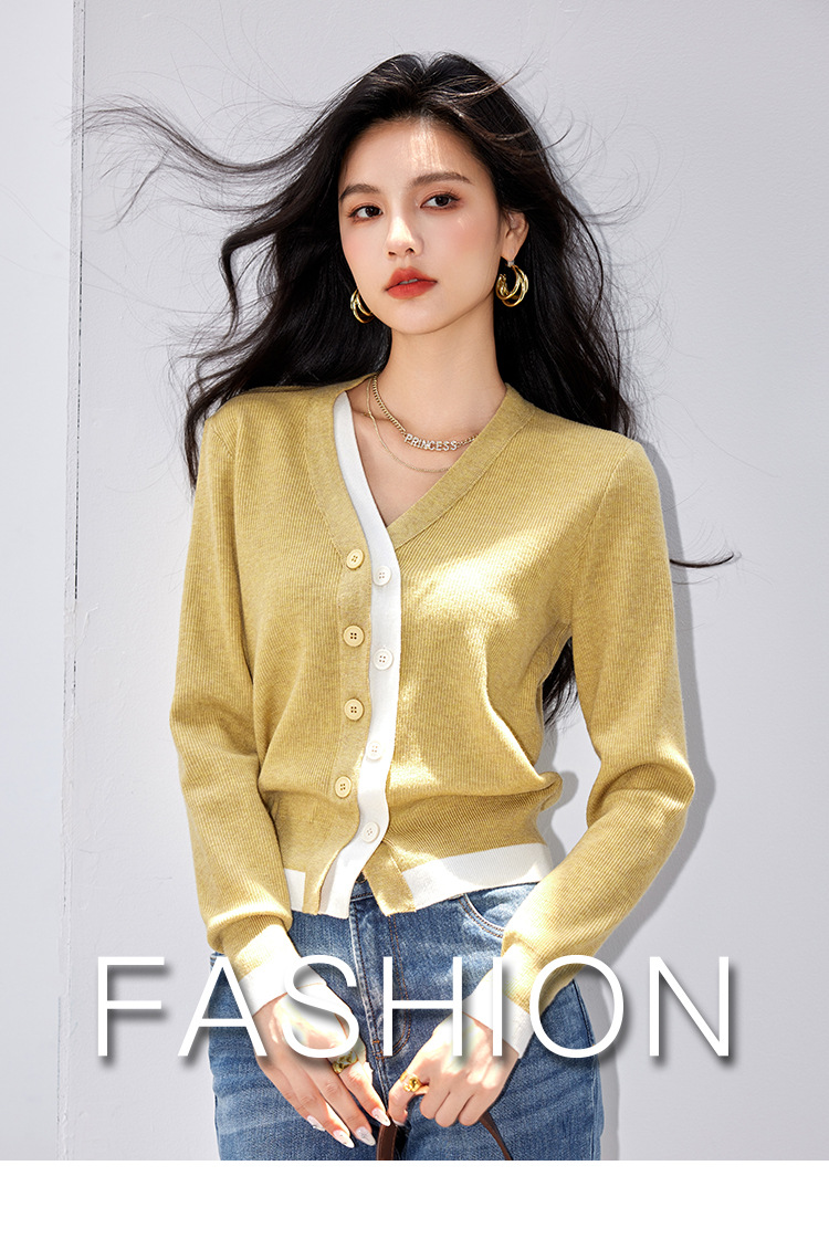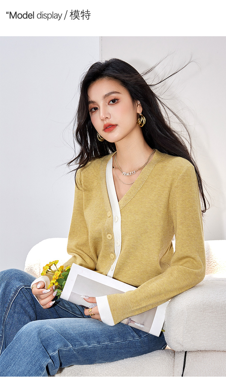 日系拼色假两件针织衫女 秋冬装V领收腰显瘦气质开衫上衣