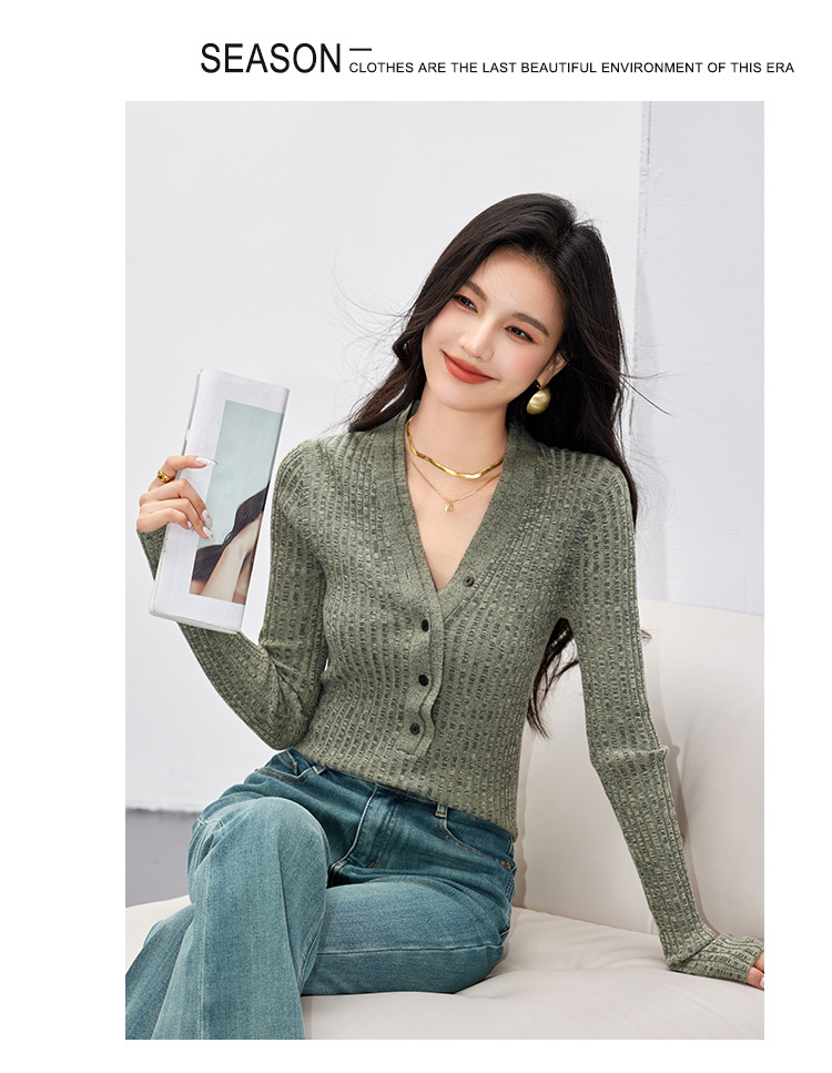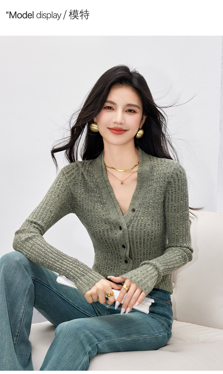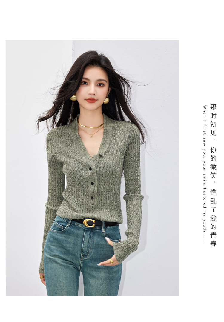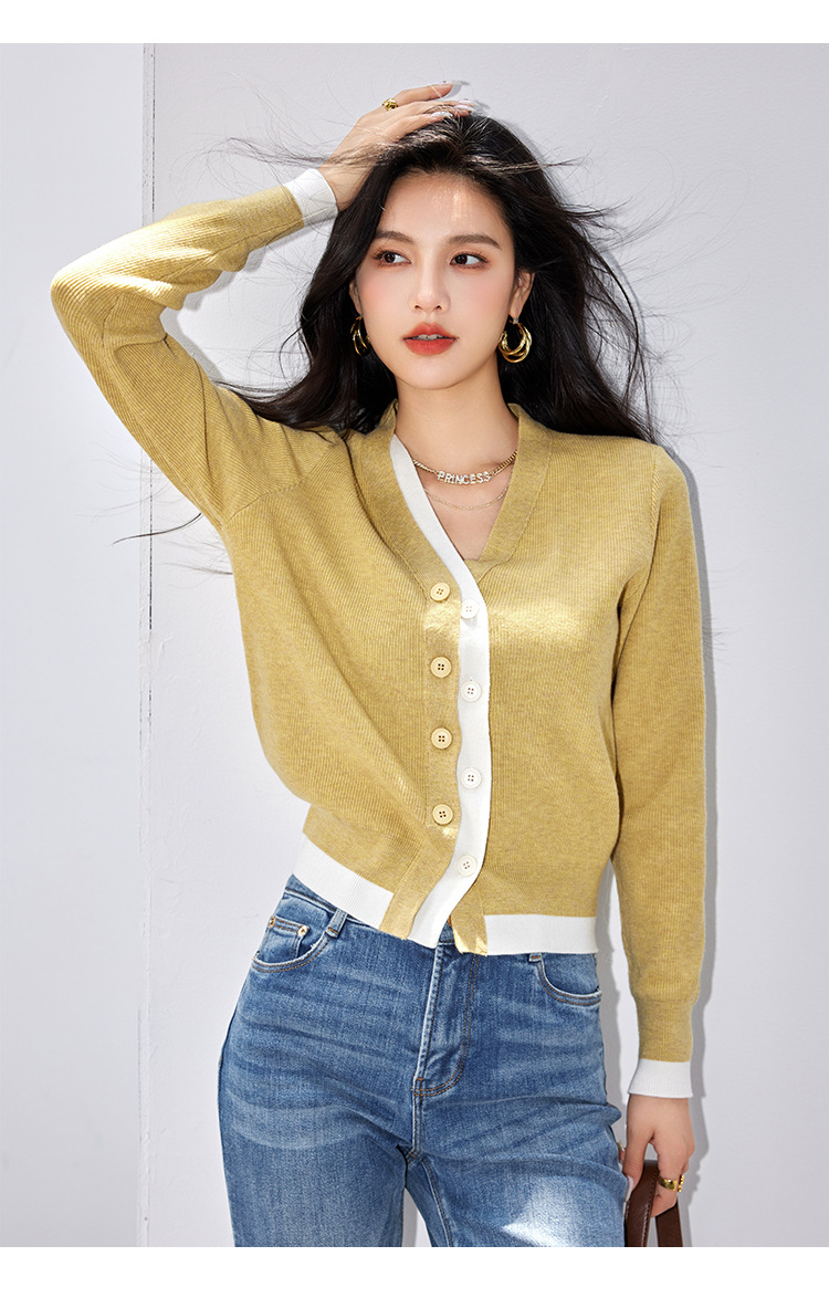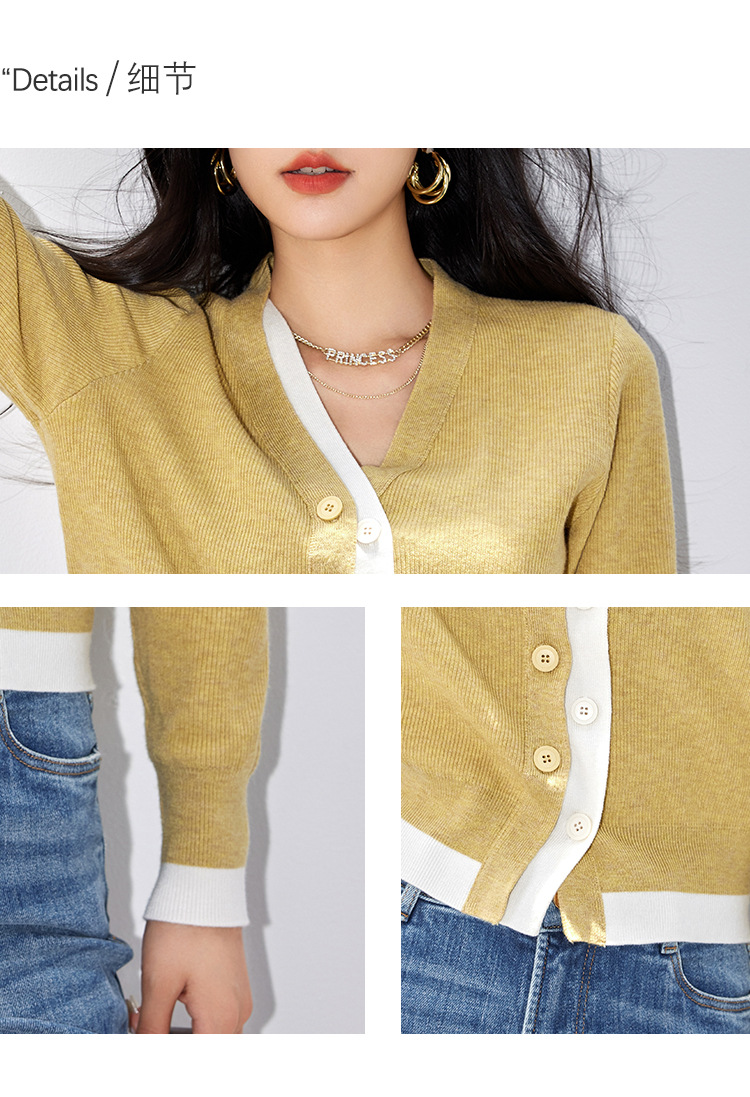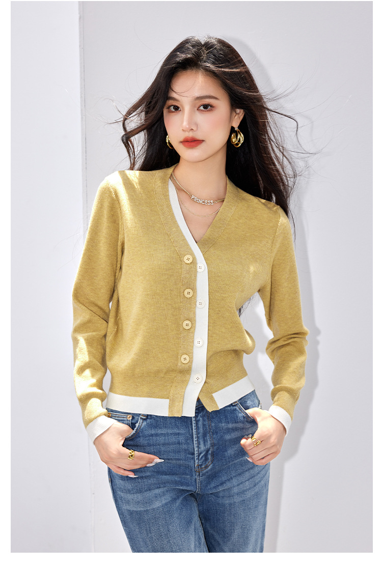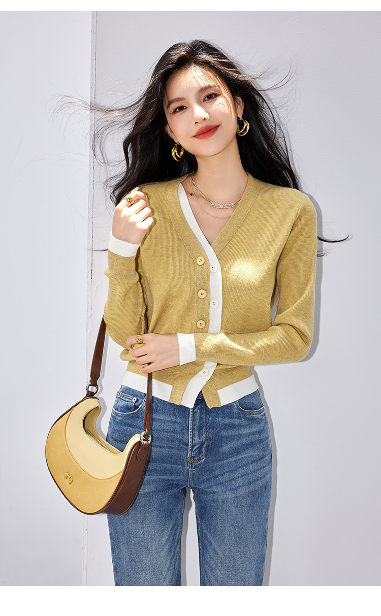日系拼色假两件针织衫女 秋冬装V领收腰显瘦气质开衫上衣