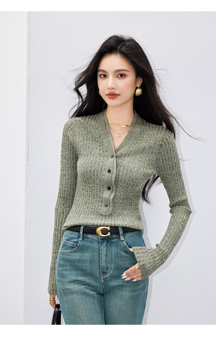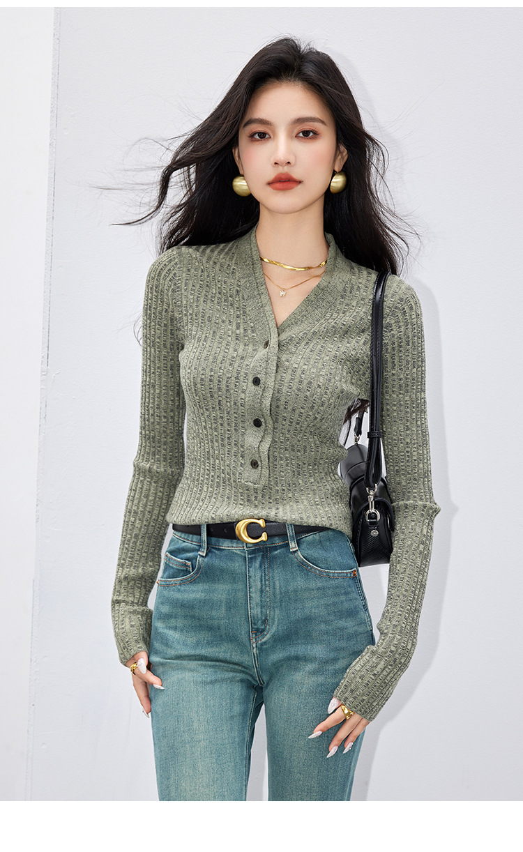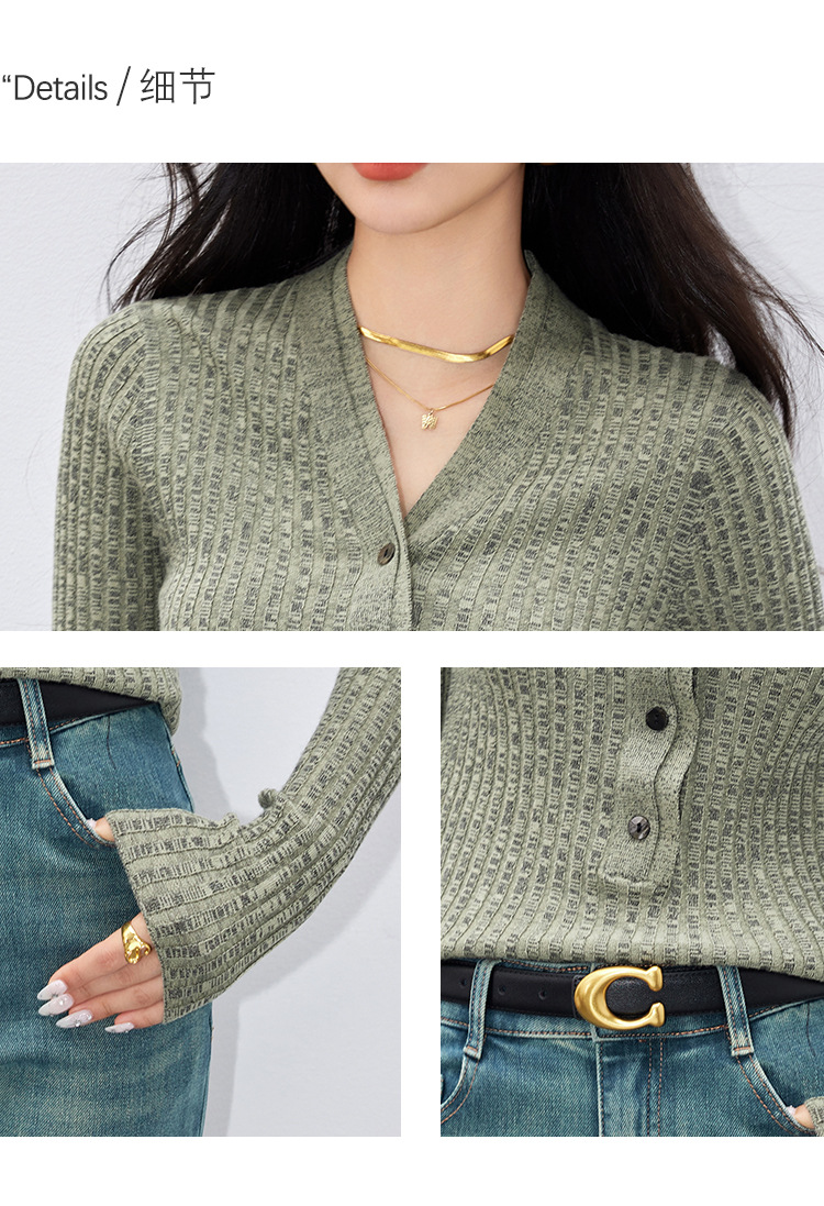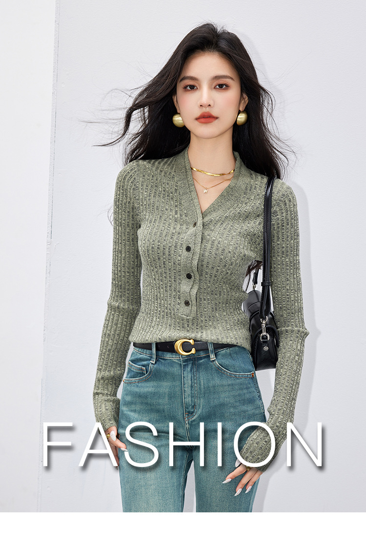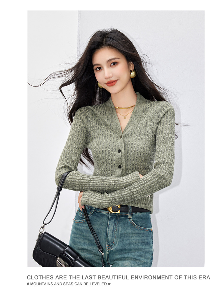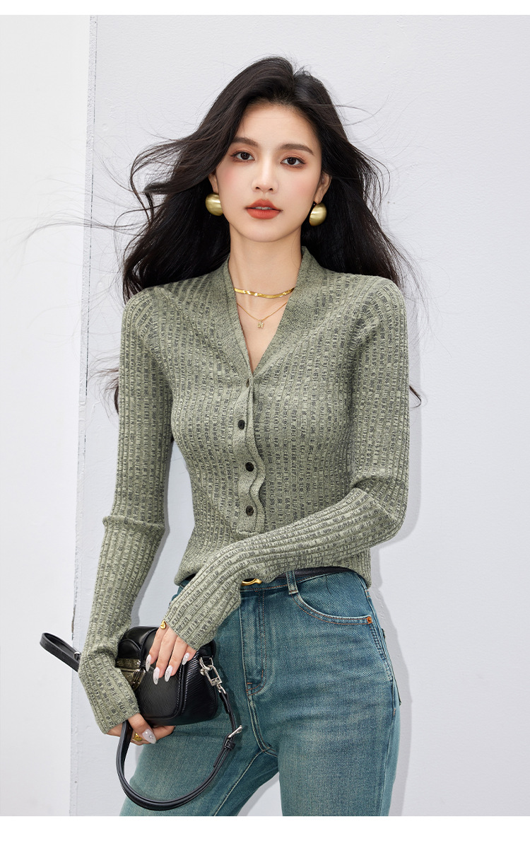 日系拼色假两件针织衫女 秋冬装V领收腰显瘦气质开衫上衣
