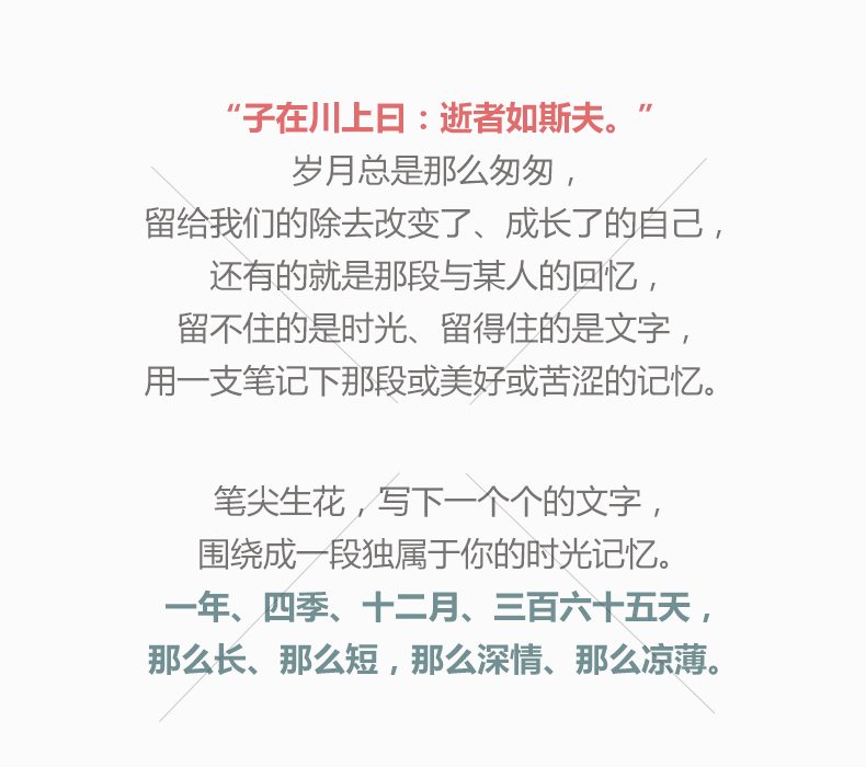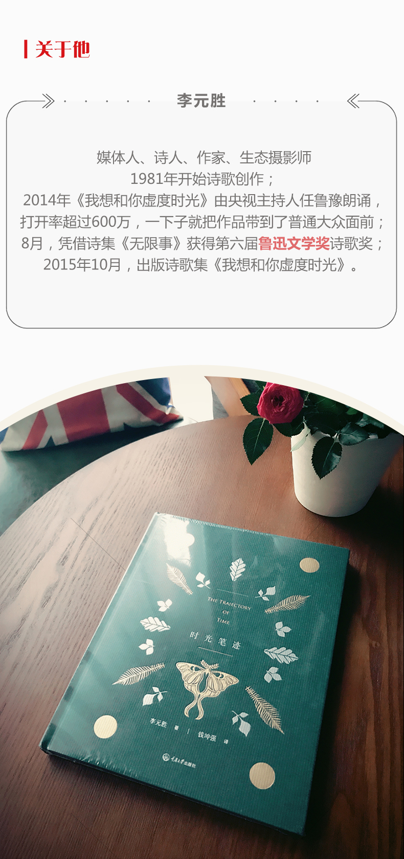《时光笔迹》是一本脱胎于《我想和你虚度时光》的诗集日记手账。整本书是中英文诗歌加笔记本的形式,选取诗人李元胜的《我想和你虚度时光》作总领, 新作的十二诗歌代表十二个月,形成由月区隔的笔记本形式。十三诗由关系学院的钱坤强教授翻译成英文,优美动人。
