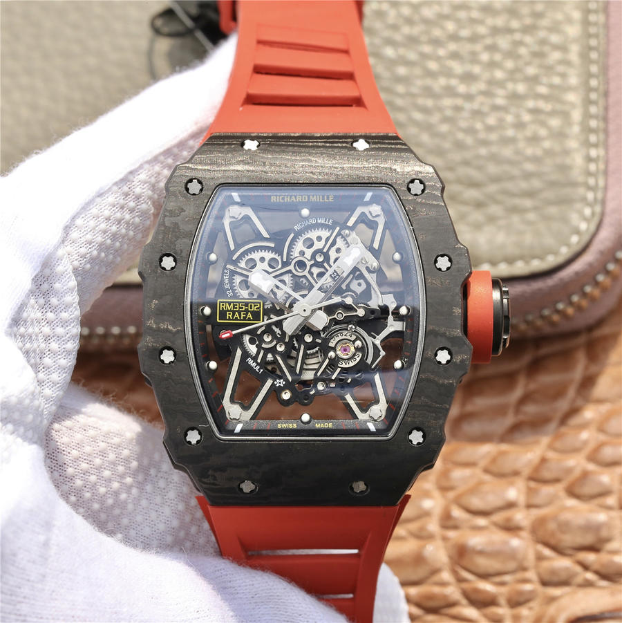 碳纤维材质 锻造碳岩层纹 碳花纹路 上盖唯一与原版一致开凹唯一 全网最亮最爆碳花 防水不在话下 毫无惧水 修正市场版本理查德不防水这一致命弱点 唯一可以与原装互换的理查德米勒表带 把头升级原版的方式配搭改多色圈 与原版一致 螺丝表扣按照原版缩小 表壳按照原版开模 与原版一致的弧度 不再像市场一样平扁 唯一完美还原正品尺寸 唯一可以女生配戴的RM-035尺寸 唯一可以跟正品互换表带的版本 唯一可以自由互换把头的RM-035
