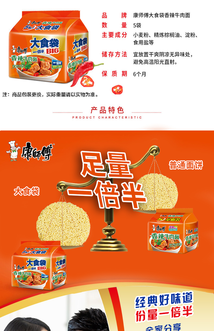 【亚欧超市】康师傅大食袋香辣牛肉面146g*5