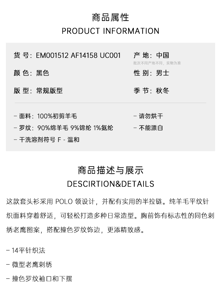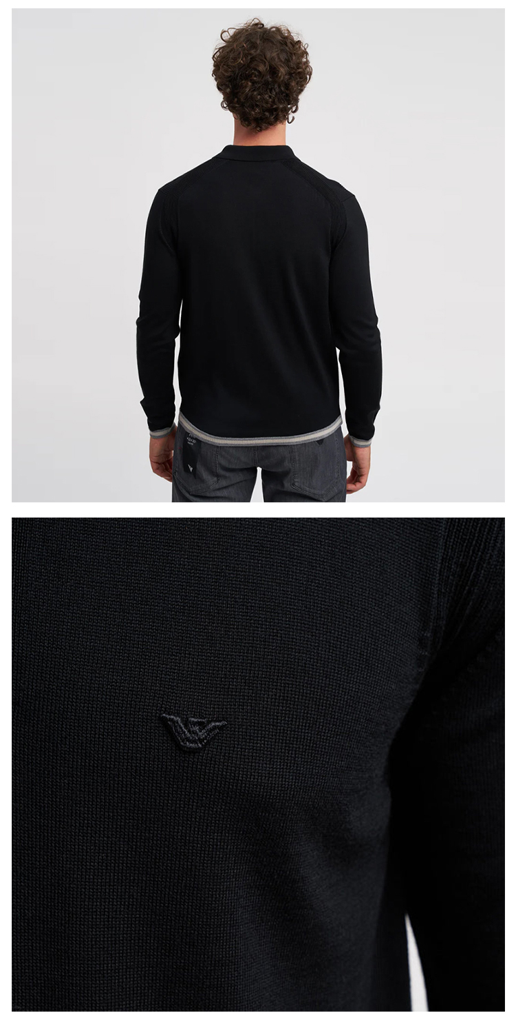 EMPORIO ARMANI 阿玛尼 男士小鹰徽标刺绣纯羊毛长袖Polo针织衫 黑色 EM001512 AF14158 UC001