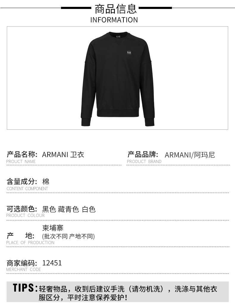 【超惠秒】Armani EA7男士运动休闲简约全棉卫衣外套12451