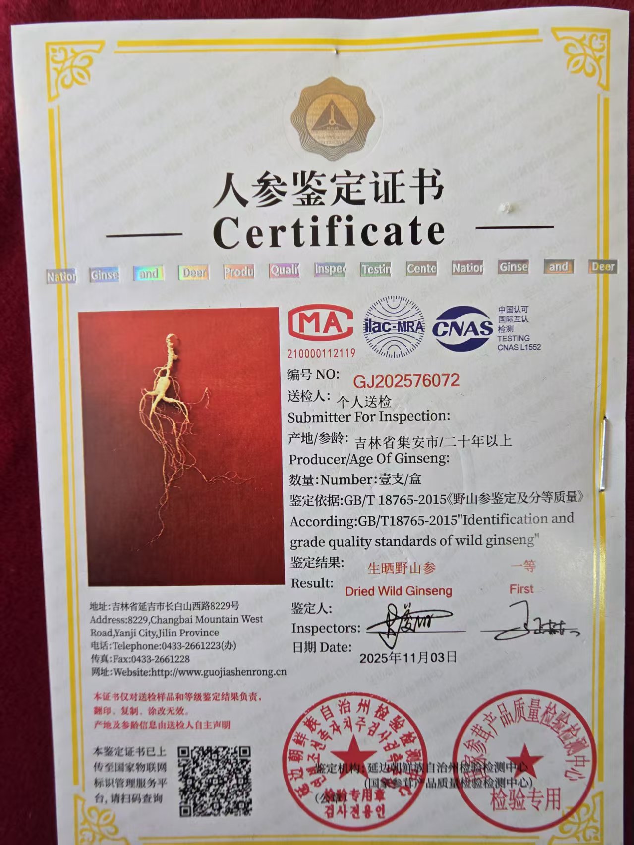 【长白山野山参】O农残 野生人参 每一盒都带鉴定证书 价格只是市场一半
