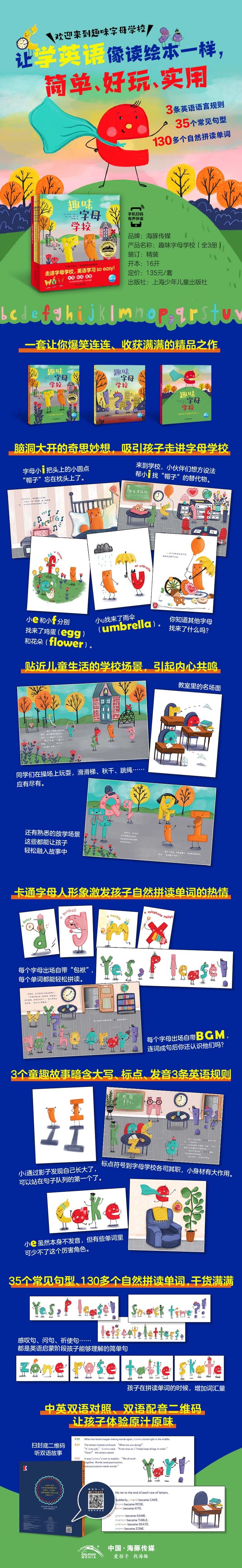 一群有形又有音的字母人,4个有个性的标点符号小伙伴,在一个充满了欢乐的字母学校里,发生了一连串令人捧腹的趣事。字母小i起床的时候把他头顶上的“小帽子”遗忘在床上,到了学校,众多字母小人儿一起帮他找帽子的替代品——字母小a找来了一枚橡果,字母小b找来了一个气球,字母小c找来了一个时钟……字母小i把这些替代品都试了一遍,但发现都行不通。标点符号一家人跑到镇上的学校,和字母组成的单词组成了一句句话。每一个标点符号都有自己的职责:感叹号加强句子的语气,问号让句子变成提出问题的语气,句号是一个句子的终止,逗号放在合适的位置用于断句。标点符号家族的成员之间互相协作,为单词提供帮助。字母小e平常总是默默无闻,不发出声音,但到了关键时刻,大家发现没有他是万万不行的。许多单词的组成都必须以字母e结尾,字母小e帮助字母们组成了许多单词。所以字母e虽然不发音,但用处很大。《趣味字母学校》以妙趣横生的故事和引人入胜的方式教孩子们拼写和阅读单词,了解标点符号在英语中的用处。