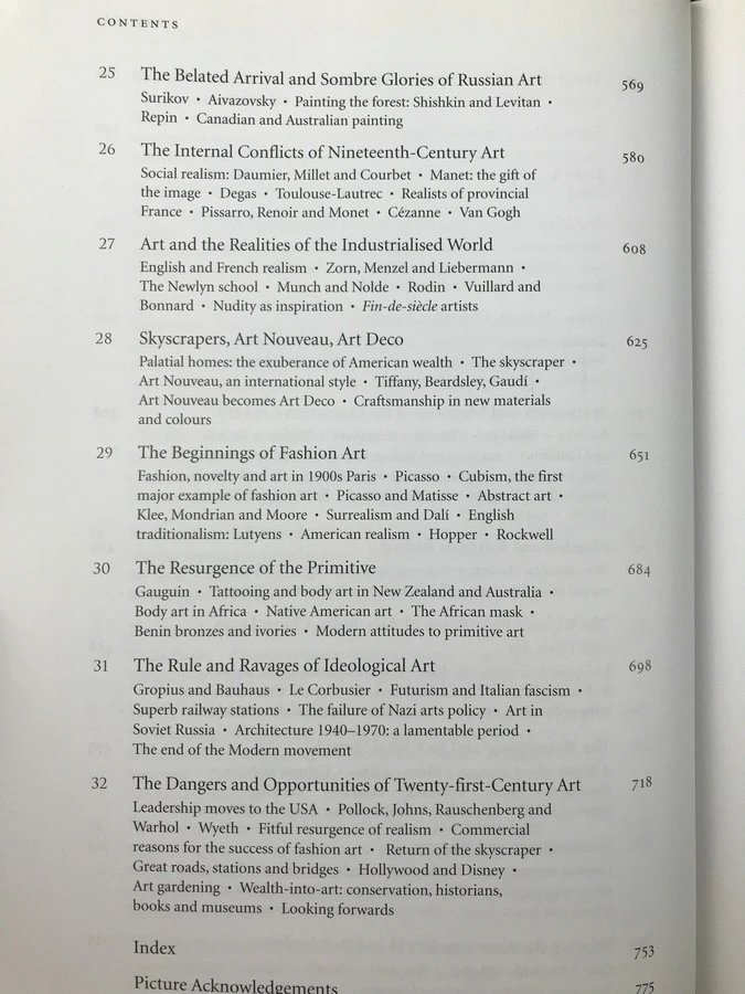 本书从原始洞穴艺术讲起,直至现代装饰艺术,涵盖时间三万余年,横跨五大洲,并且从某种程度上克服了其他艺术史类书籍的欧洲中心主义倾向。在整个讲述过程中,作者将艺坛展览、艺术家生平轶事、艺术史最新研究成果同本人经历糅合在一起,语言平实,多用口语,通俗易懂,以一种中肯的态度来谈论艺术,即充分肯定艺术的崇高地位,同时对创造艺术的艺术家个人的优点、缺点也全盘托出,并不避讳。另外,作者非常重视艺术的独立身份,对于20世纪某些国家艺术意识形态化的种种遭遇进行了深刻的反思。
