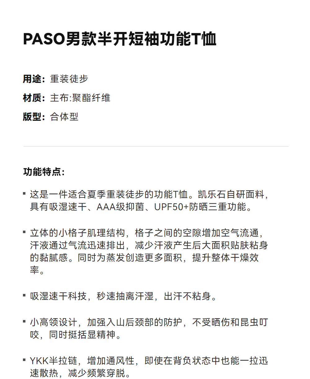 KAILAS凯乐石 PASO男款半开短袖功能T恤 KG2617179