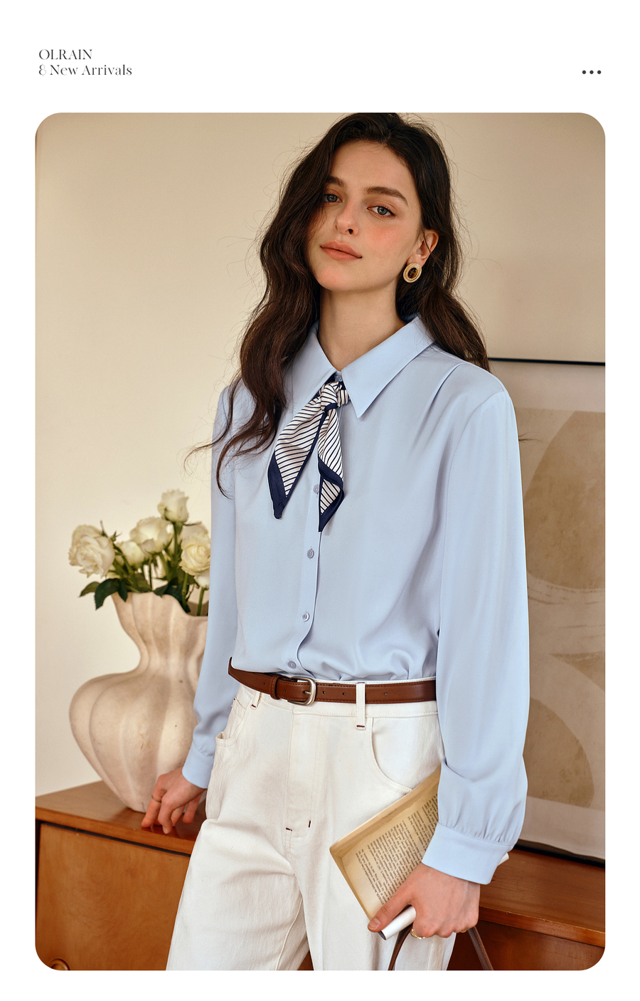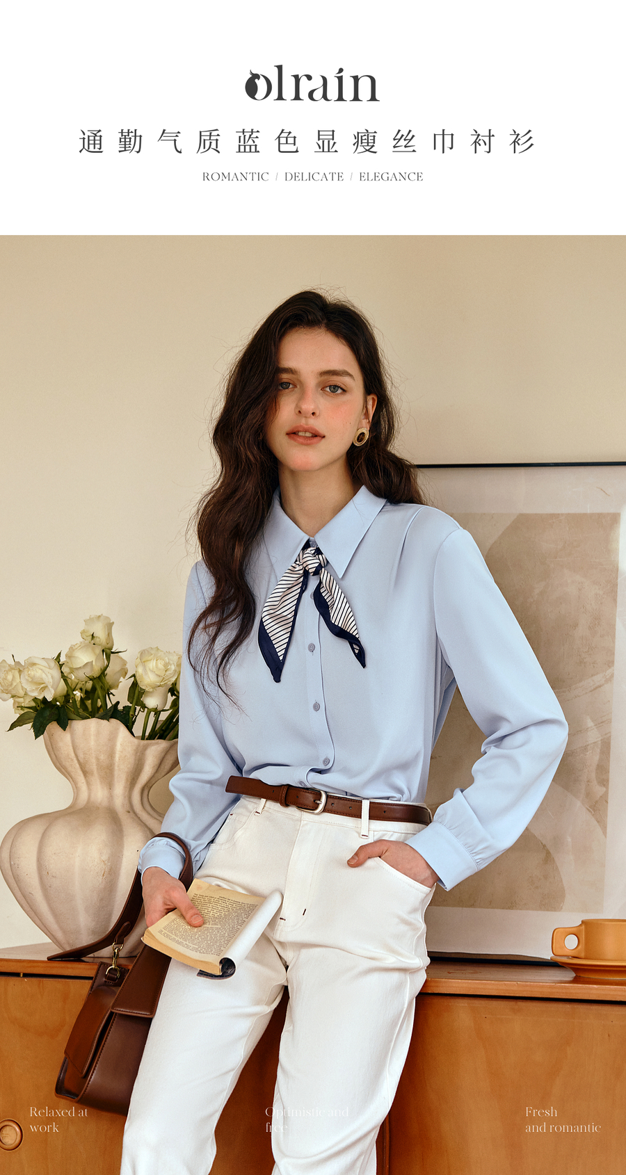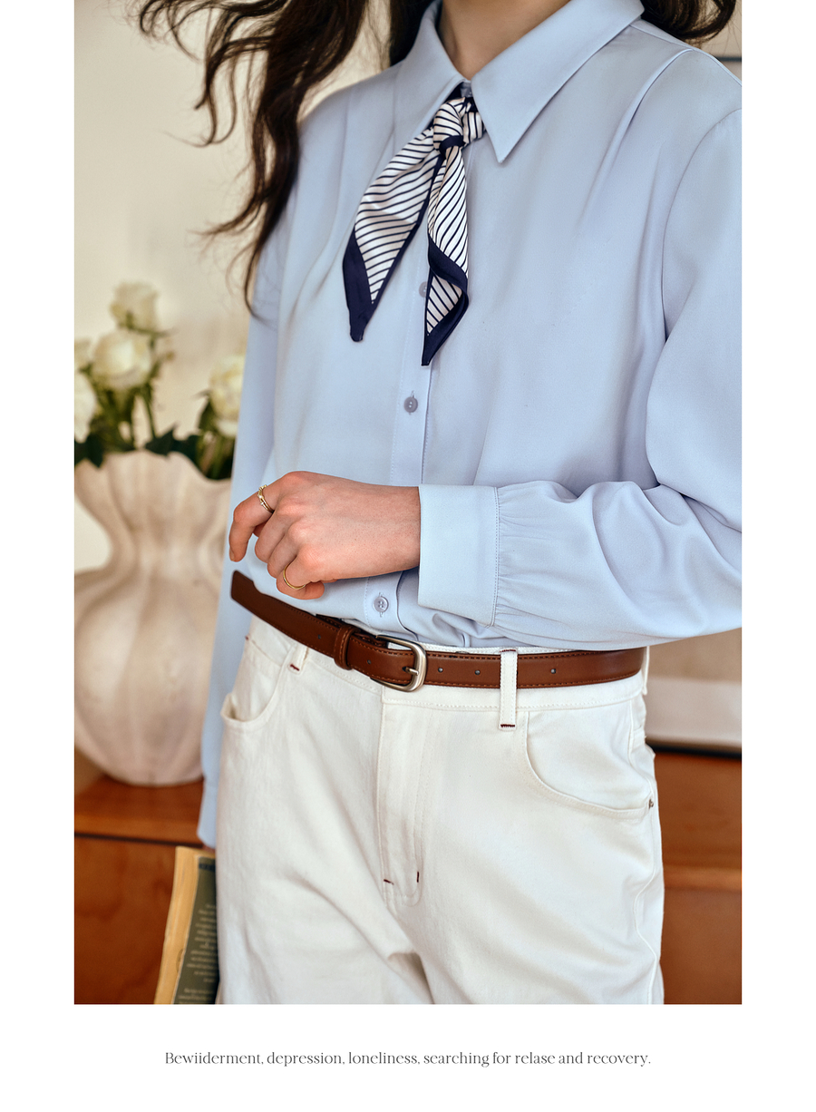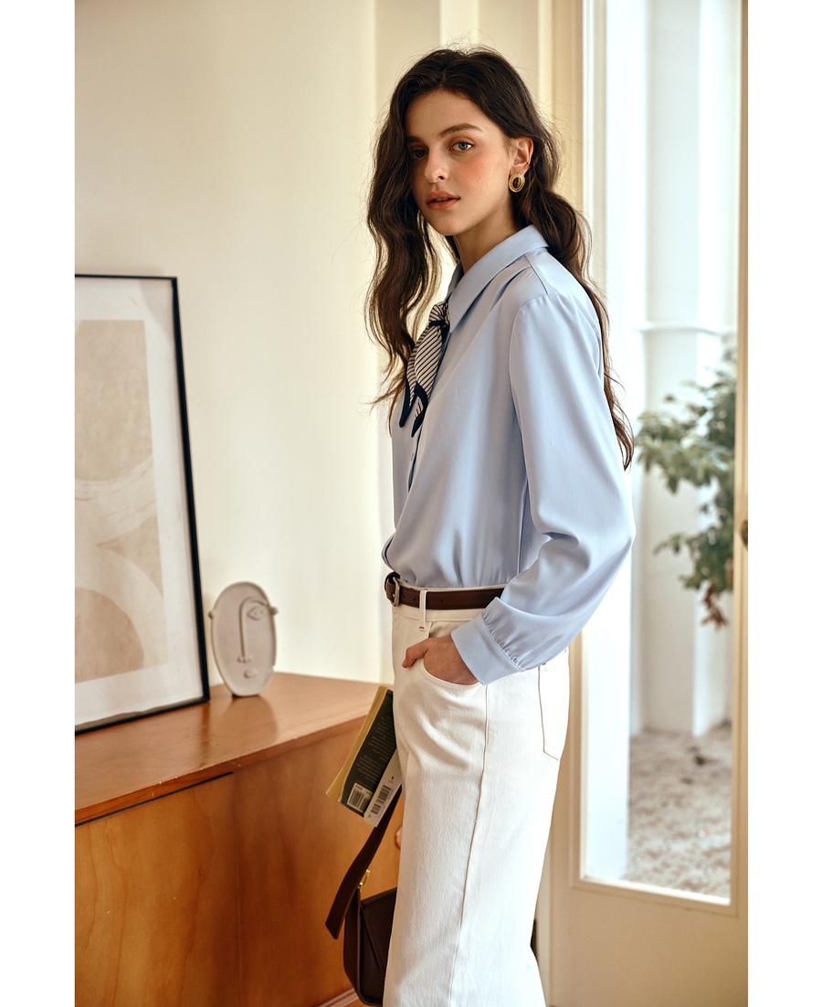 OLrain欧芮儿通勤气质蓝色显瘦丝巾衬衫女秋季2025年新款长袖衬衣