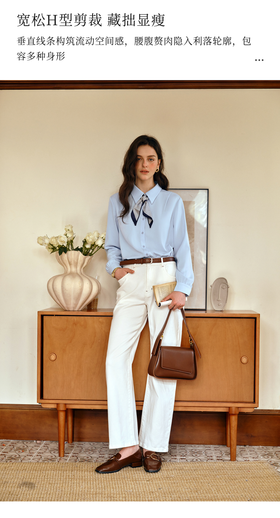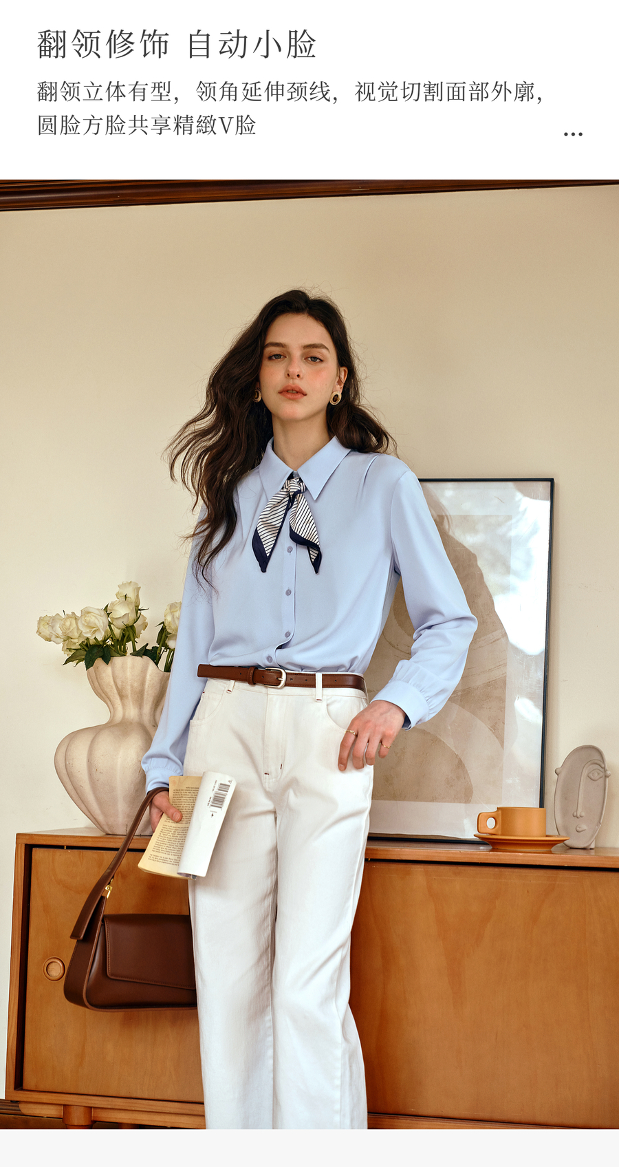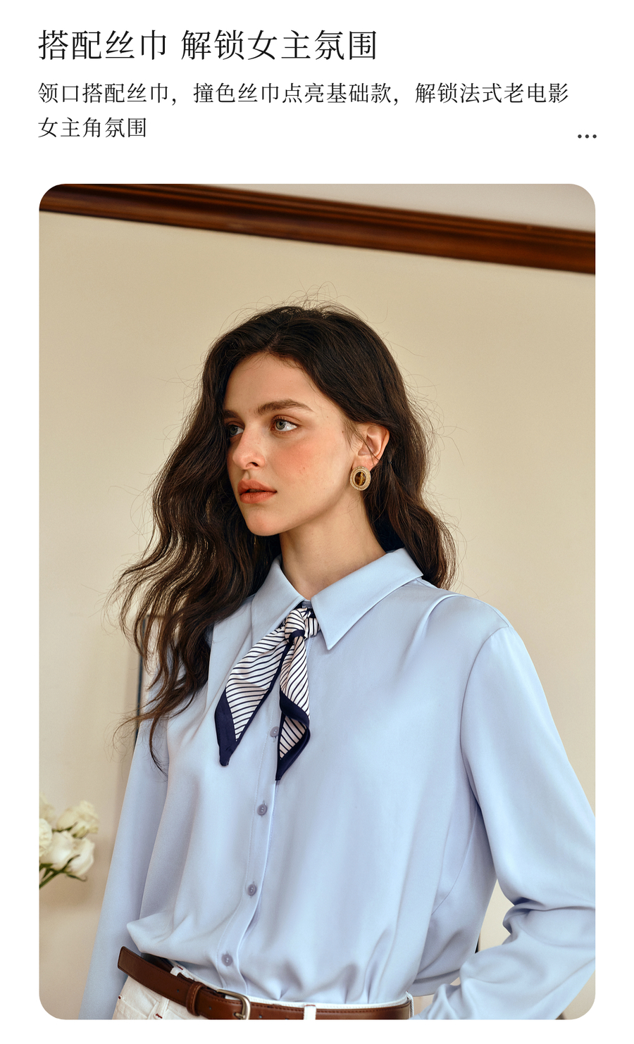 OLrain欧芮儿通勤气质蓝色显瘦丝巾衬衫女秋季2025年新款长袖衬衣