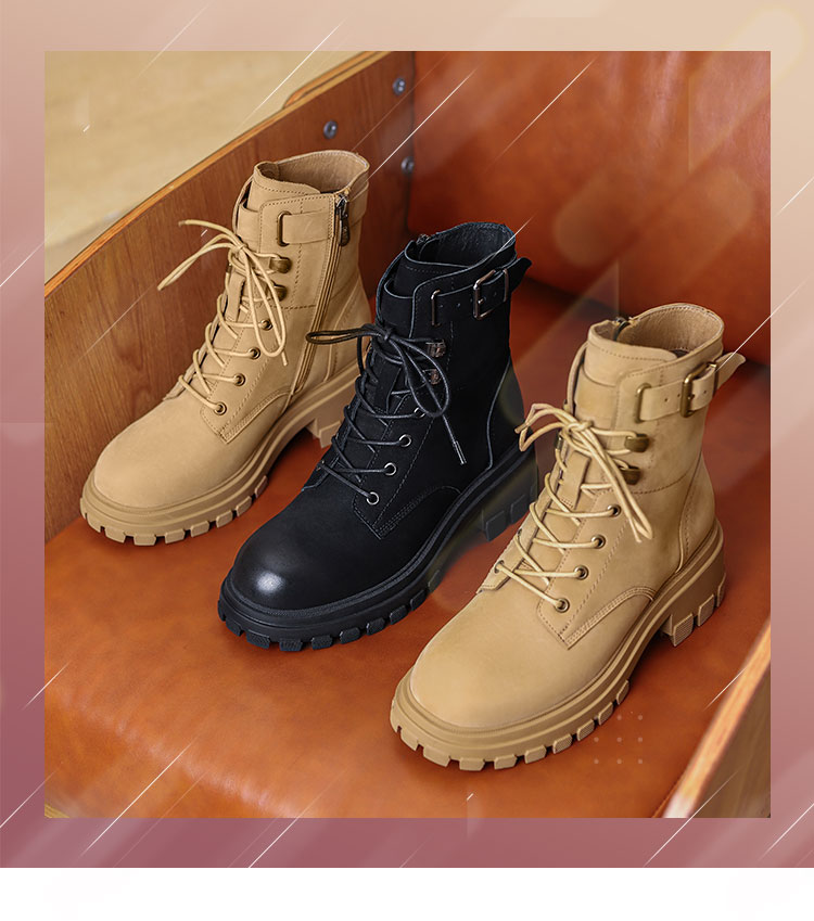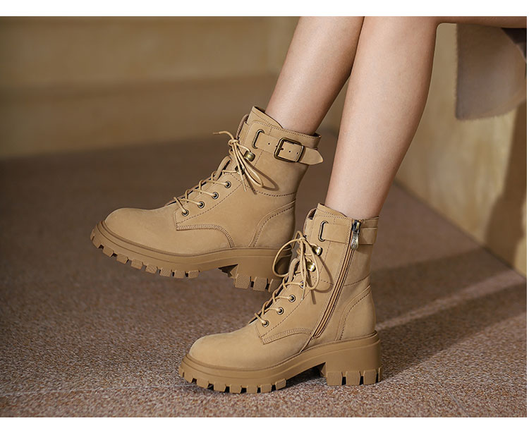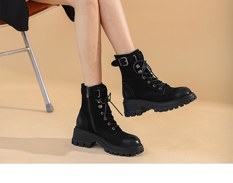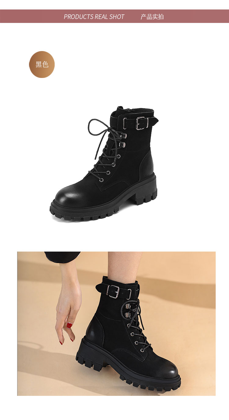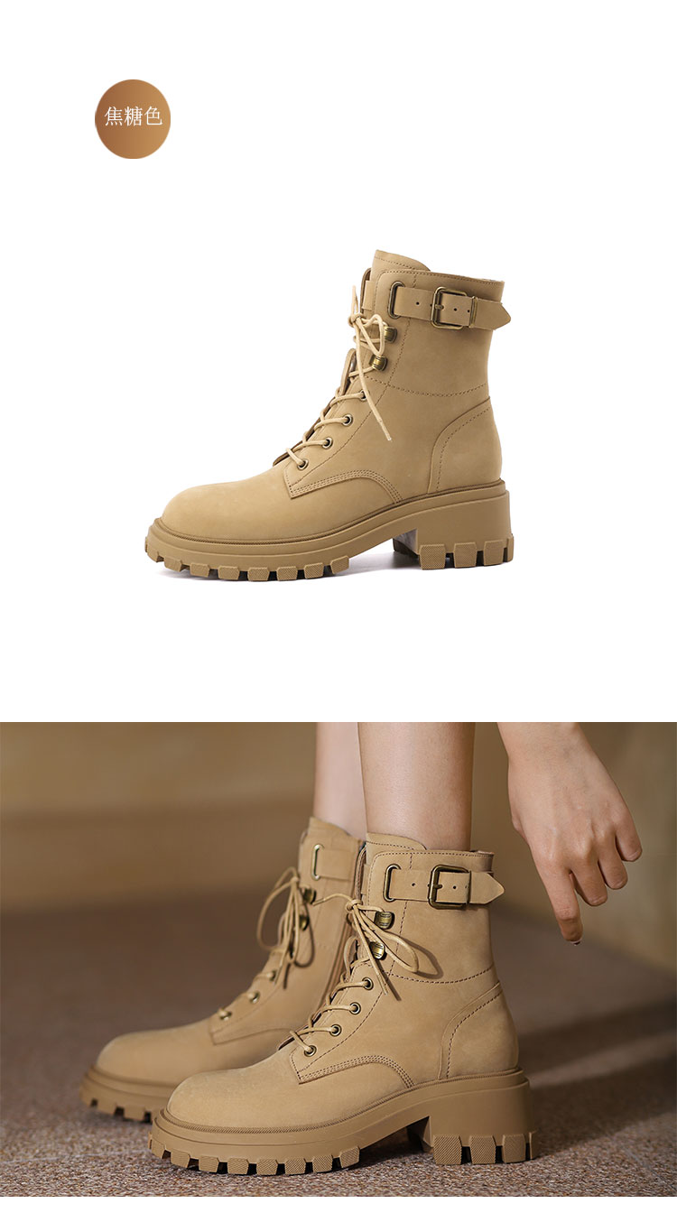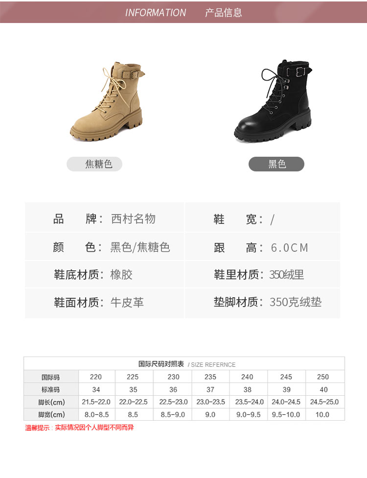 西村名物2021秋冬新品马丁靴牛皮革中跟英伦风系带短靴X21DS46191