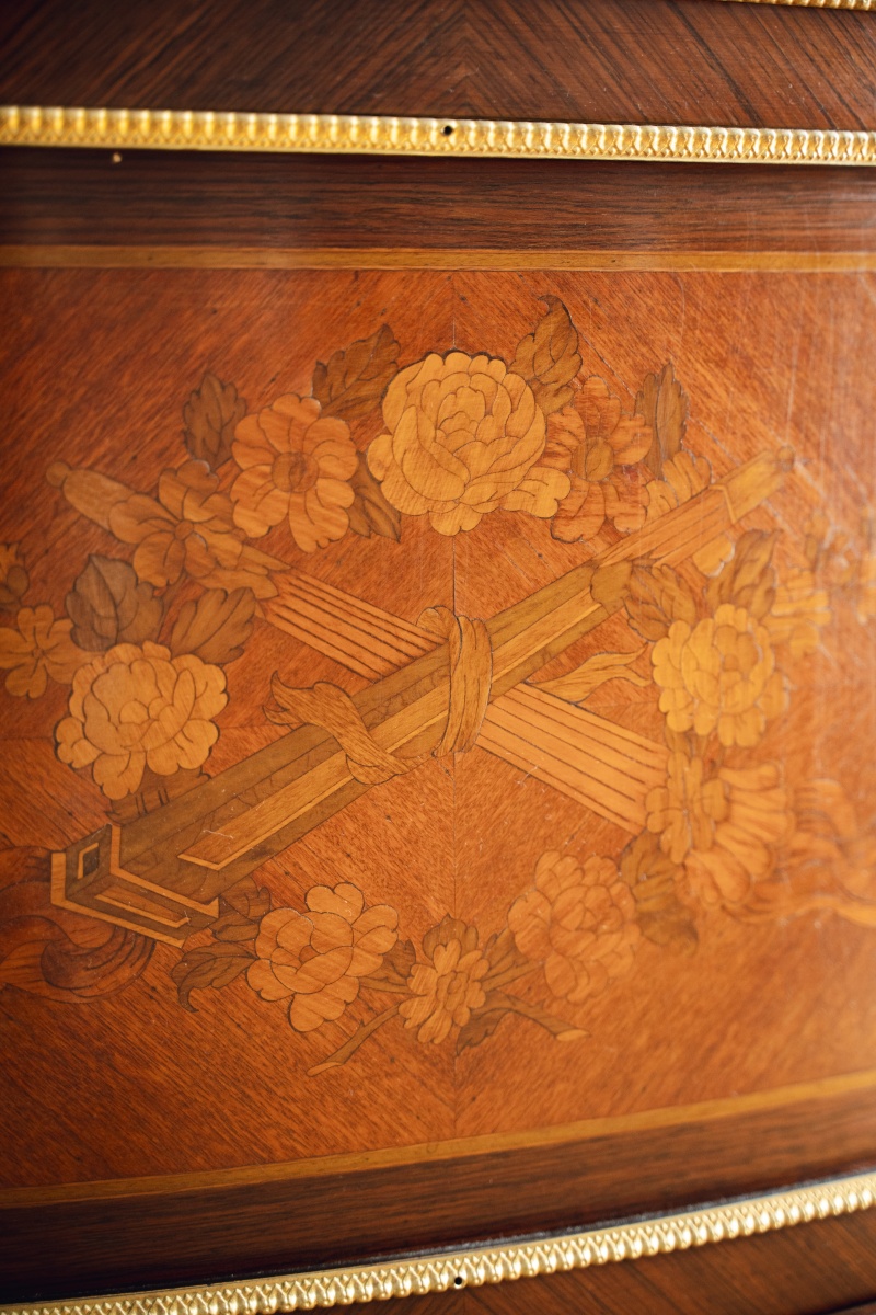 19世纪末法国出品路易十六风格铜鎏金雕饰火炬花环主题细木镶嵌大理石台面玻璃展柜