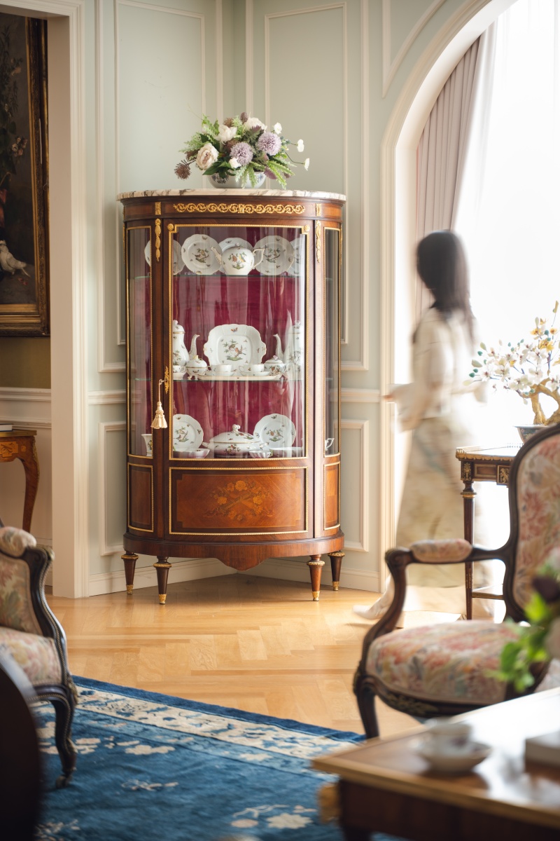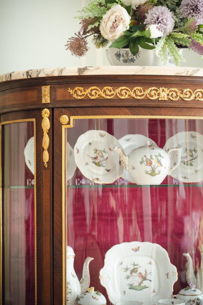 独角鹿西洋古董19世纪末法国出品路易十六风格铜鎏金雕饰火炬花环主题细木镶嵌大理石台面玻璃展柜