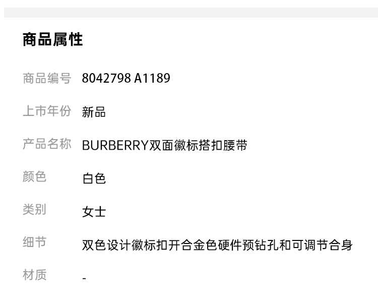 BURBERRY 博柏利 双面两用TB专属标识图案皮革腰带 女士腰带 白色 8042798 A1189