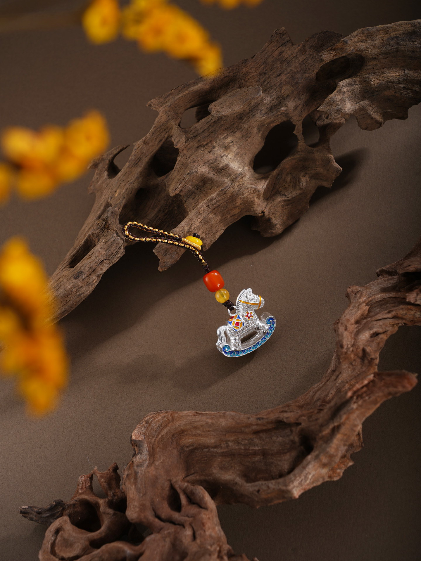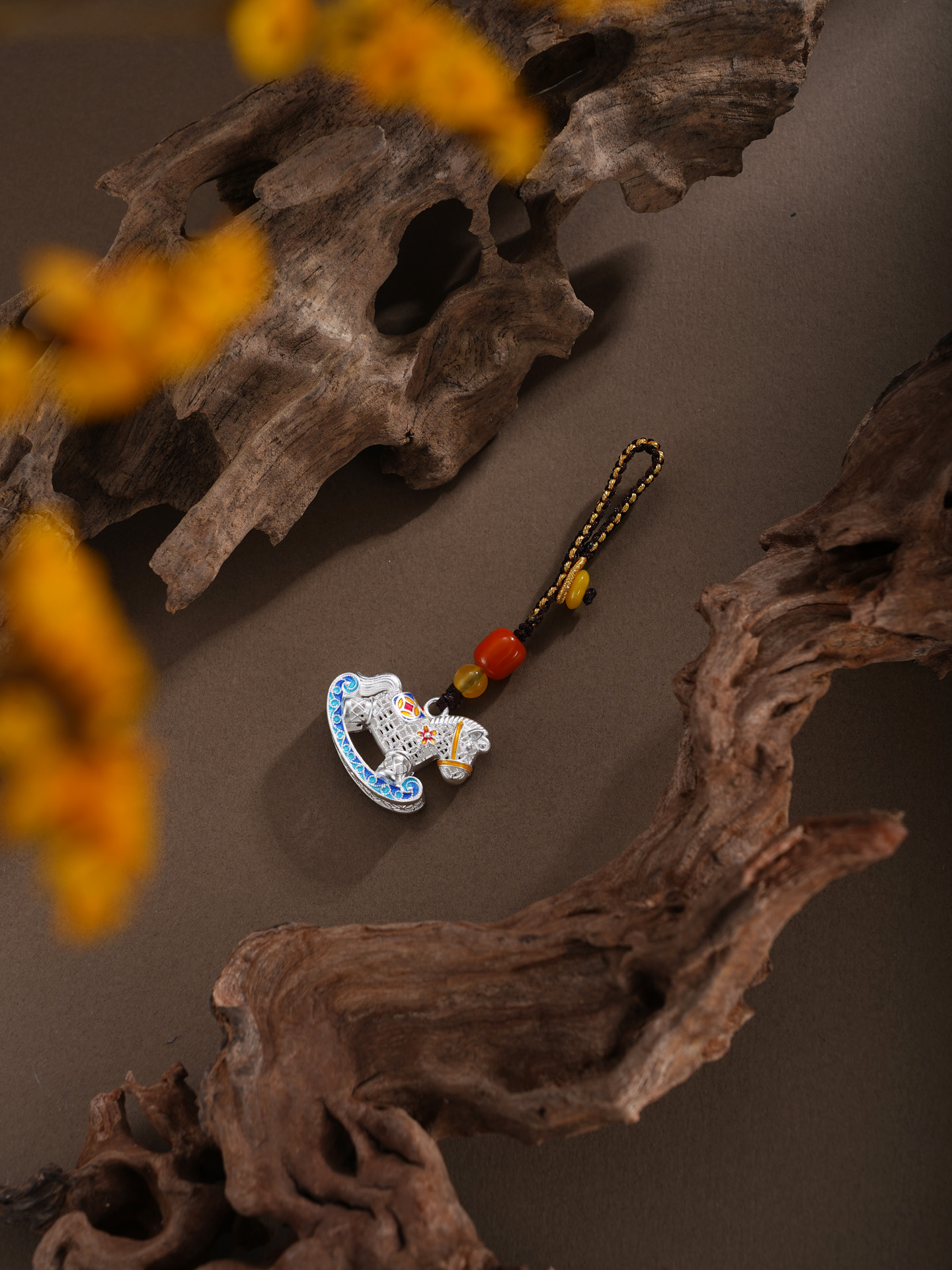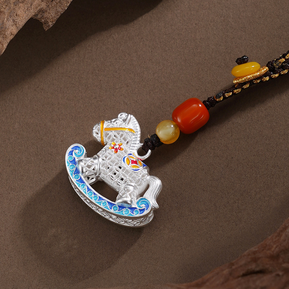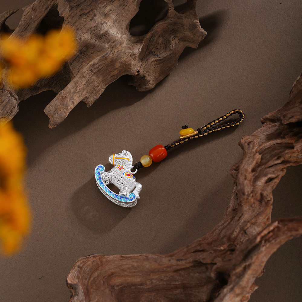 【寓意】:以花丝工艺编织小木马钥匙扣,木马造型象征童年纯真与成长力量。马身缀以繁花与铜钱,寓意生机勃发、财富流转。三者相映,寓意好运加码,财福双至。