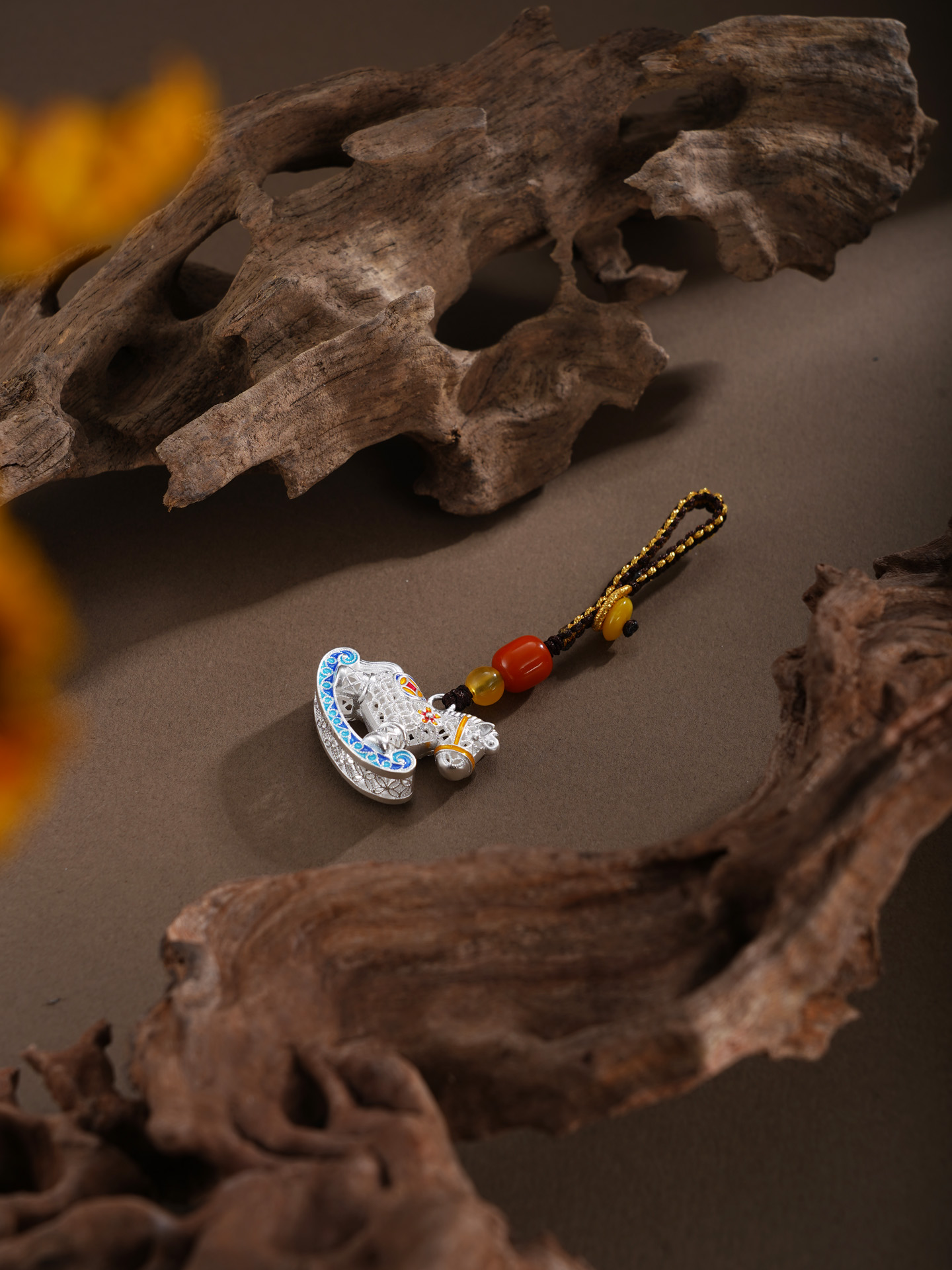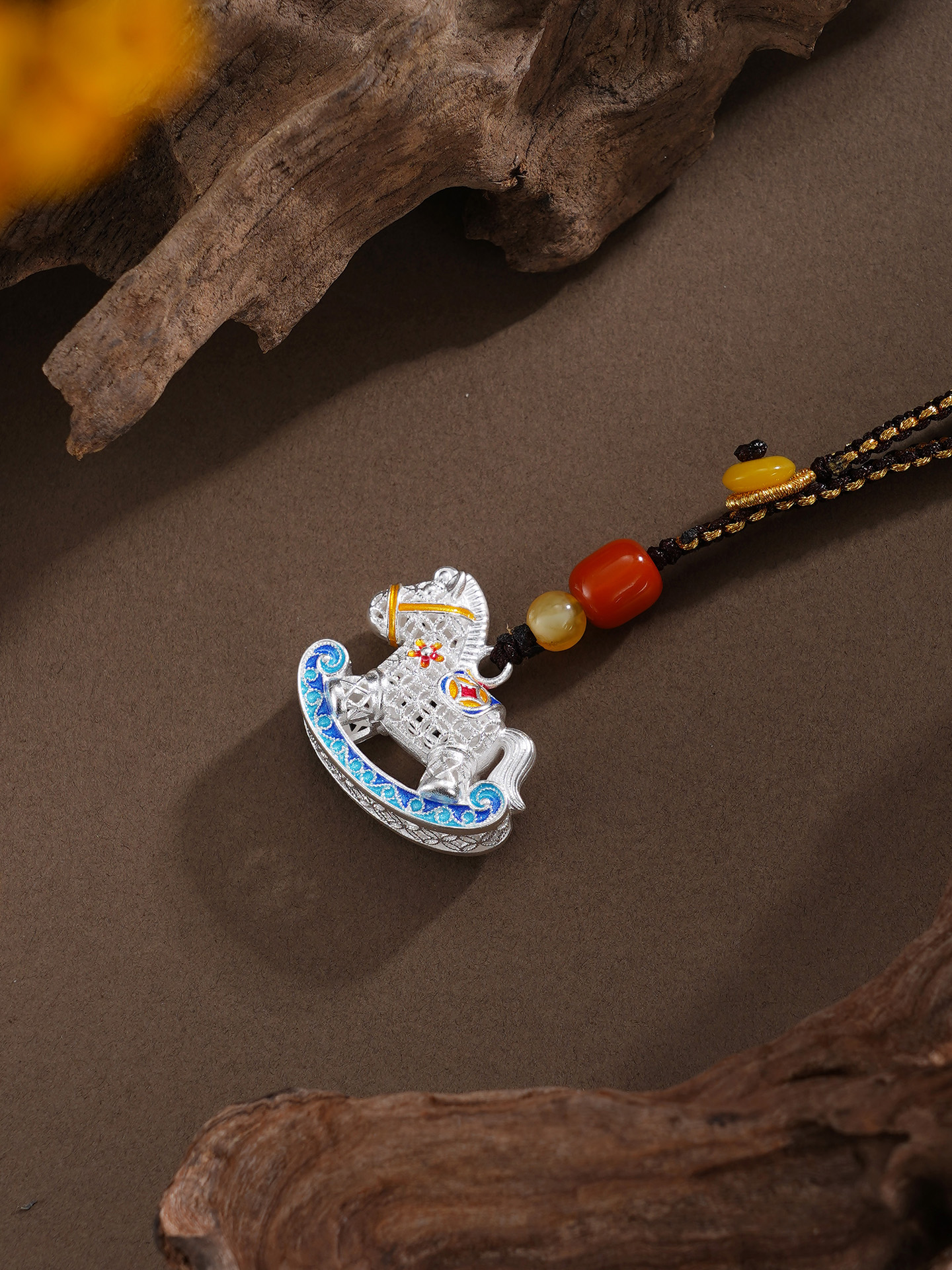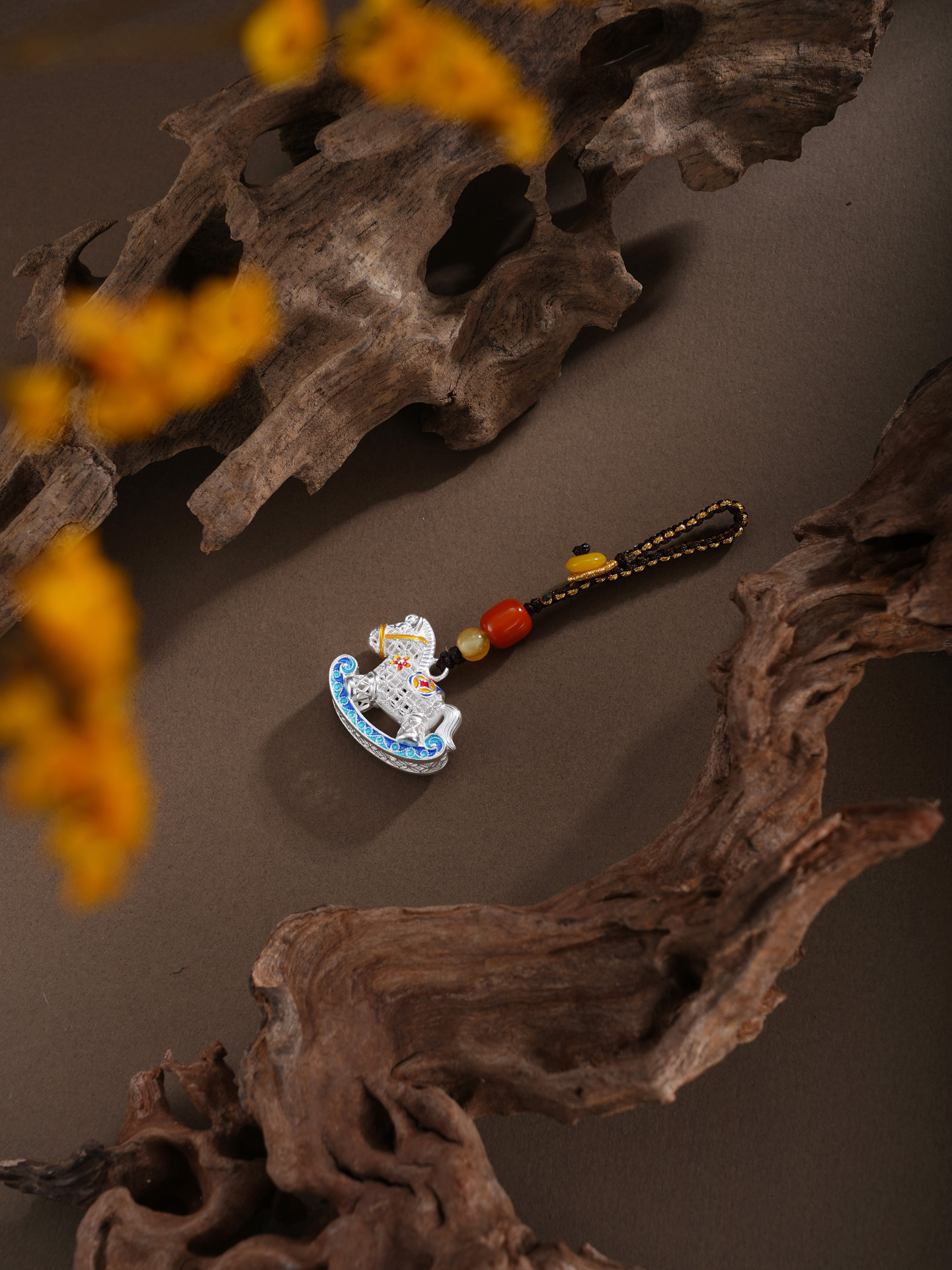 【寓意】:以花丝工艺编织小木马钥匙扣,木马造型象征童年纯真与成长力量。马身缀以繁花与铜钱,寓意生机勃发、财富流转。三者相映,寓意好运加码,财福双至。