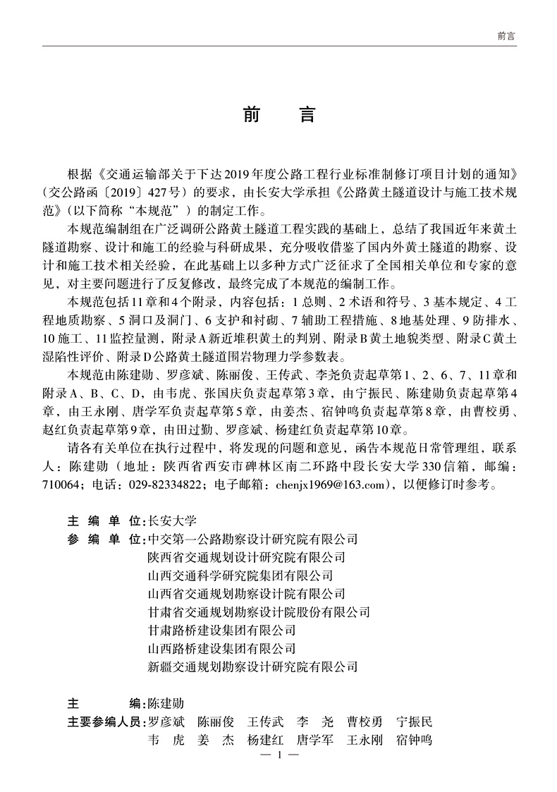 根据 《交通运输部关于下达 2019 年度公路工程行业标准制修订项目计划的通知》 (交公路函 〔2019〕 427号) 的要求,由长安大学承担《公路黄土隧道设计与施工技术规 范》(以下简称“本规范”) 的制定工作。 本规范编制组在广泛调研公路黄土隧道工程实践的基础上,总结了我国近年来黄土 隧道勘察、设计和施工的经验与科研成果,充分吸收借鉴了国内外黄土隧道的勘察、设 计和施工技术相关经验,在此基础上以多种方式广泛征求了全国相关单位和专家的意 见,对主要问题进行了反复修改,最终完成了本规范的编制工作。