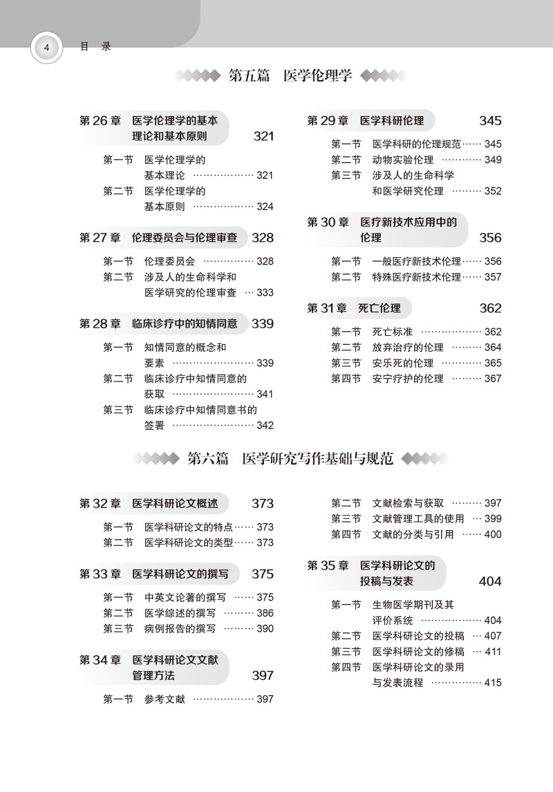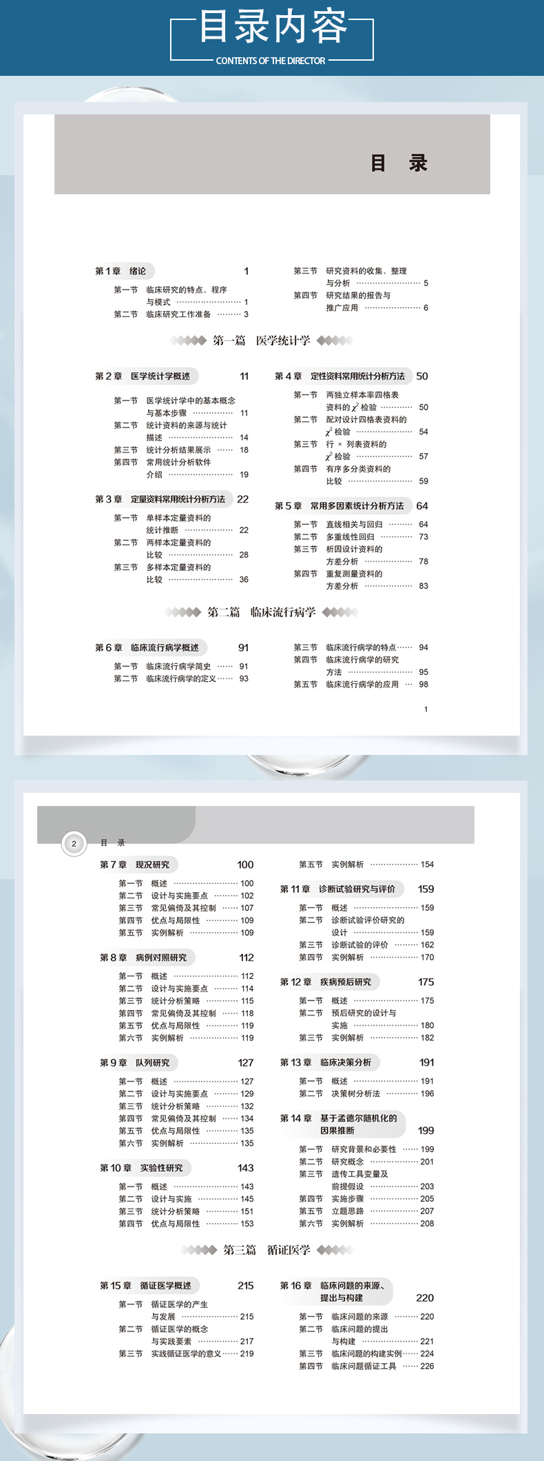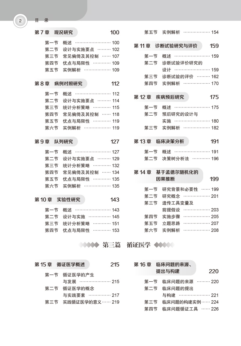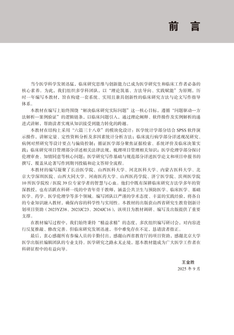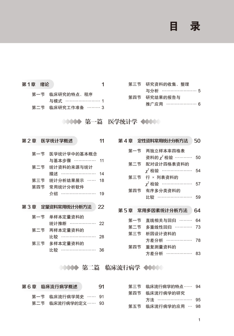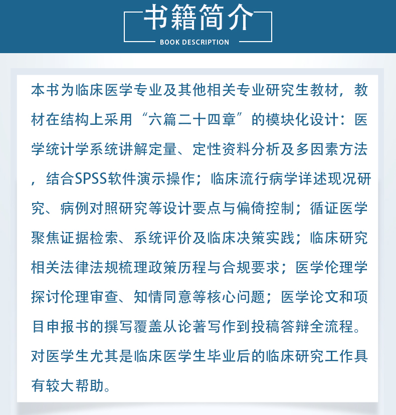 本书为临床医学专业及其他相关专业研究生教材,教材在结构上采用“六篇二十四章”的模块化设计:医学统计学系统讲解定量、定性资料分析及多因素方法,结合SPSS软件演示操作;临床流行病学详述现况研究、病例对照研究等设计要点与偏倚控制;循证医学聚焦证据检索、系统评价及临床决策实践;临床研究相关法律法规梳理政策历程与合规要求;医学伦理学探讨伦理审查、知情同意等核心问题;医学论文和项目申报书的撰写覆盖从论著写作到投稿答辩全流程。对医学生尤其是临床医学生毕业后的临床研究工作具有较大帮助。