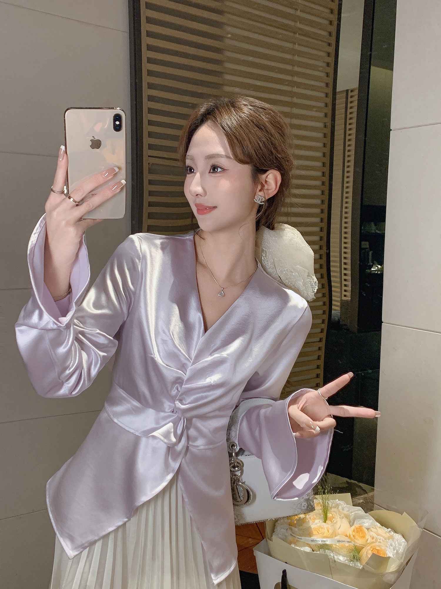 张心子【流光丝滑】春款V领褶皱醋酸气质显瘦上衣 U2502050