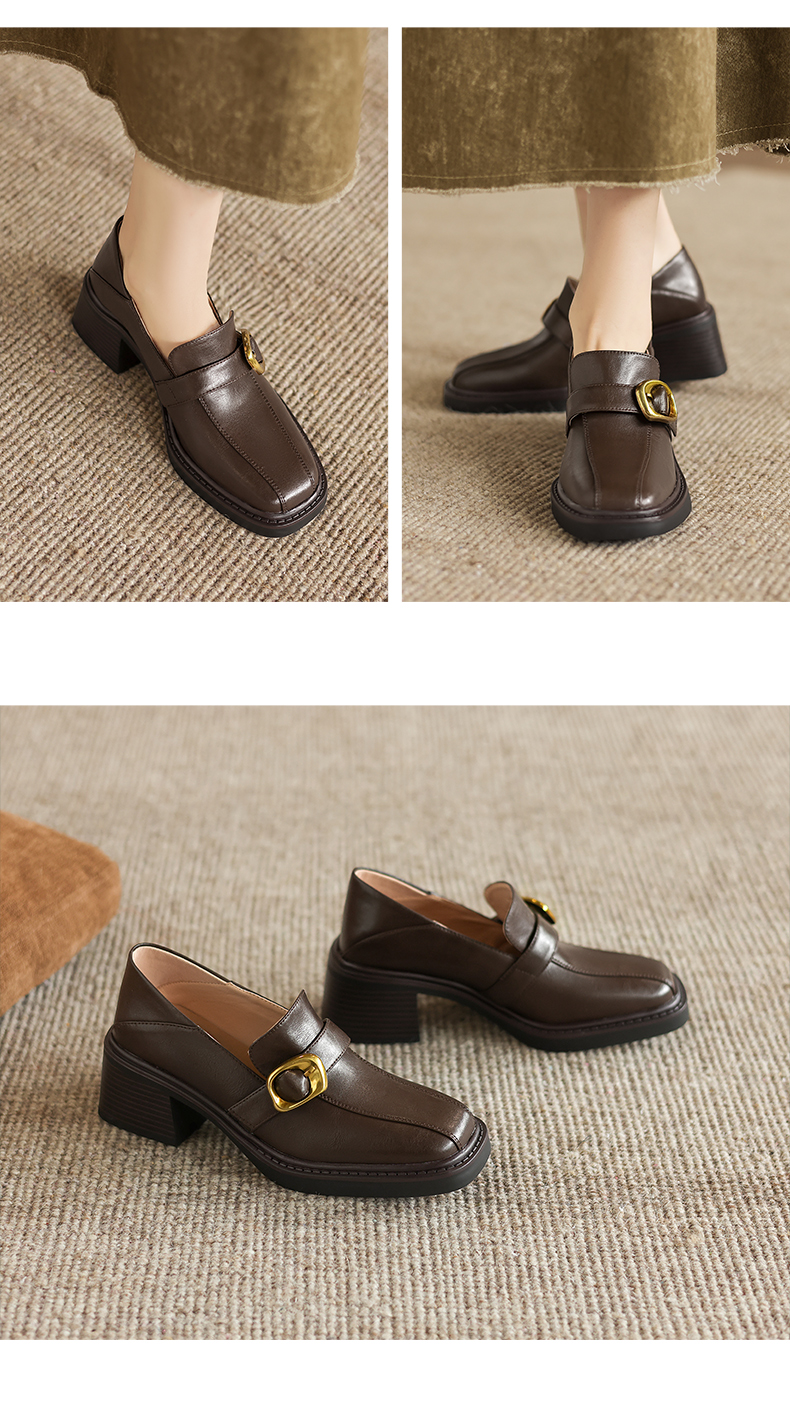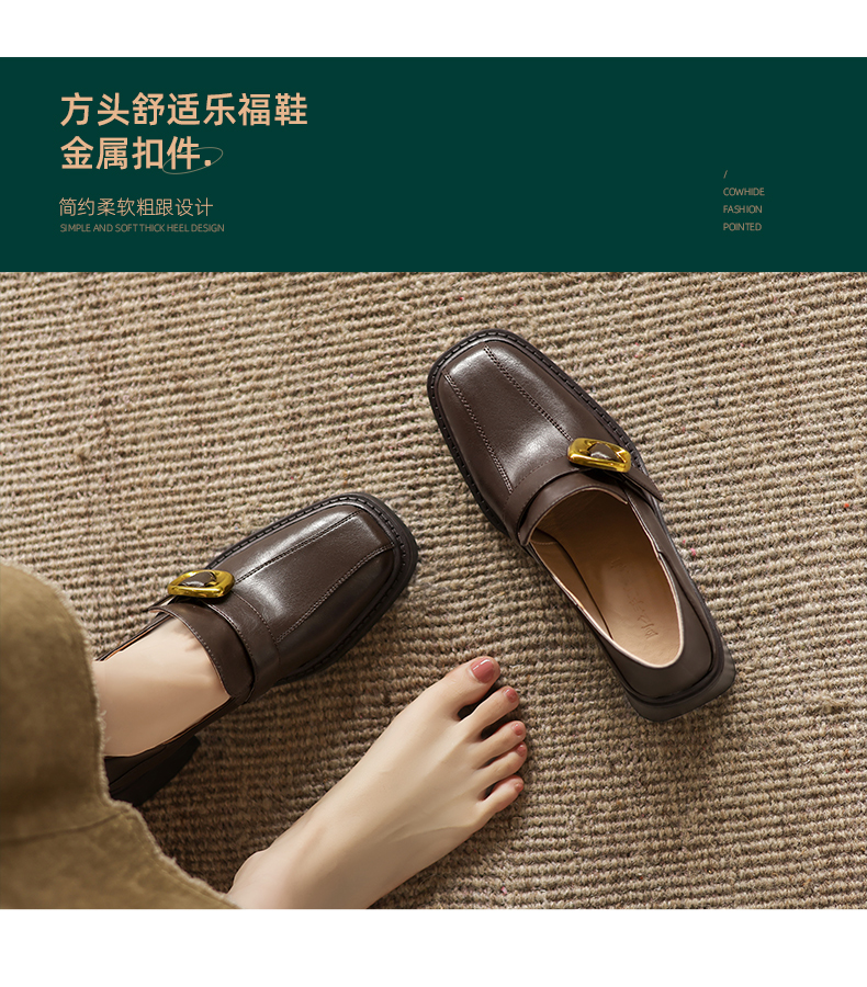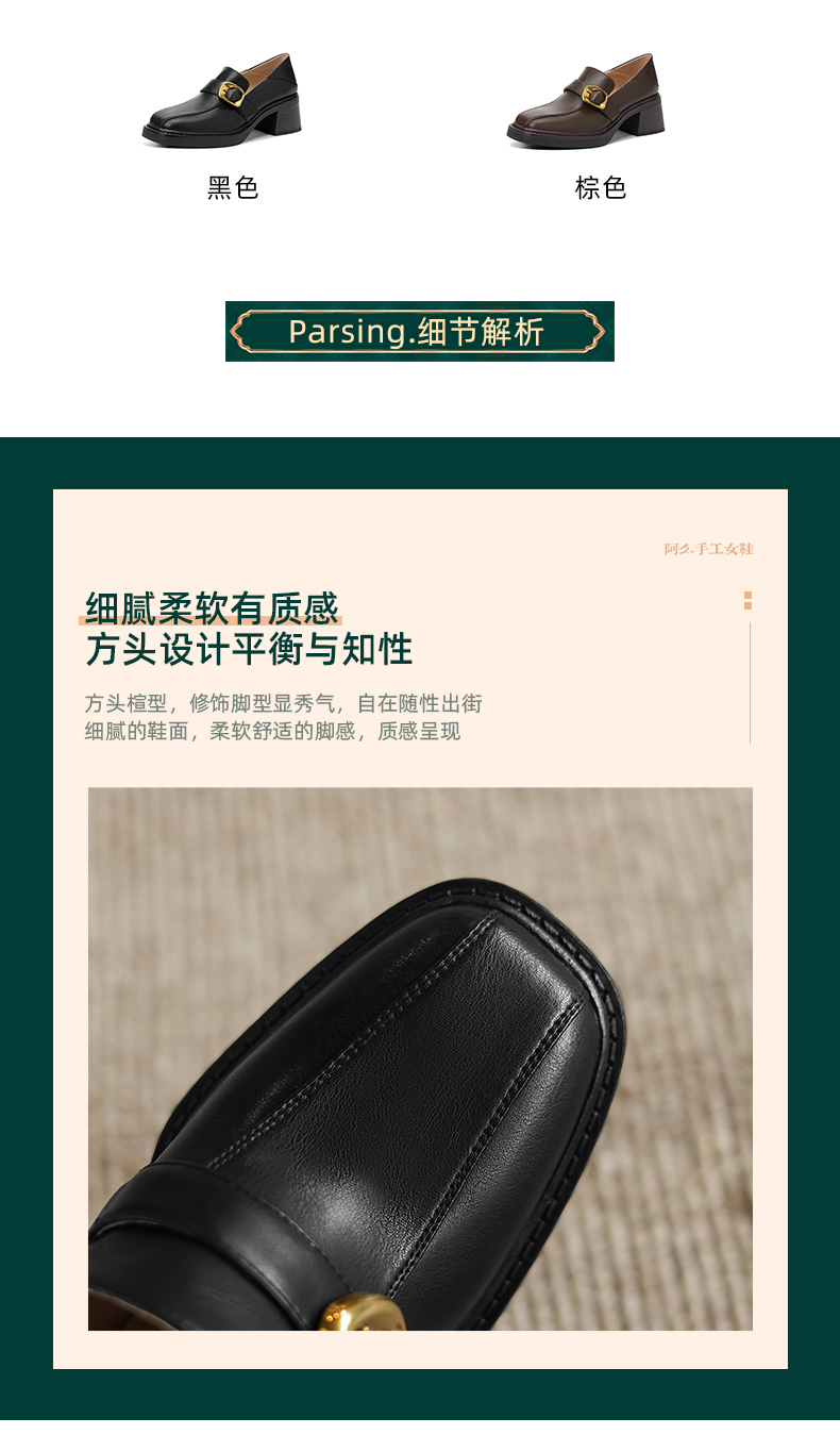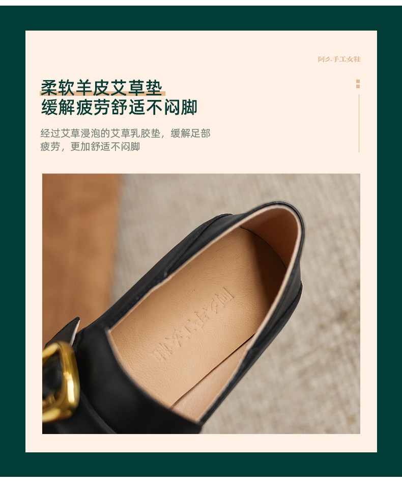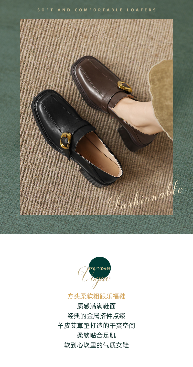 阿么手工女鞋纯色粗跟春季乐福鞋洋气一脚蹬软底真皮方头单鞋6CM