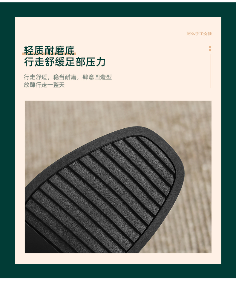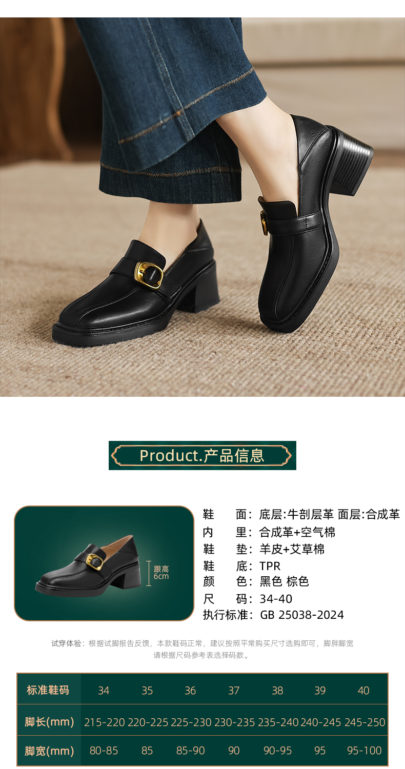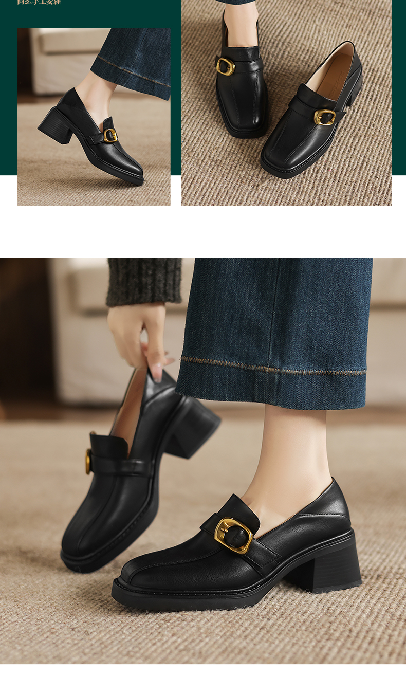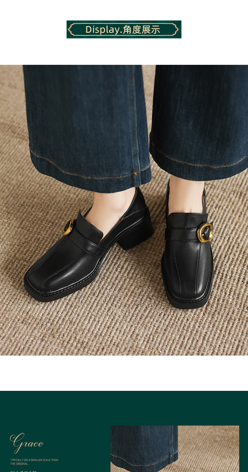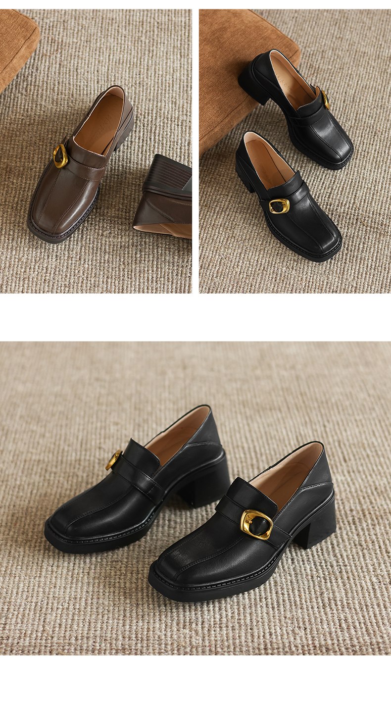 阿么手工女鞋纯色粗跟春季乐福鞋洋气一脚蹬软底真皮方头单鞋6CM