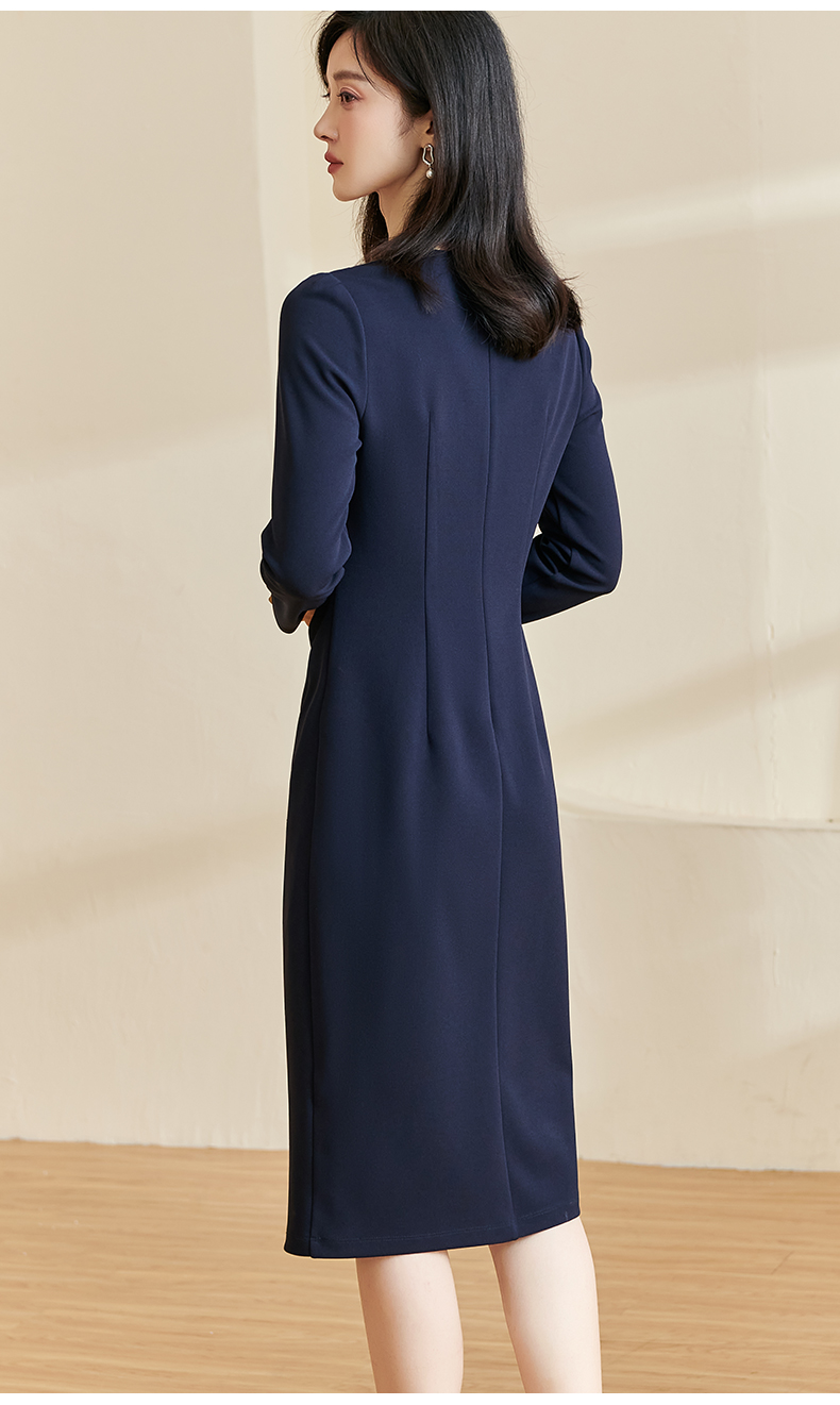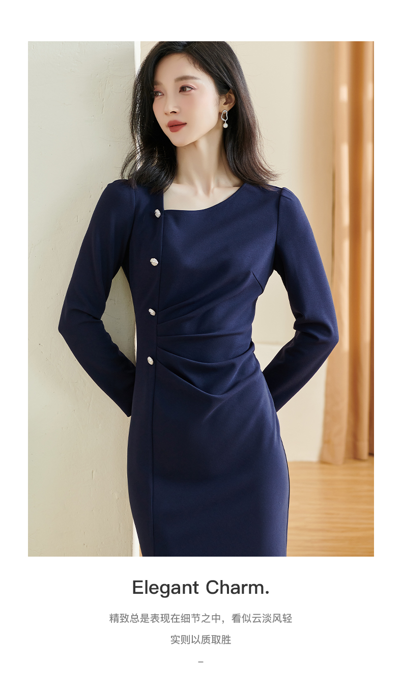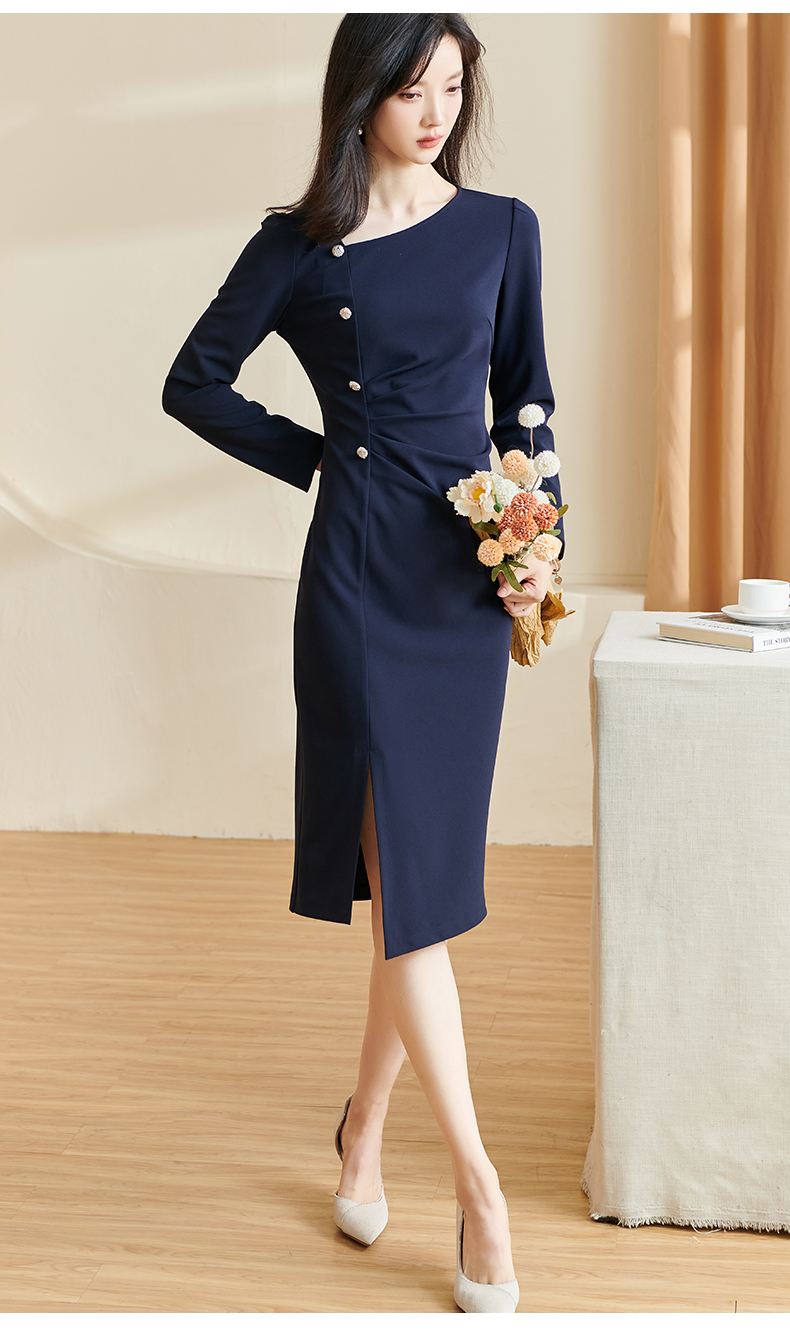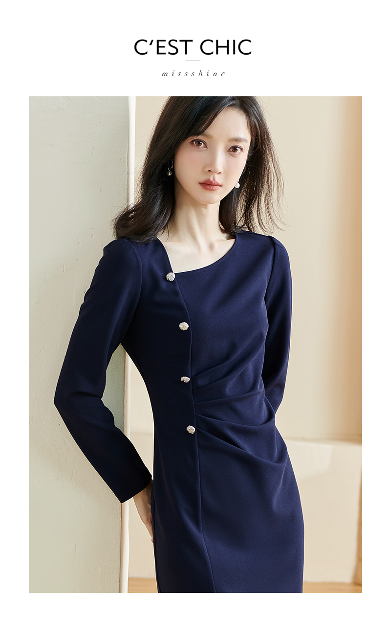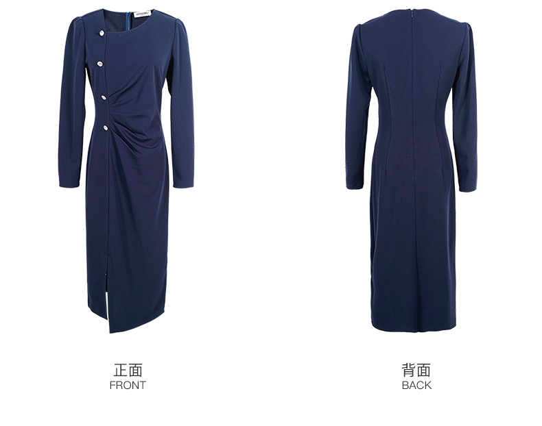 剩S/M/L 米思阳2026春季新款气质优雅净色连衣裙纽扣褶皱开叉长袖裙子2401