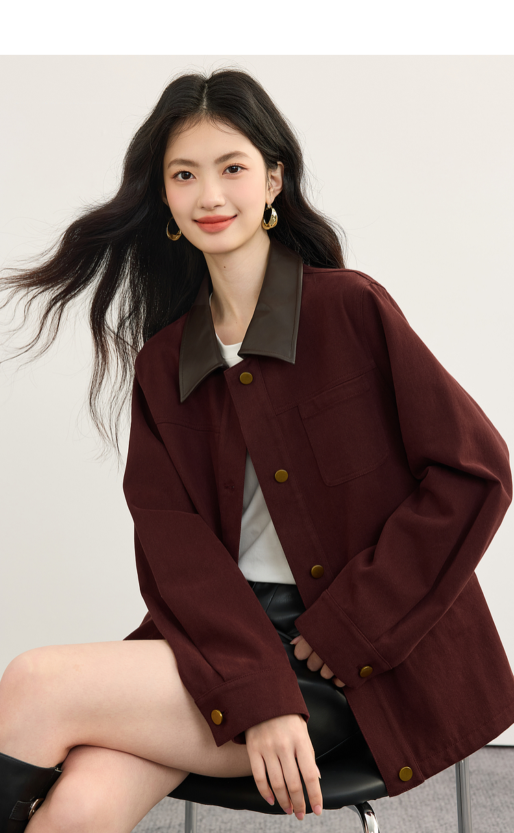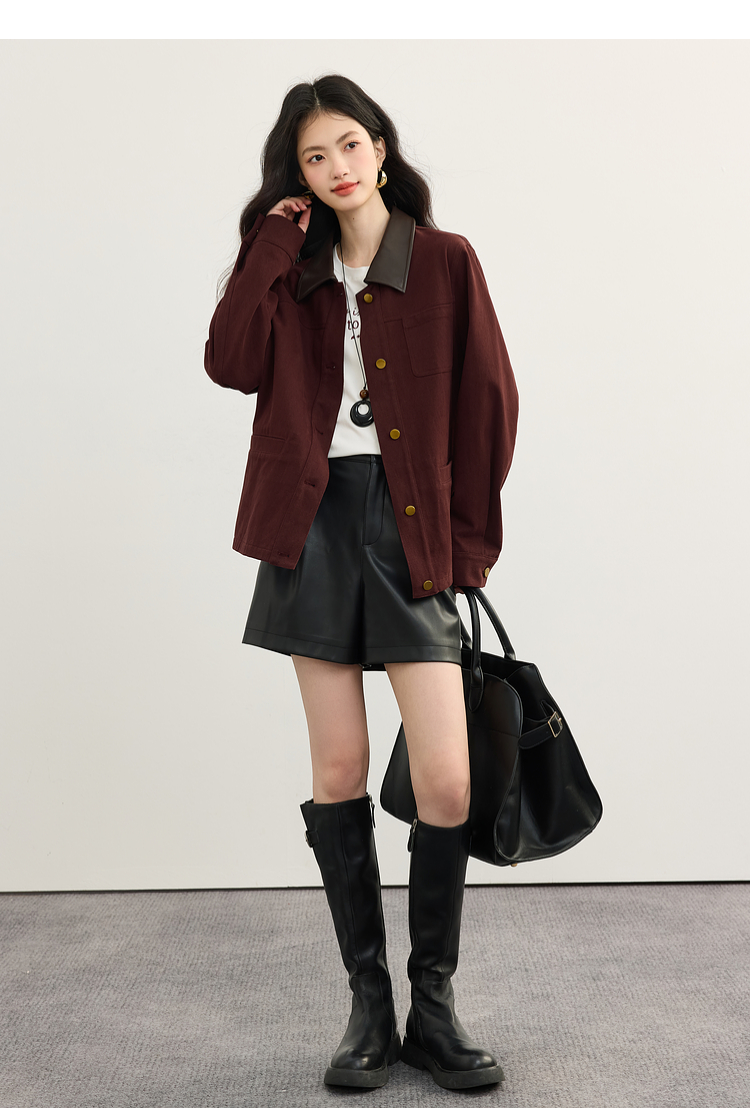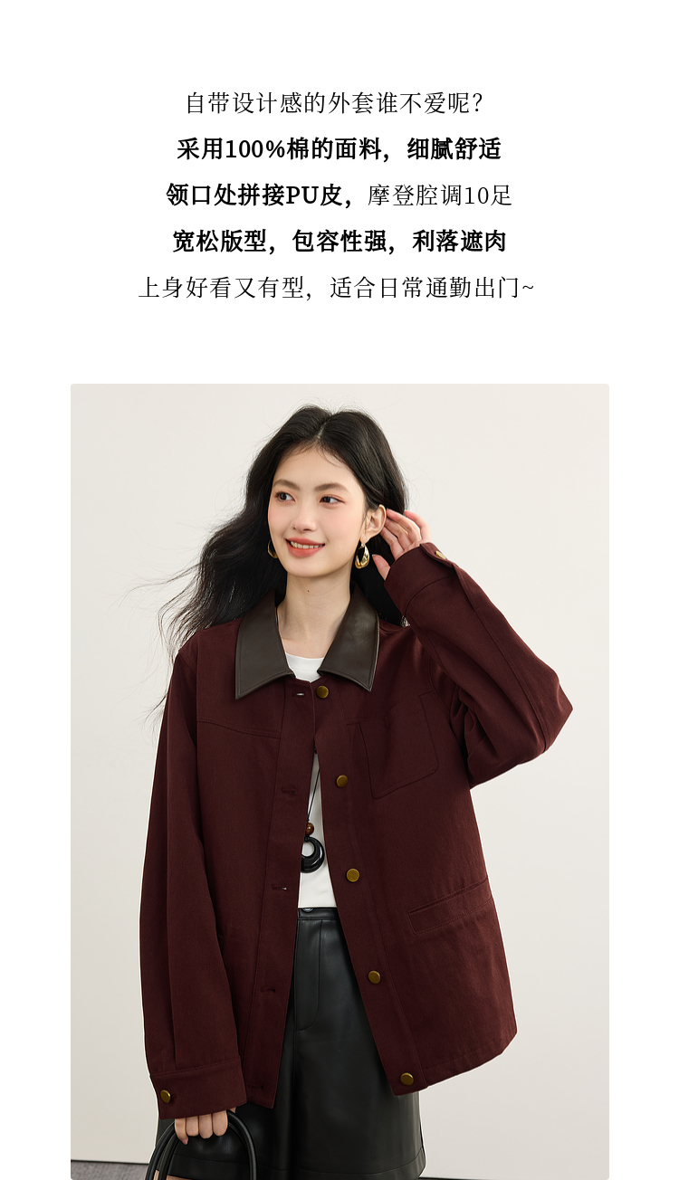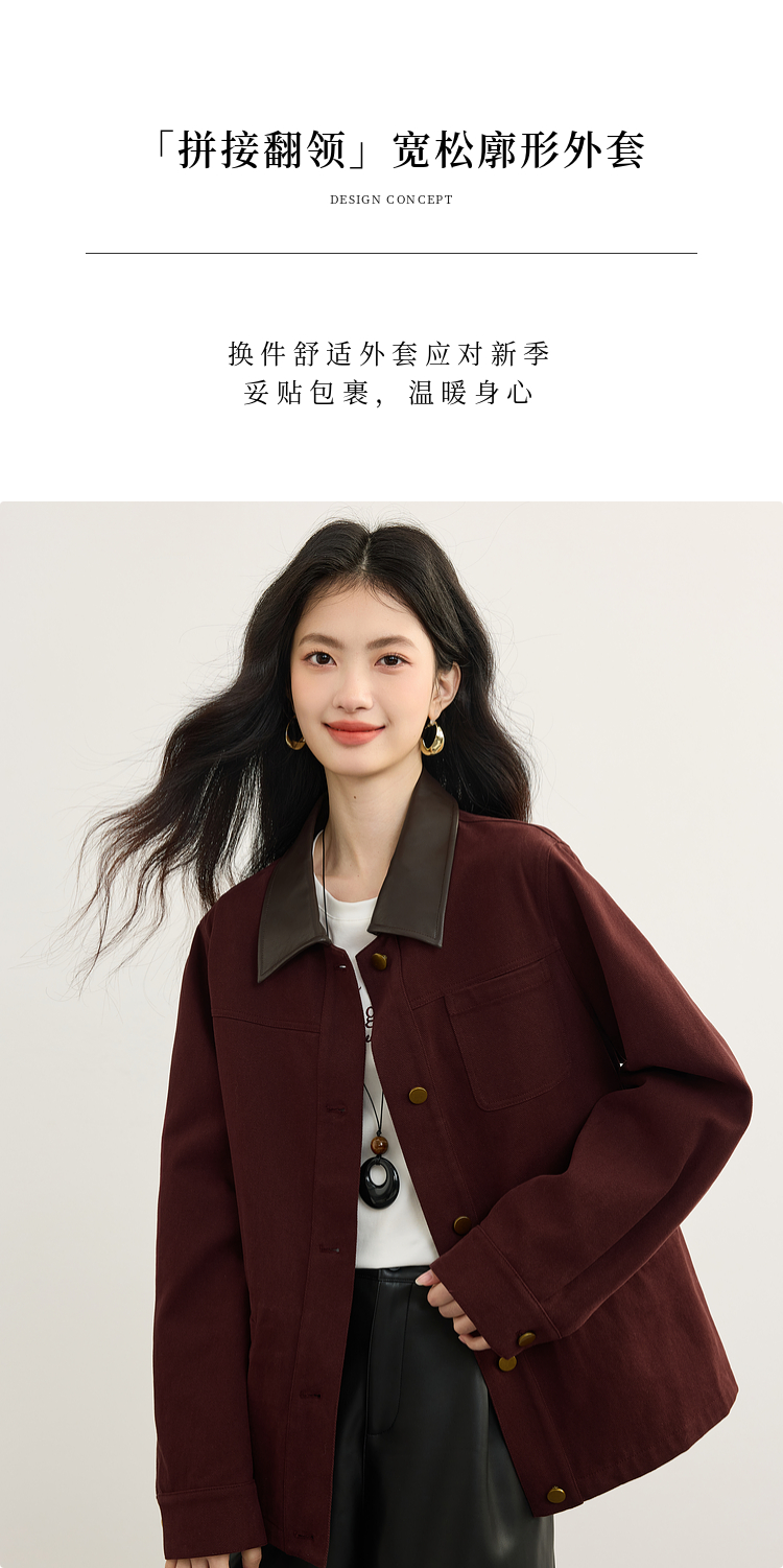 【09/03新品】熙世界复古撞色PU皮翻领外套女2025秋新款工装风夹克宽松休闲上衣