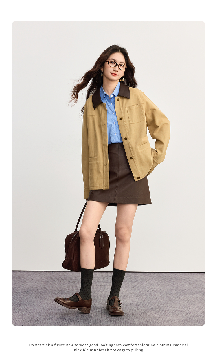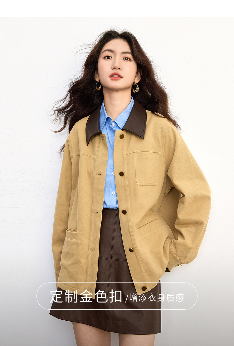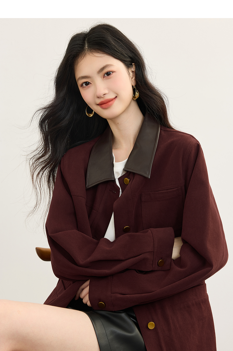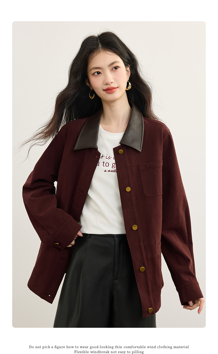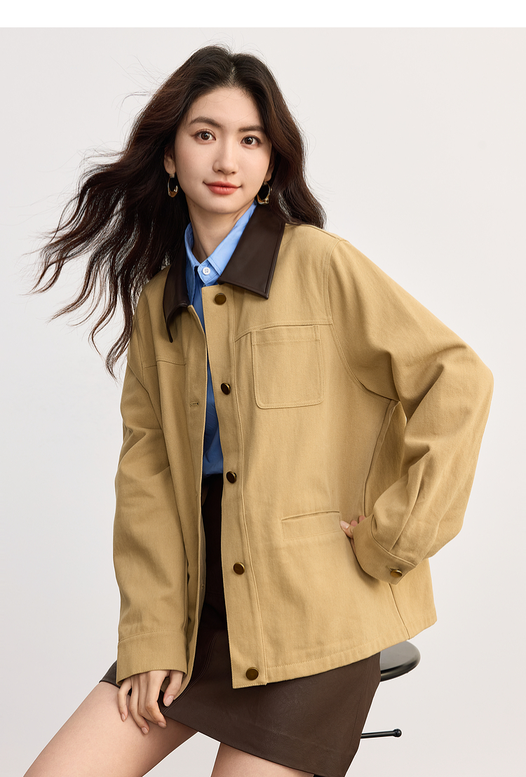 【09/03新品】熙世界复古撞色PU皮翻领外套女2025秋新款工装风夹克宽松休闲上衣
