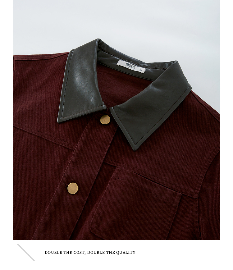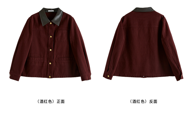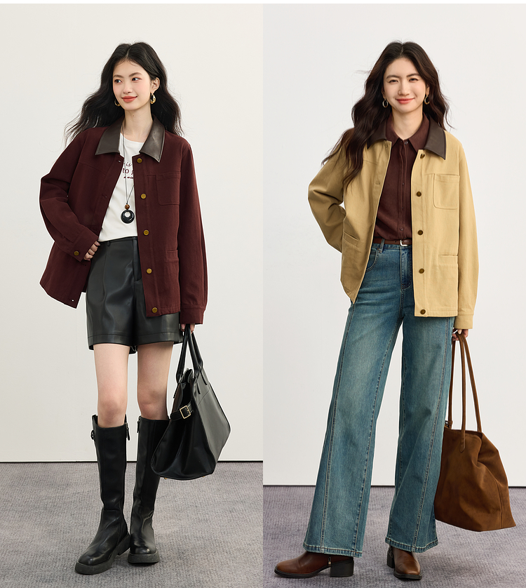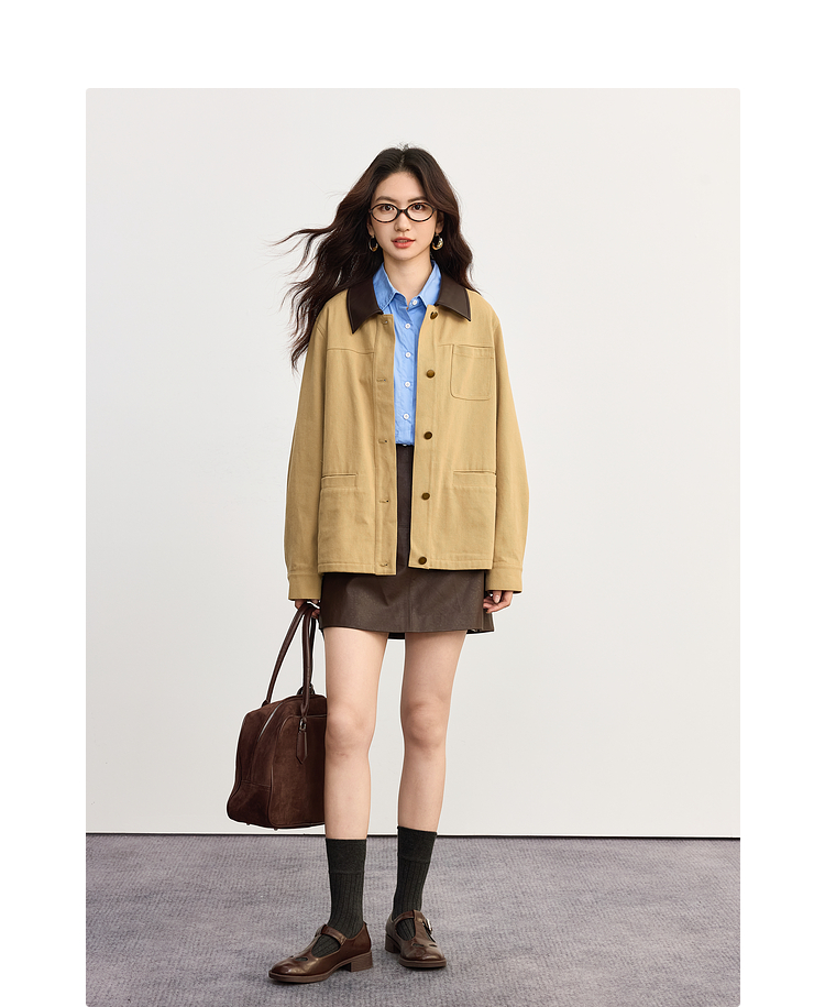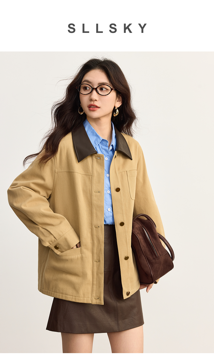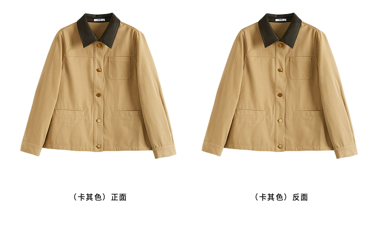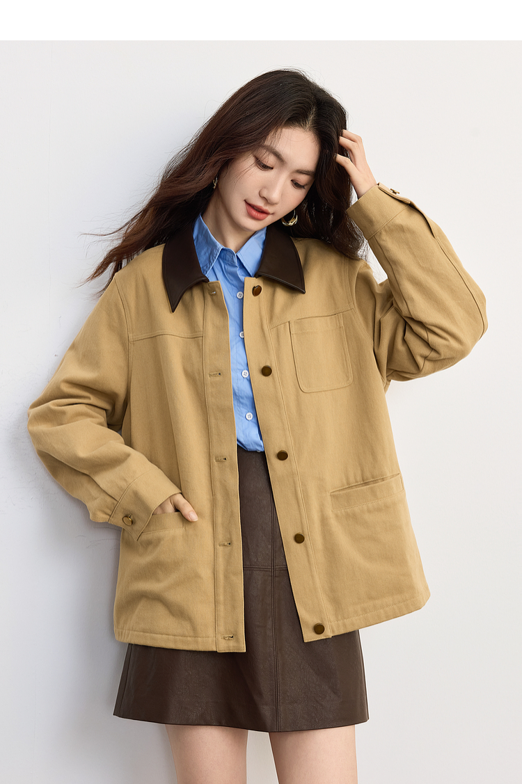 【09/03新品】熙世界复古撞色PU皮翻领外套女2025秋新款工装风夹克宽松休闲上衣