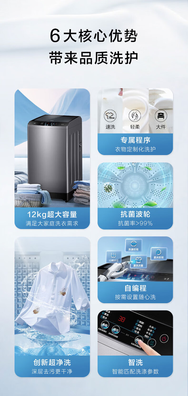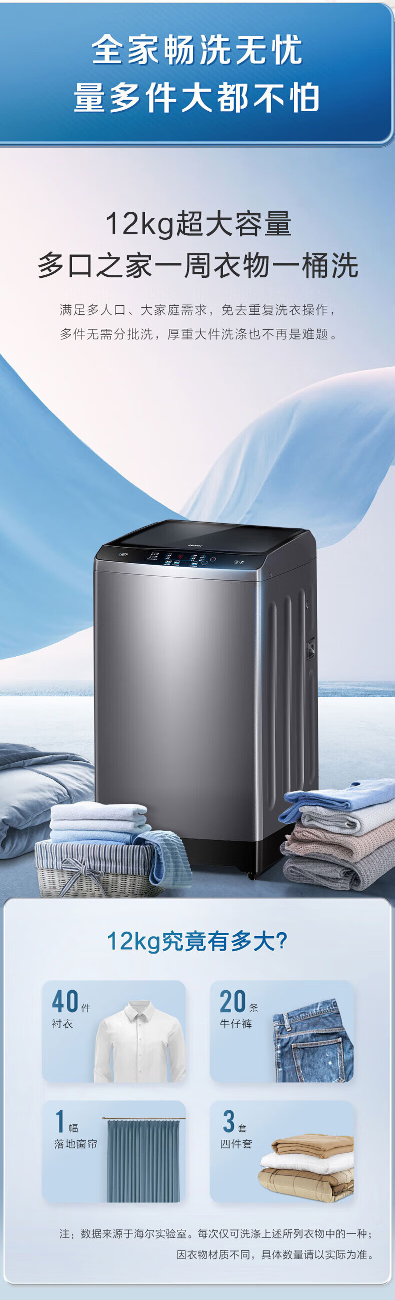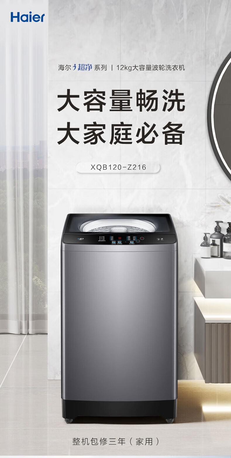 海尔(Haier)波轮洗衣机全自动12公斤大容量直驱变频家用超净洗大件洗 桶自洁 阻尼玻璃门盖 国家政府补贴 12公斤Z216超净洗洗净比1.1(超净洗)+羊毛洗+桶自洁