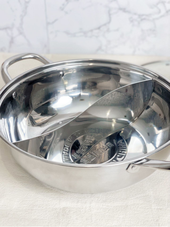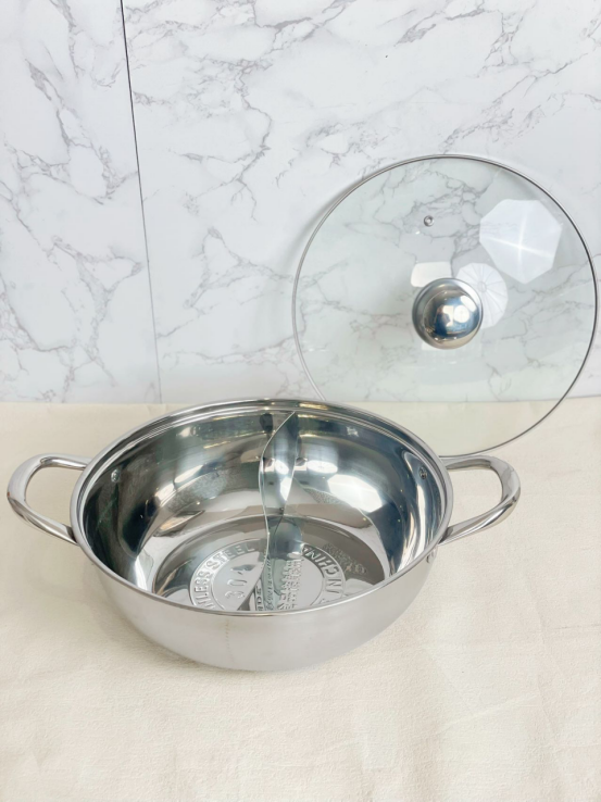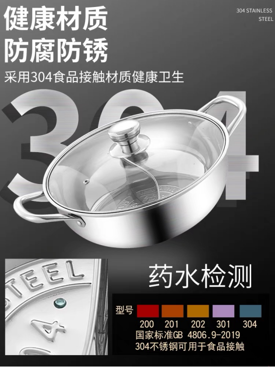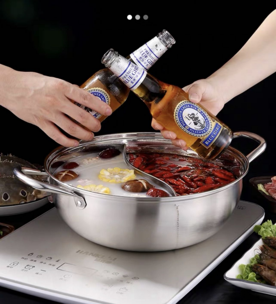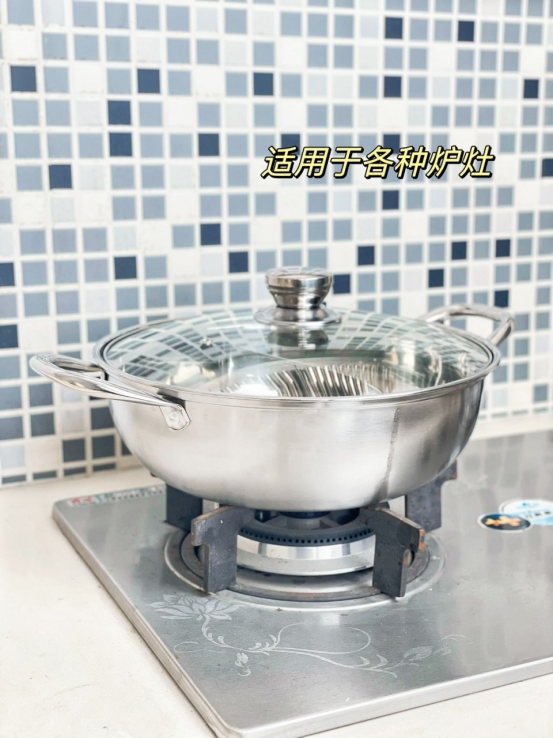一眼看去就很好的锅~ 选用304不锈钢材质 是真的看到就很想下厨的汤锅了!! ✅304不锈钢材,安全放心 选用的是304不锈钢材 健康无涂层,坚固耐用 锅外高档哑光设计,锅内镜面 精细抛光,明亮如镜,方便清洗 ✅防滴漏设计 锅沿精细打磨防滴漏 防溢加高隔层,有效阻 挡沸腾火锅喷喷溅的清况 防止汤汁滴漏流到锅外壁 ✅一锅两味 精密激光点焊工艺 不串味、不渗汤 一边放凊汤卤:清鲜味醇 保留食材的原汁原味 一边放红汤卤:麻辣爽口 适合热情豪放的你 ✅可视化锅盖 可视化锅盖,料理看得见 美食全掌握,美味不用久等 高透度防爆玻璃,耐高温 不易炸,安全最可靠 ✅大容量口径 锅身大容量设计 可以满足1-8人的饭量需要 小家庭、亲友聚餐,都能满足 还可以满足解决众口难调问题 ✅更多设计 不挑炉灶,多种炉具适用 中空手柄:隔热防烫 铆钉加固:不易松动 我不知道有什么理由错过它!!!