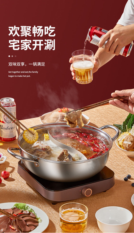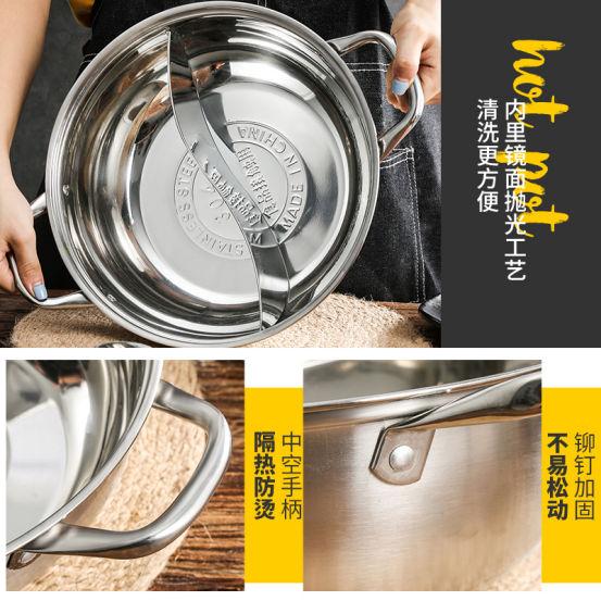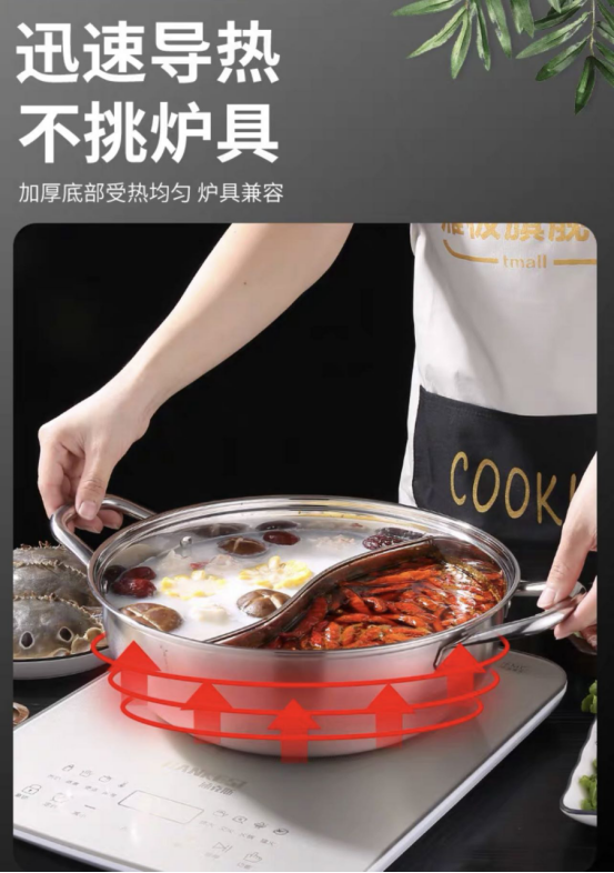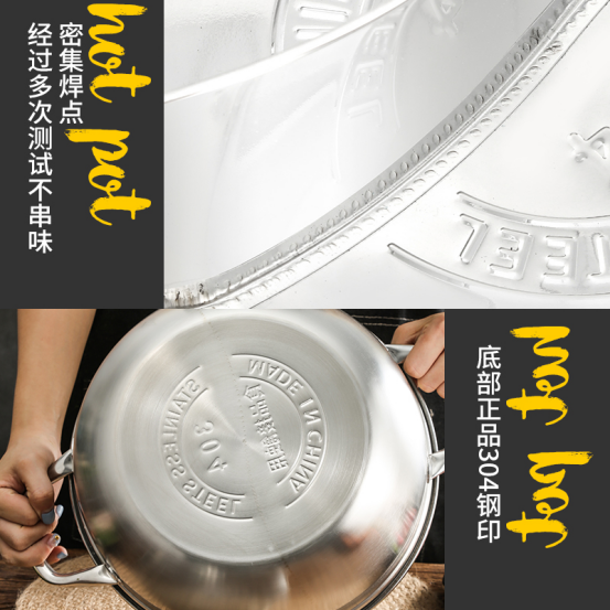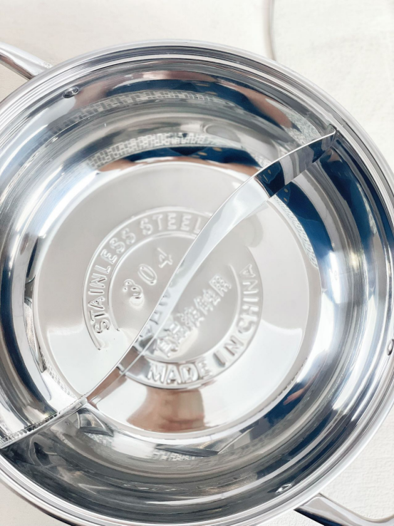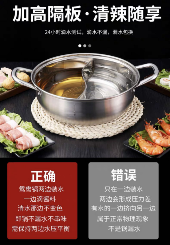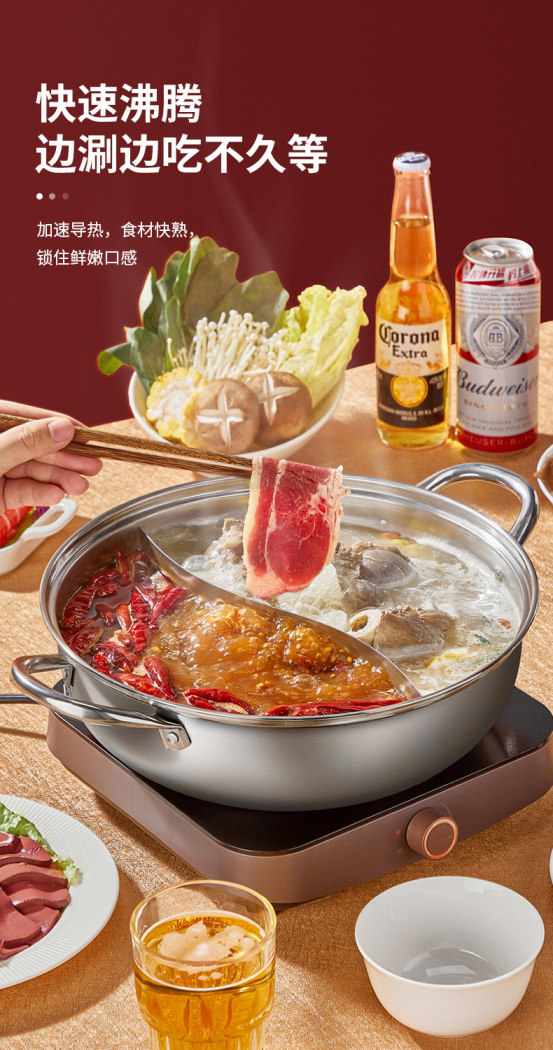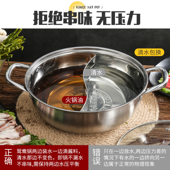 ▫健康304不锈钢,麻辣酸爽都不怕 不同于普通鸳鸯锅,这款鸳鸯锅采用304不锈钢材质,耐高温耐腐蚀,不惧酸辣,久煮也放心