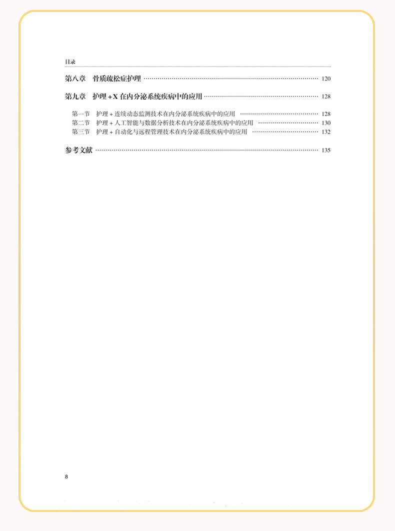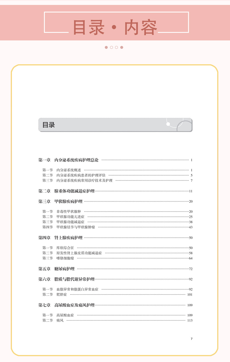 第一章 内分泌系统疾病护理总论/ 1 第一节 内分泌系统概述/ 1 第二节 内分泌系统疾病患者的护理评估/ 5 第三节 内分泌系统疾病常用诊疗技术及护理/ 7 第二章 腺垂体功能减退症护理/11 第三章 甲状腺疾病护理/20 第一节 非毒性甲状腺肿/20 第二节 甲状腺功能亢进症/25 第三节 甲状腺功能减退症/38 第四节 甲状腺结节与甲状腺肿瘤/43 第四章 肾上腺疾病护理/50 第一节 库欣综合征/50 第二节 原发性肾上腺皮质功能减退症/58 第三节 嗜铬细胞瘤/64 第五章 糖尿病护理/72 第六章 脂质与脂代谢异常护理/92 第一节 血脂异常和脂蛋白异常血症/92 第二节 肥胖症/ 101 第七章 高尿酸血症及痛风护理/ 109 第一节 高尿酸血症/ 109 第二节 痛风/ 113 第八章 骨质疏松症护理/ 120 第九章 护理+ X 在内分泌系统疾病中的应用/ 128 第一节 护理+ 连续动态监测技术在内分泌系统疾病中的应用/ 128 第二节 护理+ 人工智能与数据分析技术在内分泌系统疾病中的应用/ 130 第三节 护理+ 自动化与远程管理技术在内分泌系统疾病中的应用/ 132 参考文献/ 135