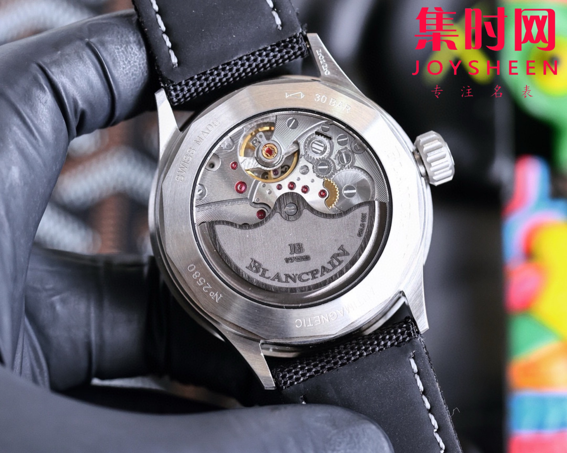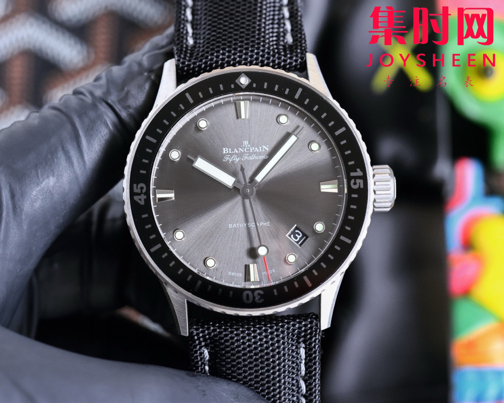 宝珀五十寻系列 男士腕表 表径43.6mm 三针男表 光泽亮丽、高硬度、不变色、不沾污、不易磨损。表壳:牙圈对版,立体感强!手感爽滑且不伤肌肤。表冠(表把)刻字工整