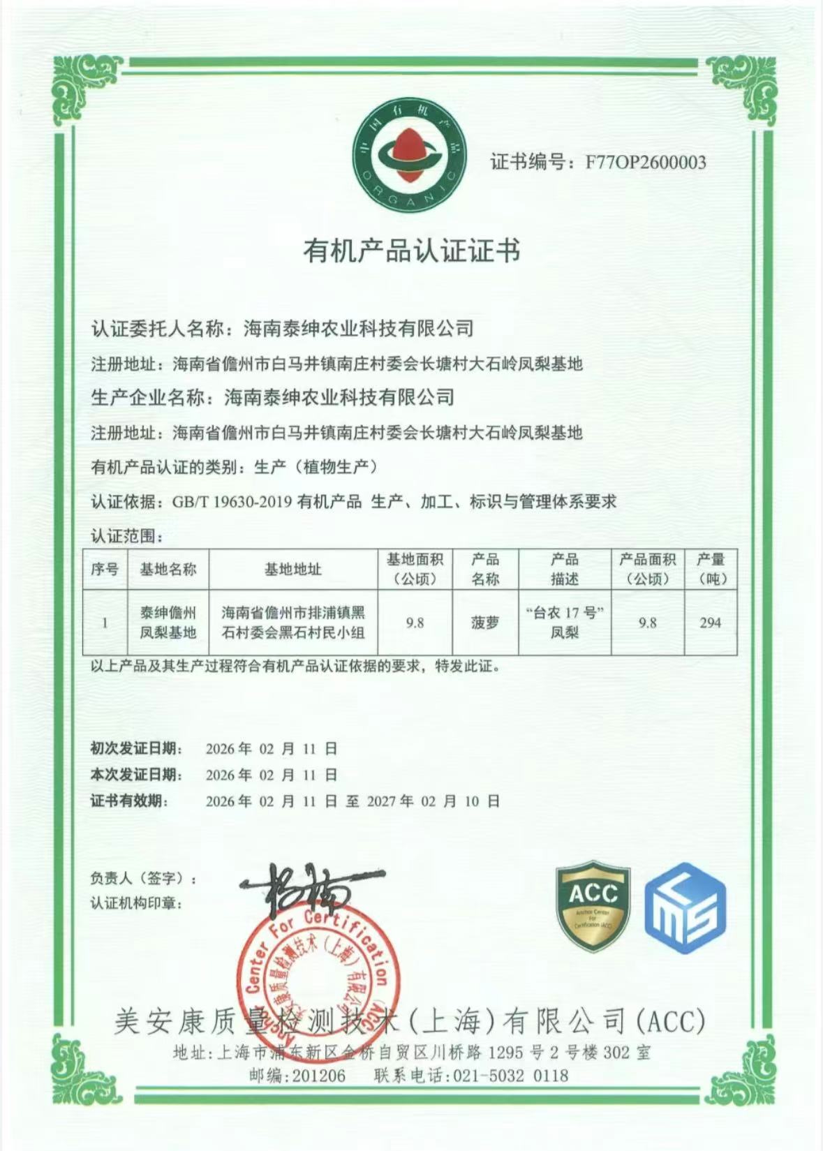 生款款凤梨有:508农残0检出报告+良好农业规范认证证书