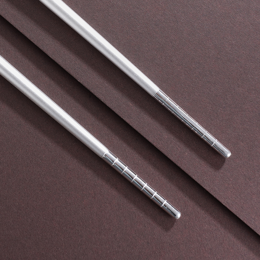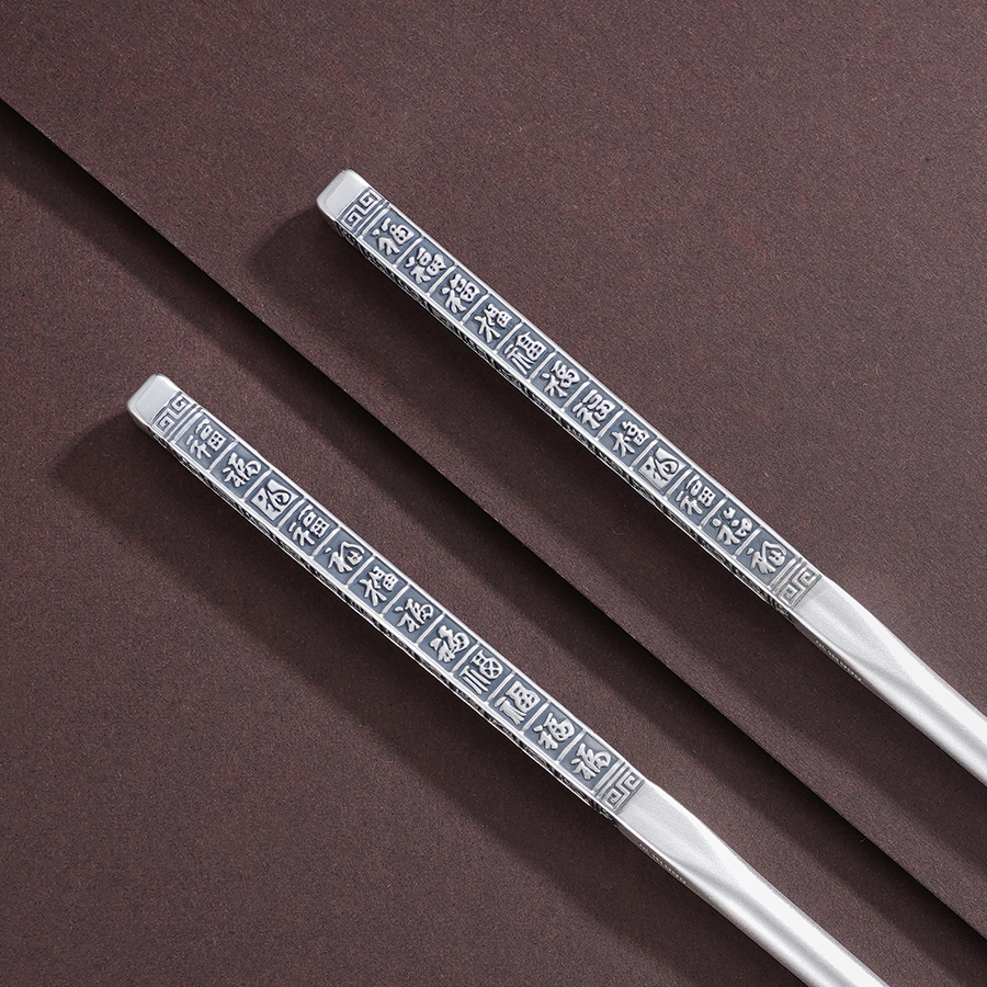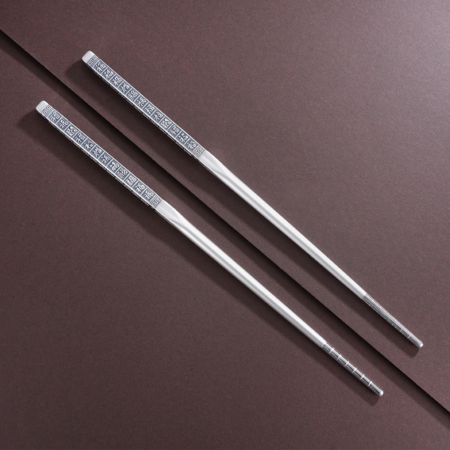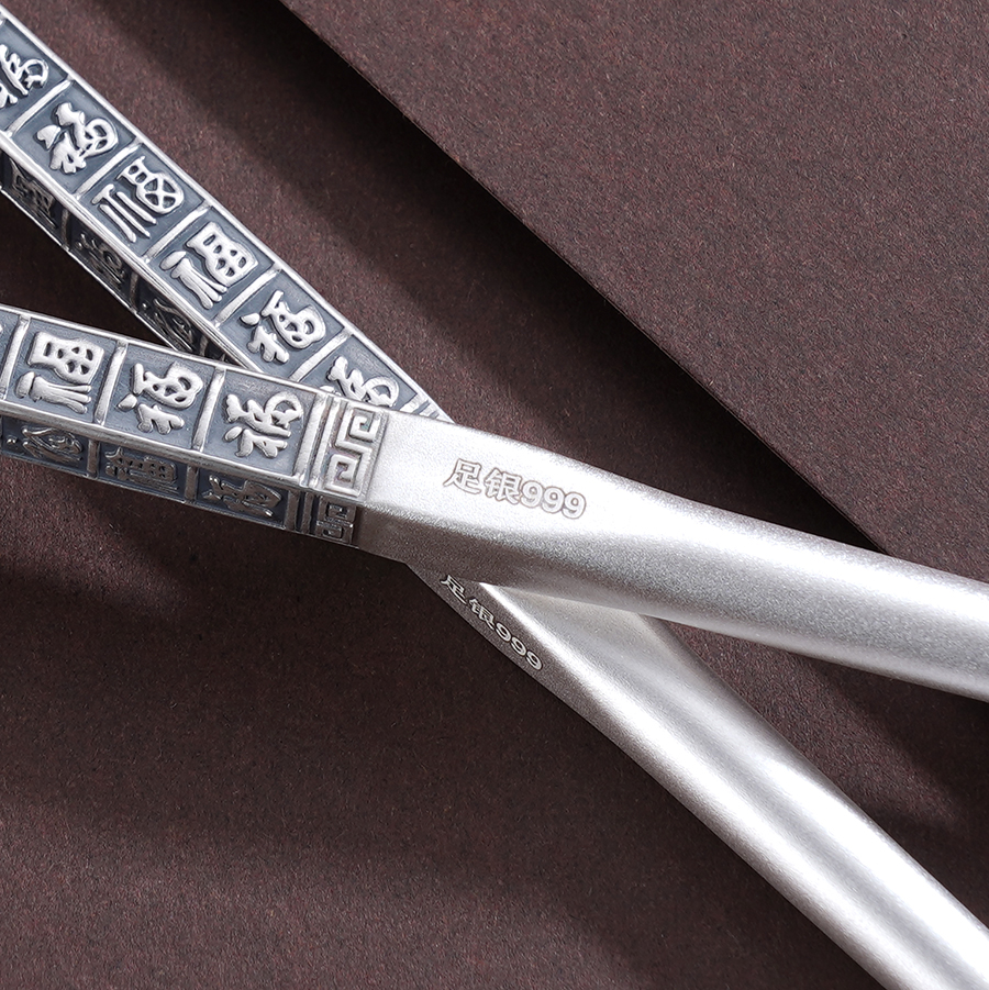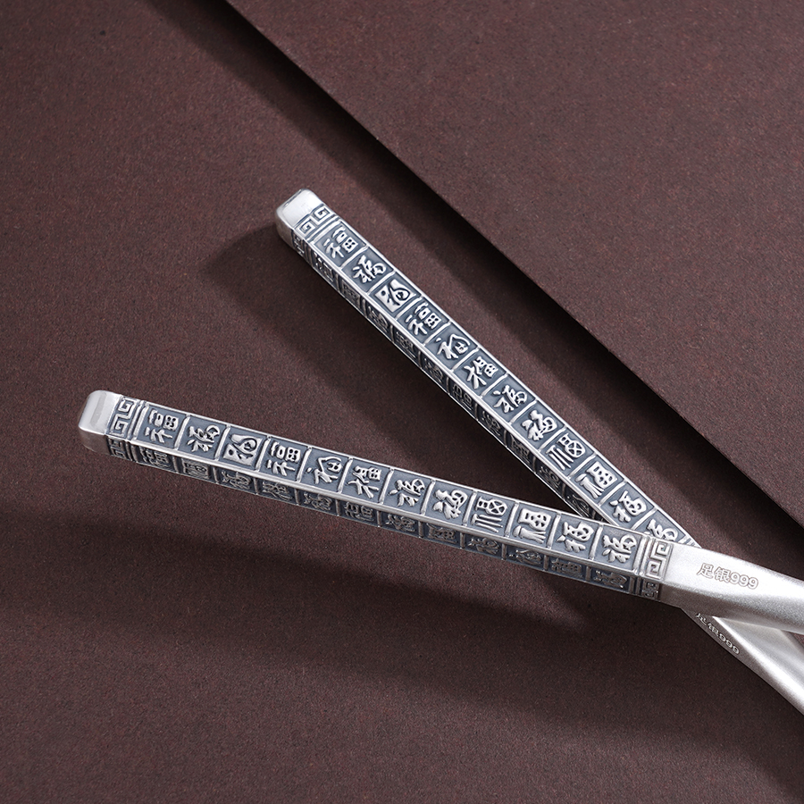 【寓意】:作品以足银材质打造,应用浮雕工艺于筷子头之处雕琢福字,凸显出有质感的防滑设计,又传递了福顺安宁的美好寓意。