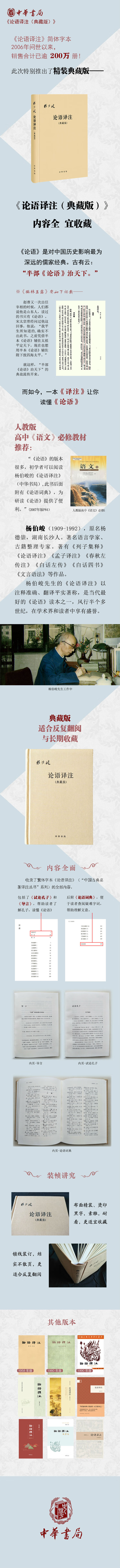 本书是杨伯峻先生《论语译注》(简体字本)的一个扩充版,增加了原来简体字本没有排而原来繁体字本有的《试论孔子》、导言、例言、《论语词典》等,使读者得见简体字本杨伯峻《论语译注》的全貌。同时在纸张材料和装帧方式上更考究,具有典藏价值。