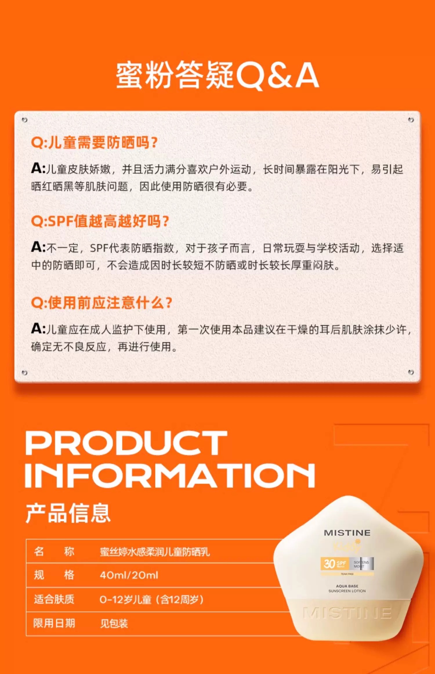 【4.7发货】【外盒瑕疵特卖】蜜丝婷水感舒润儿童防晒乳SPF30 PA++40ml(效期2026.06后)