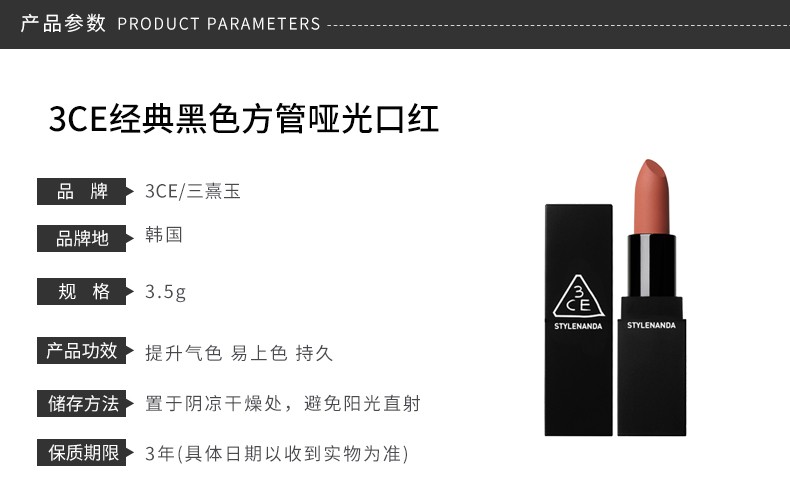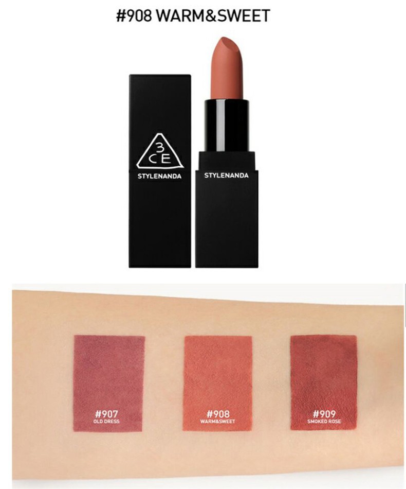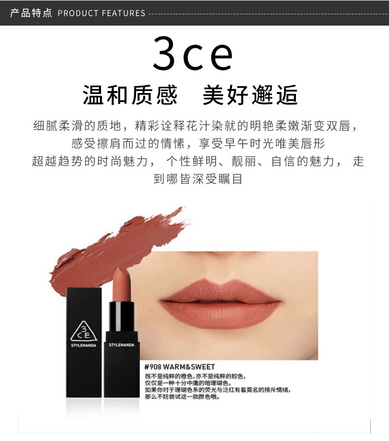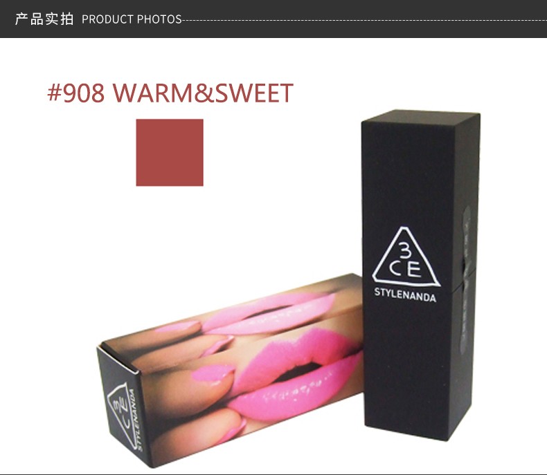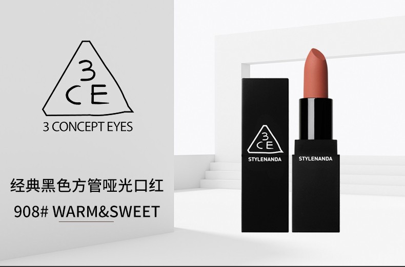 3CE 经典黑管方管哑光口红 3.5G 908# WARM&SWEET