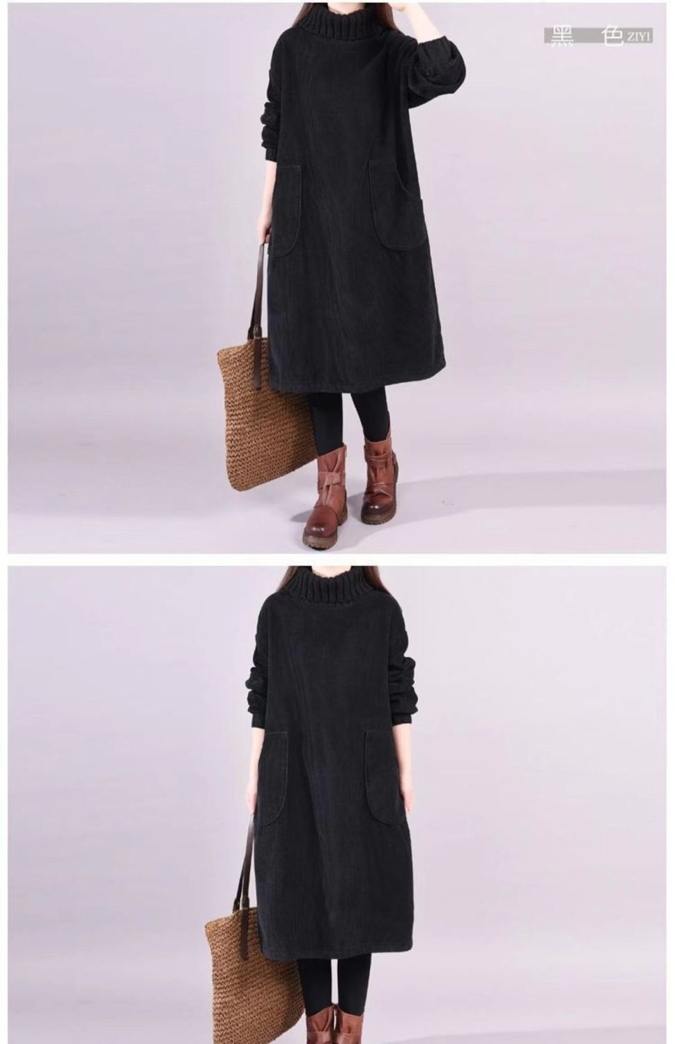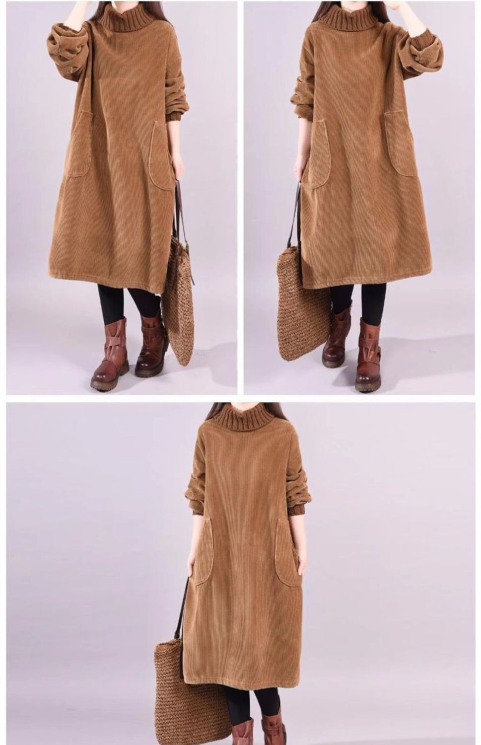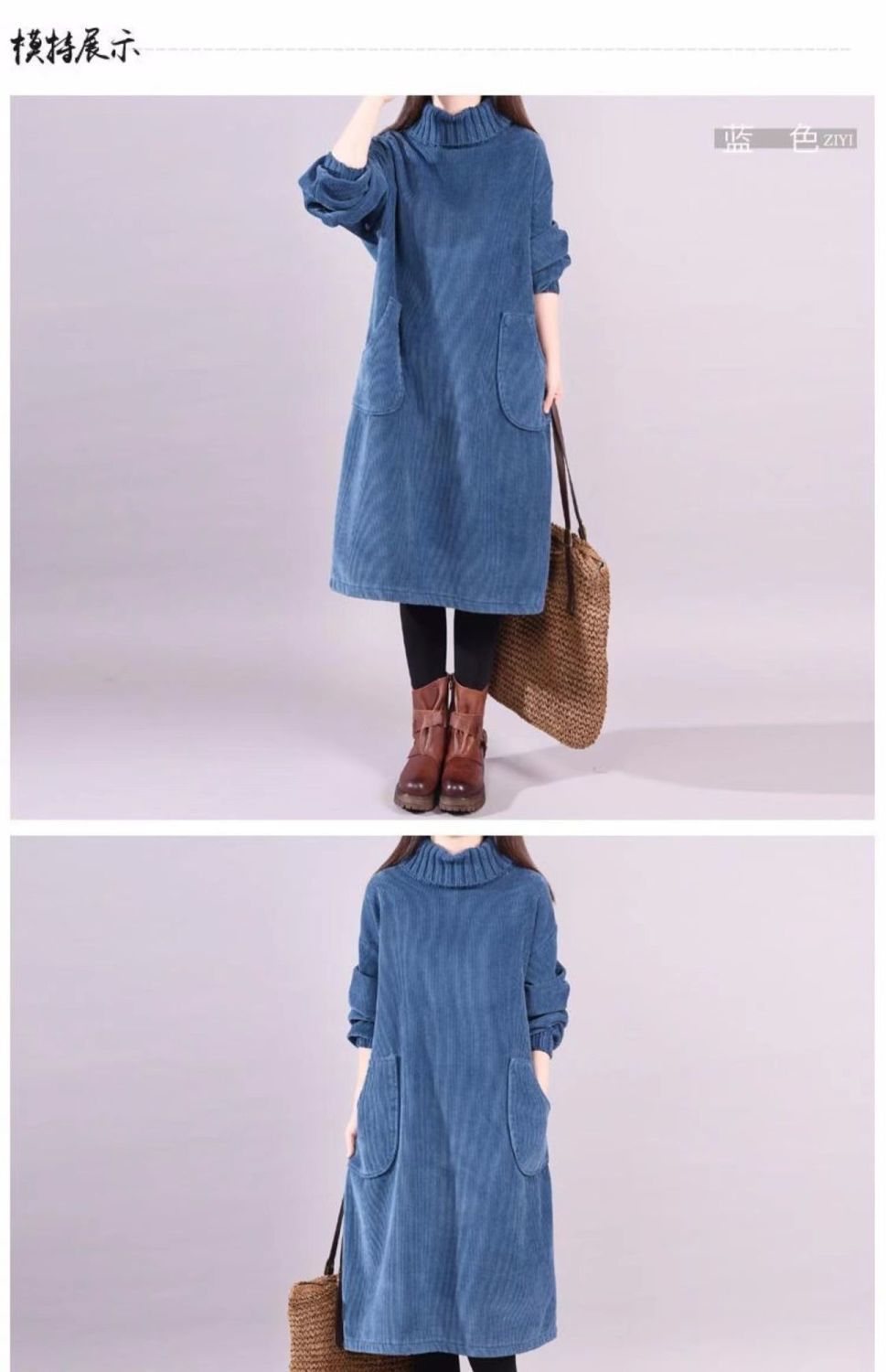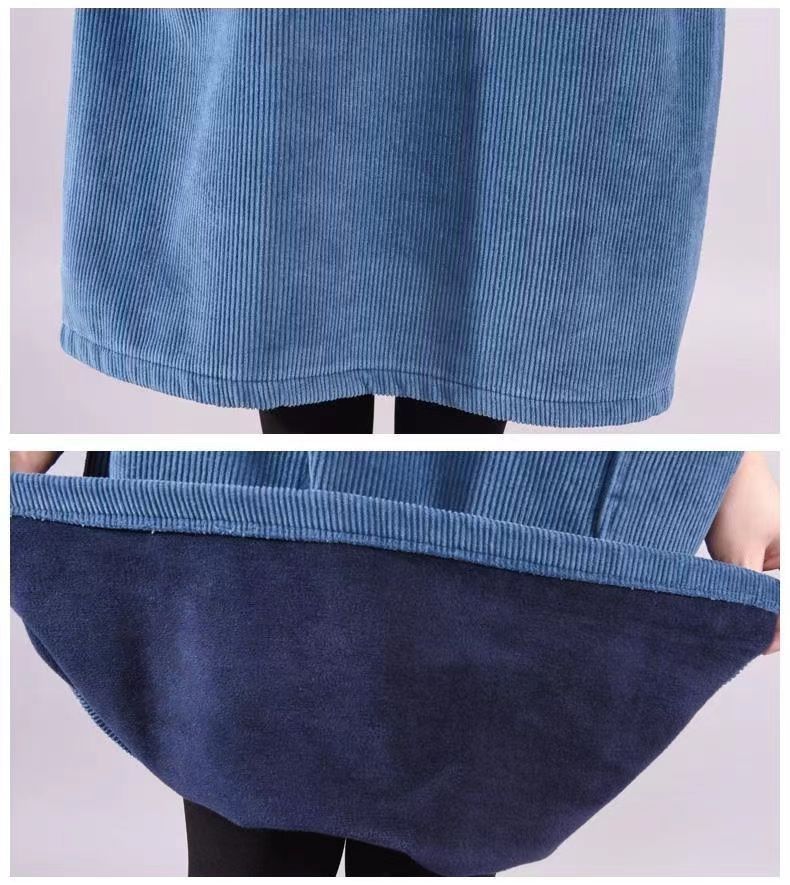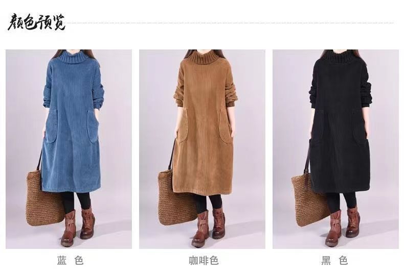 秋冬加绒加厚新款复古灯芯绒高领条绒连衣裙中长款