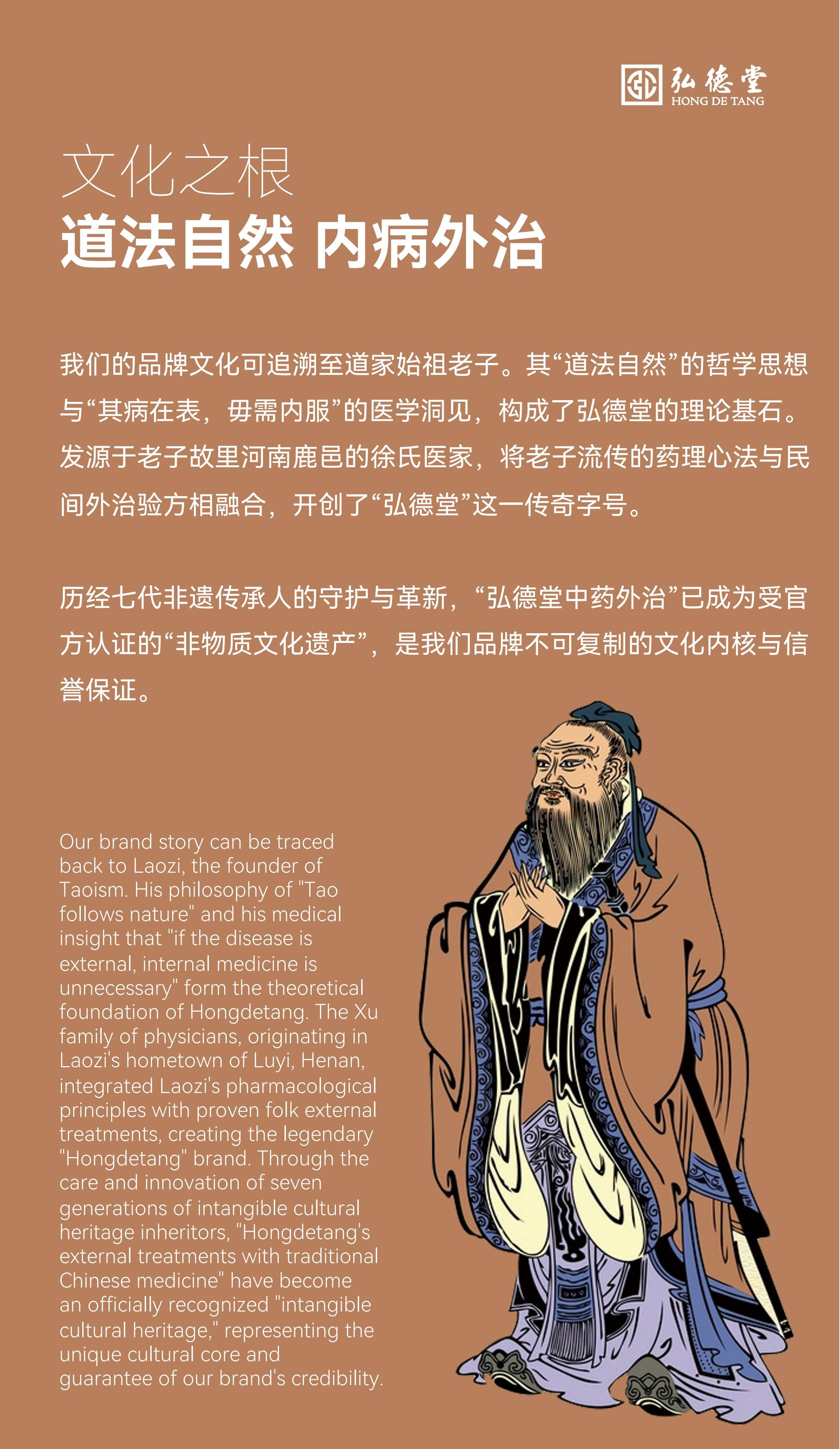 其品牌文化可追溯至道家始祖老子。其“道法自然”的哲学思想!与“其病在表,毋需内服”的医学洞见,构成了弘德堂的理论基石发源于老子故里河南鹿邑的徐氏医家,将老子流传的药理心法与民间外治验方相融合,开创了“弘德堂”这一传奇字号。
